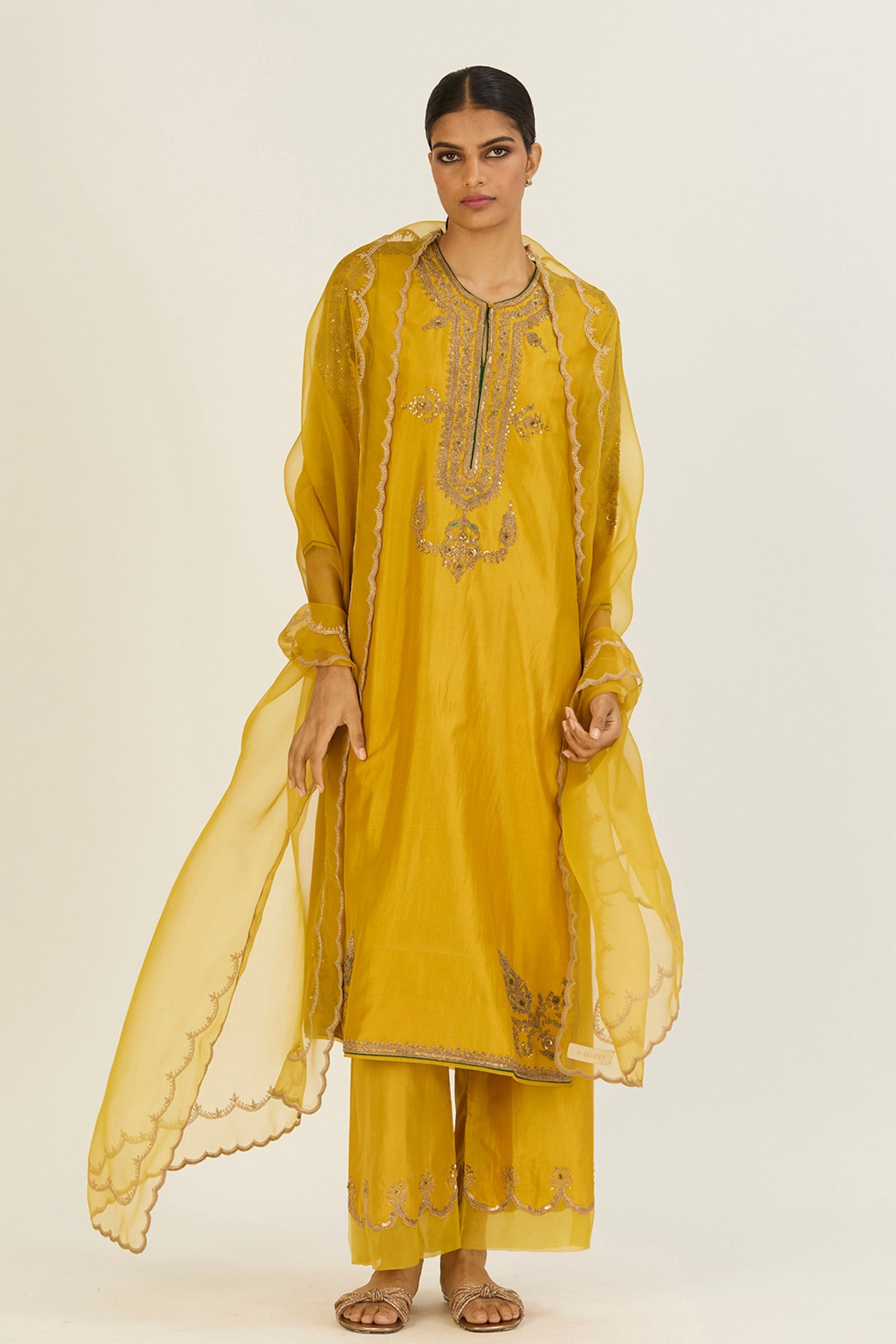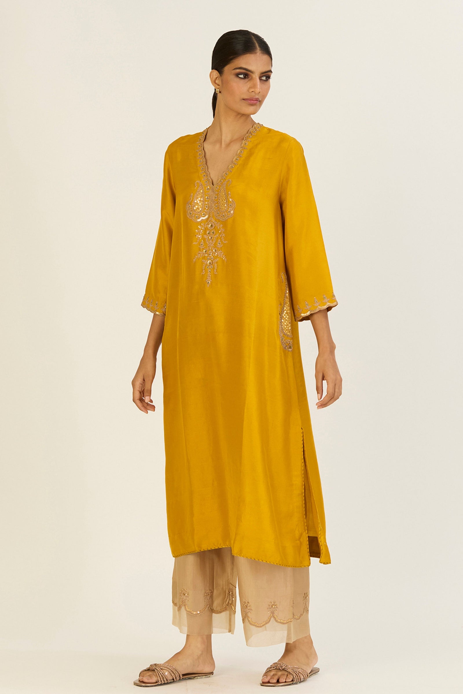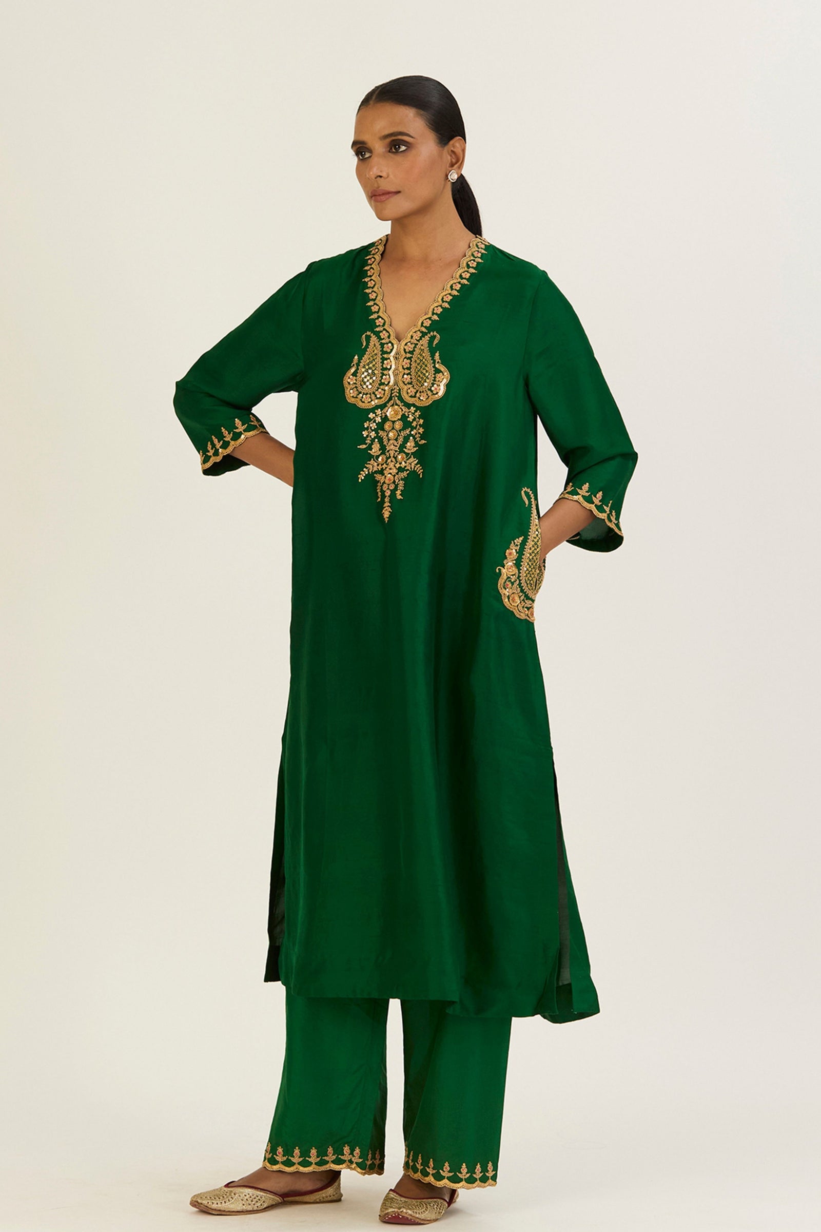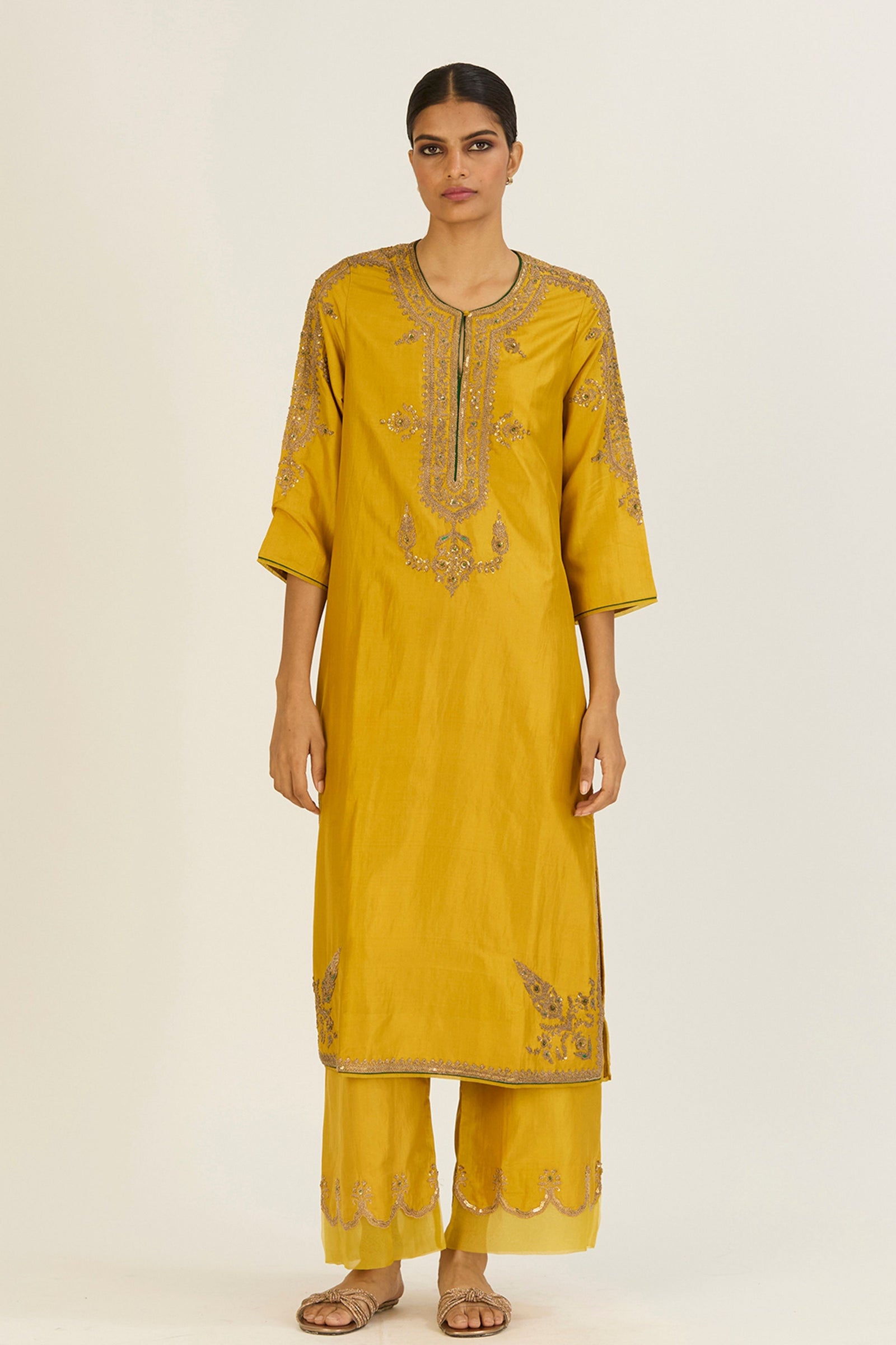 • Brinda kurta is crafted in fine silk. The kurta has marodi embroidered floral yoke, with peacock motifs all over. The silk pant is wide-legged with intricate floral embroidery detailing along the hem.