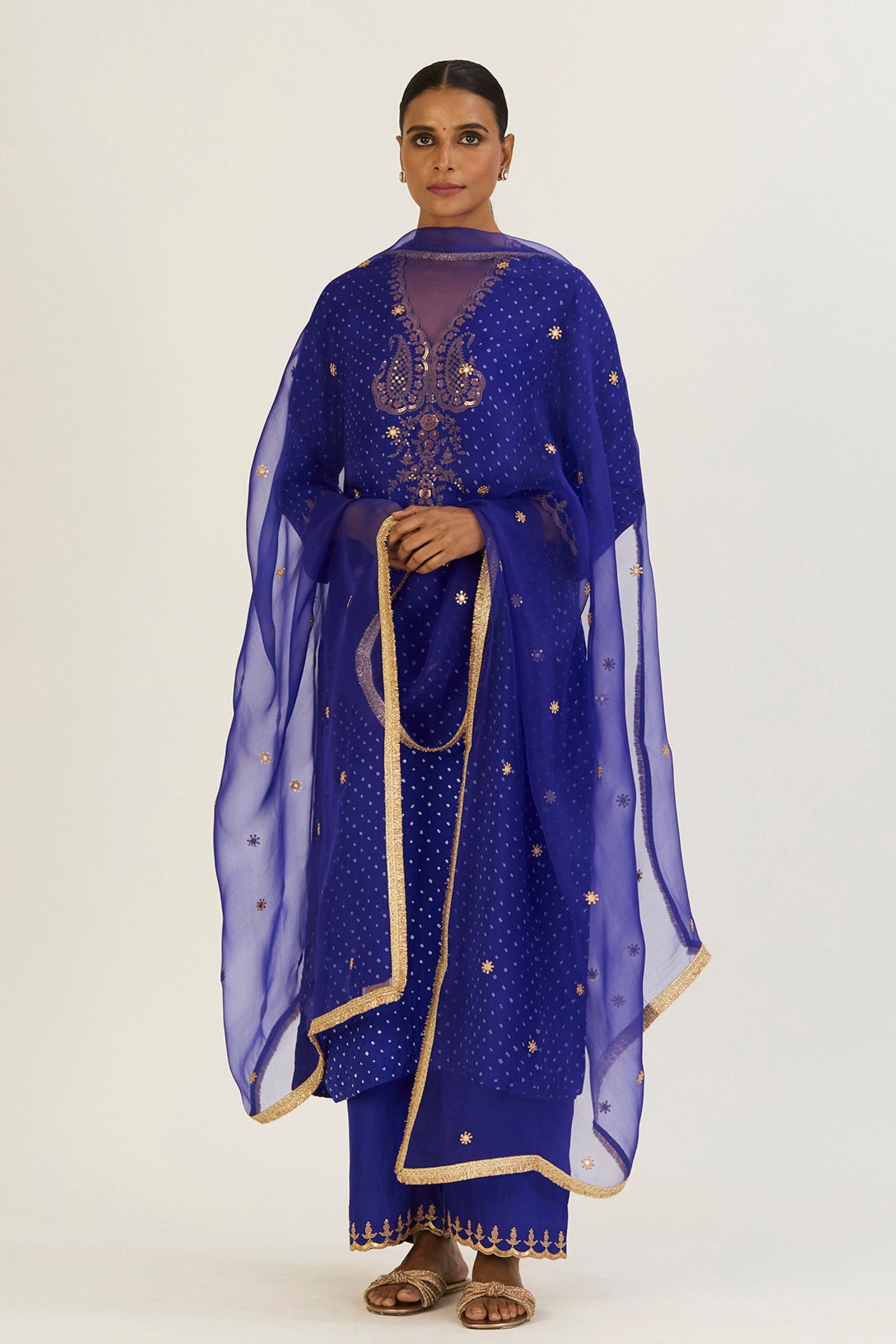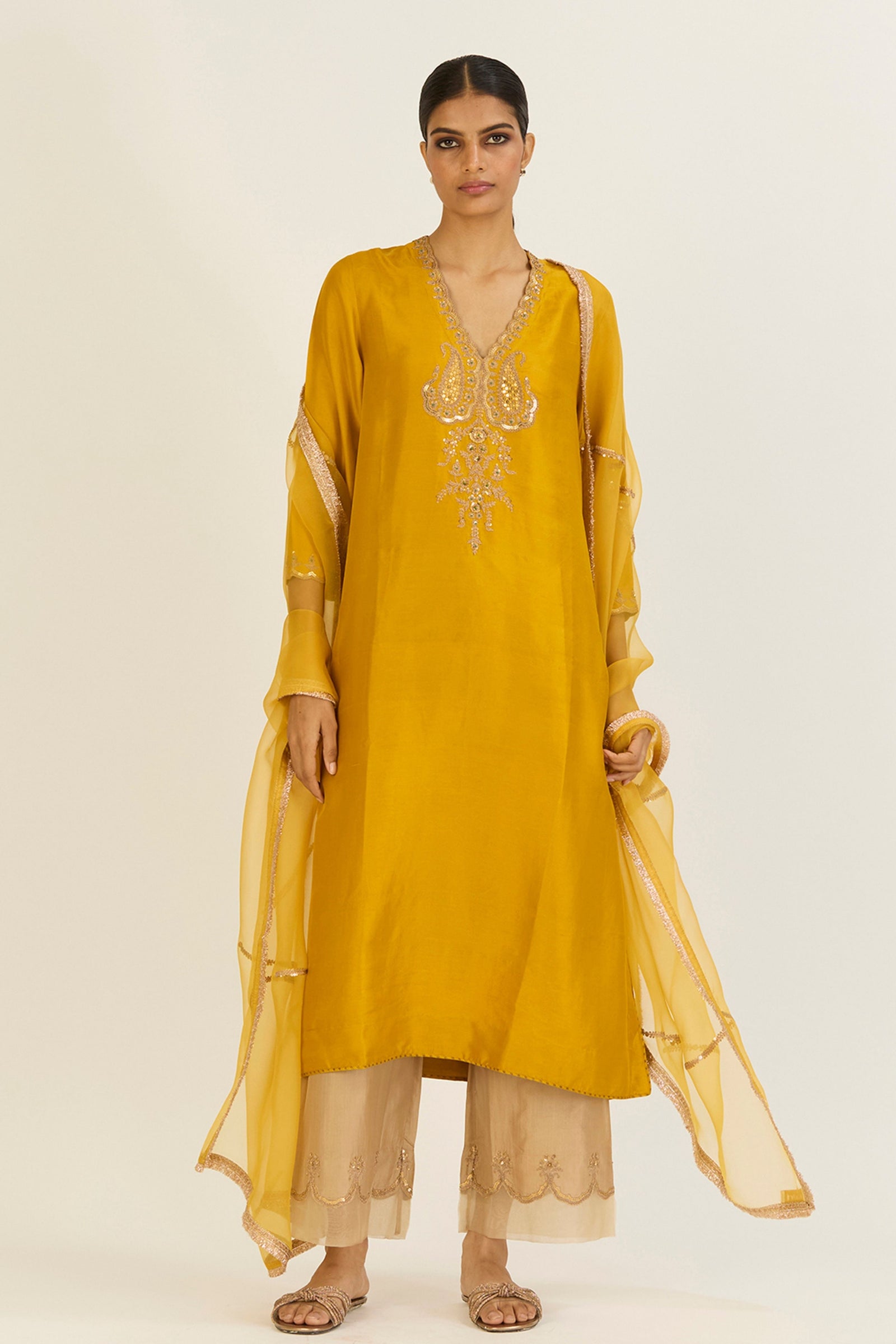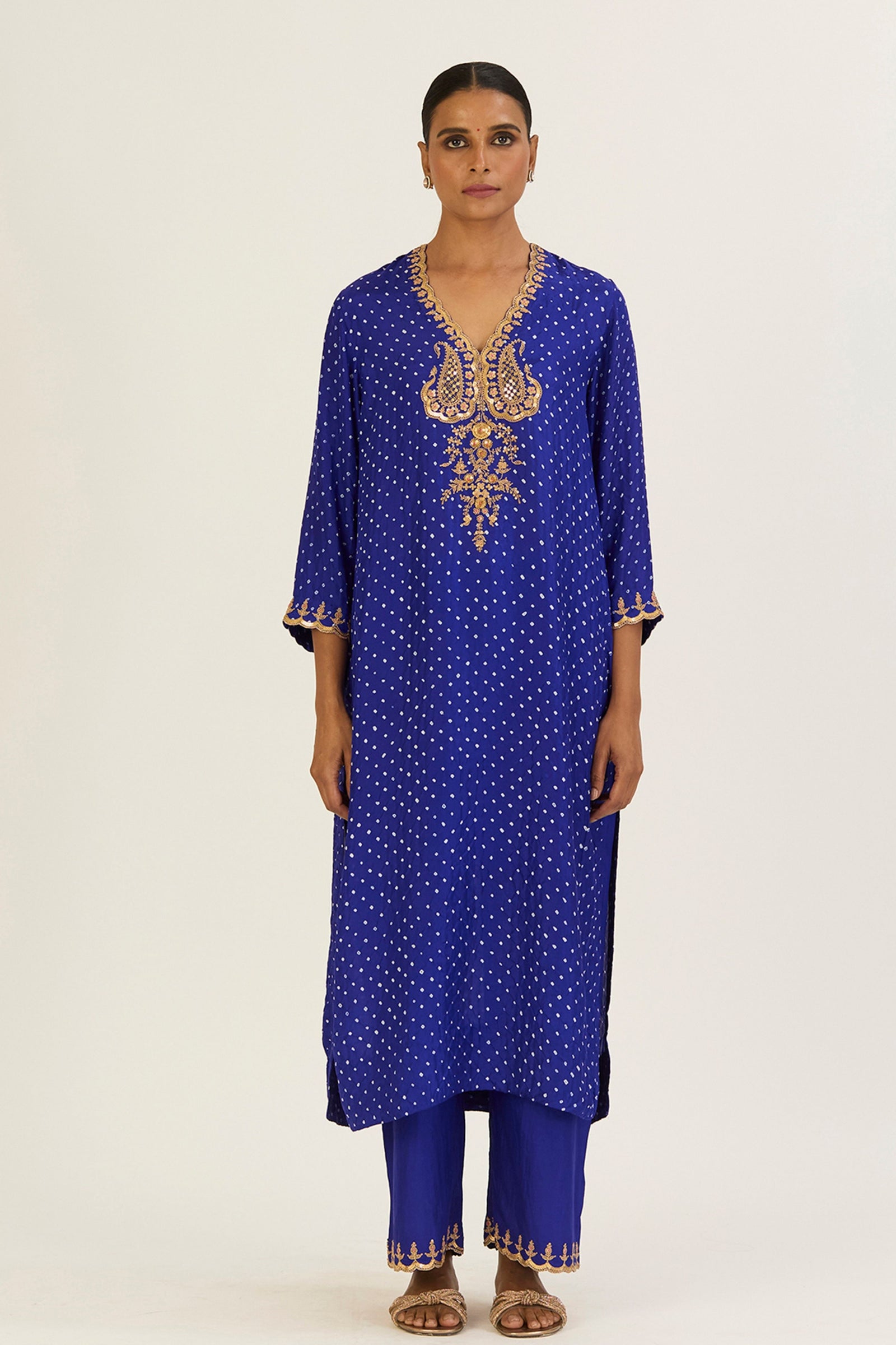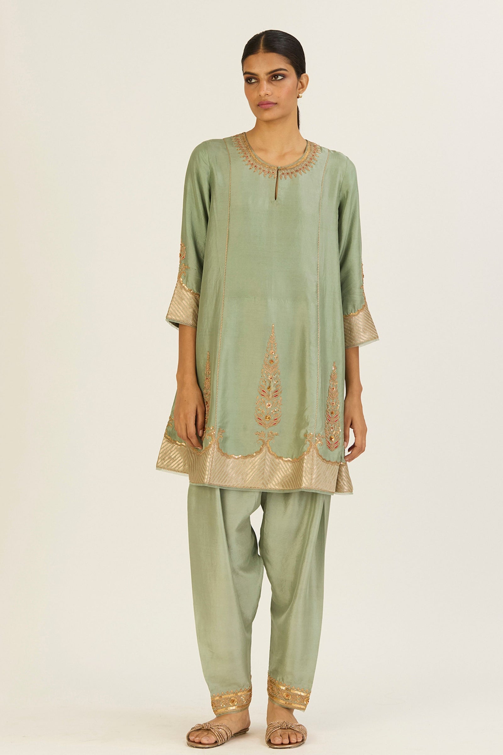 • Brinda kurta is crafted in fine silk. The kurta has marodi embroidered floral yoke, with peacock motifs all over. The silk pant is wide-legged with intricate floral embroidery detailing along the hem.