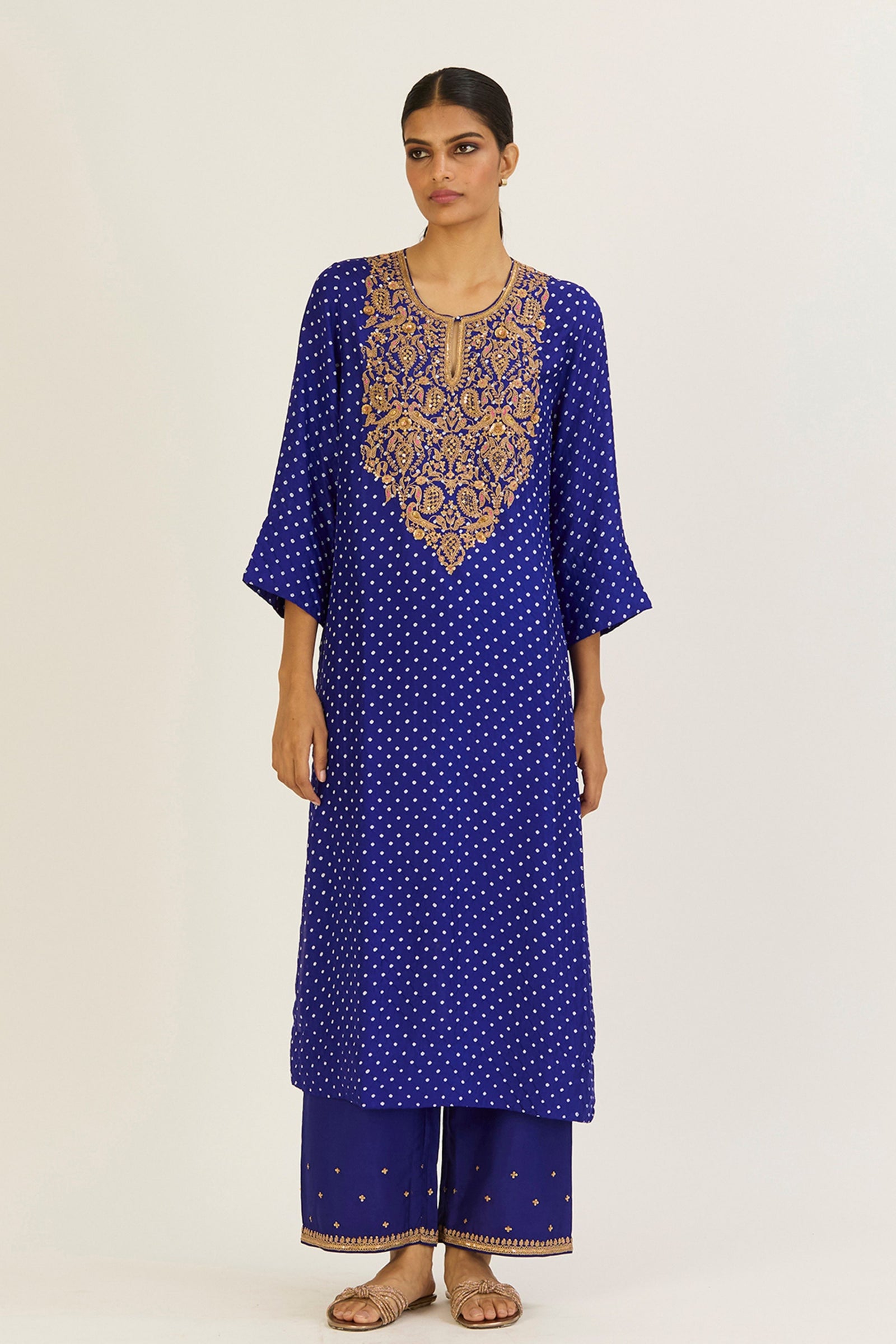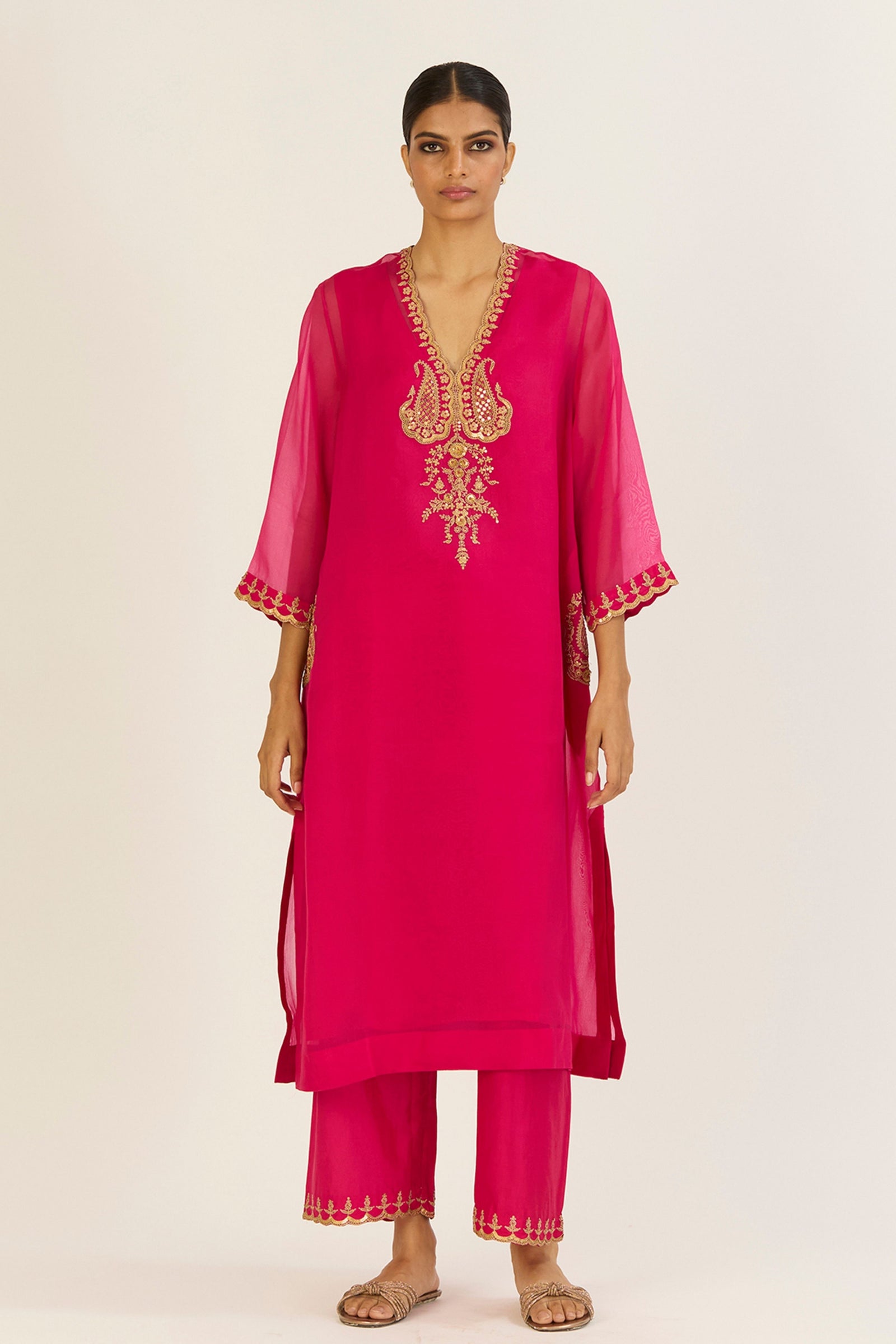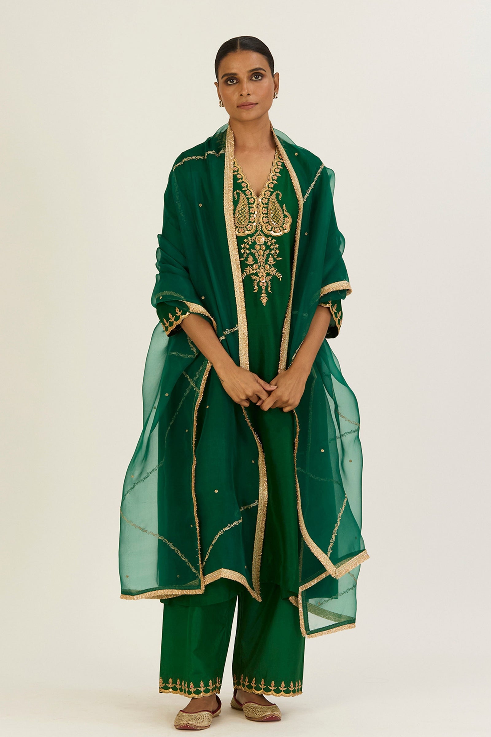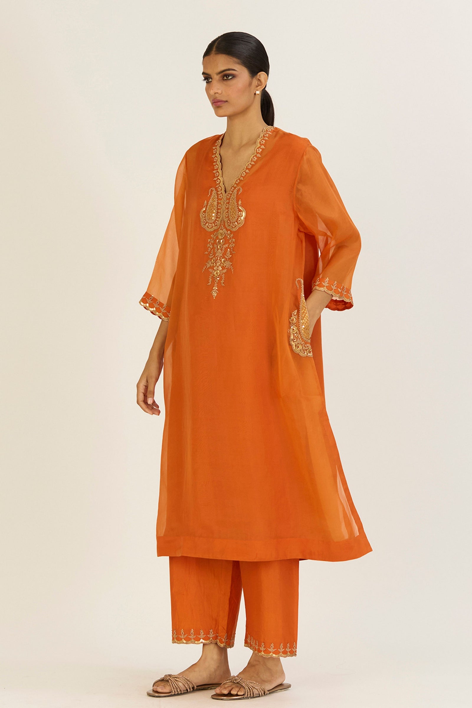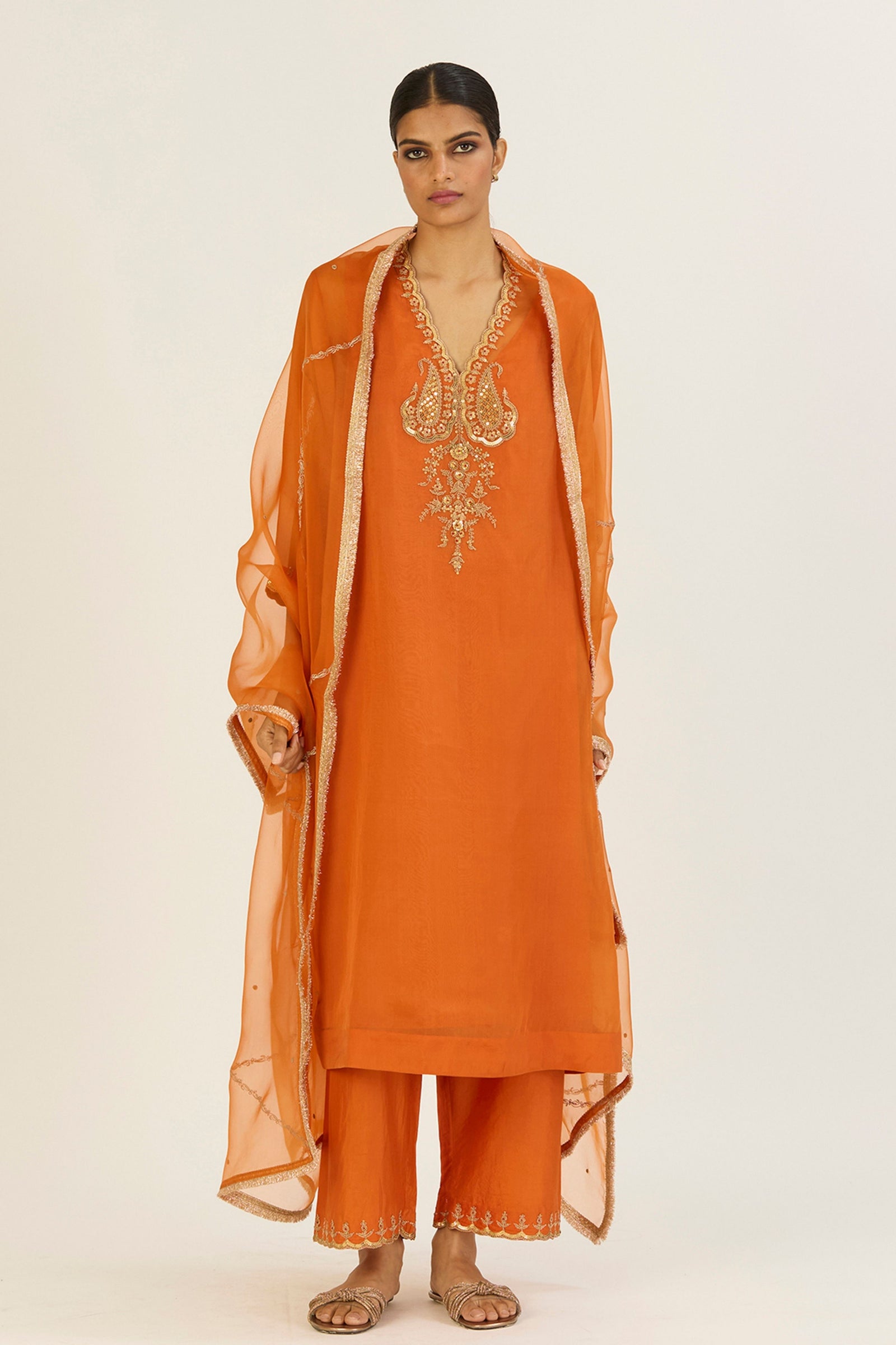 • Brinda kurta is crafted in fine silk. The kurta has marodi embroidered floral yoke, with peacock motifs all over. The silk pant is wide-legged with intricate floral embroidery detailing along the hem.