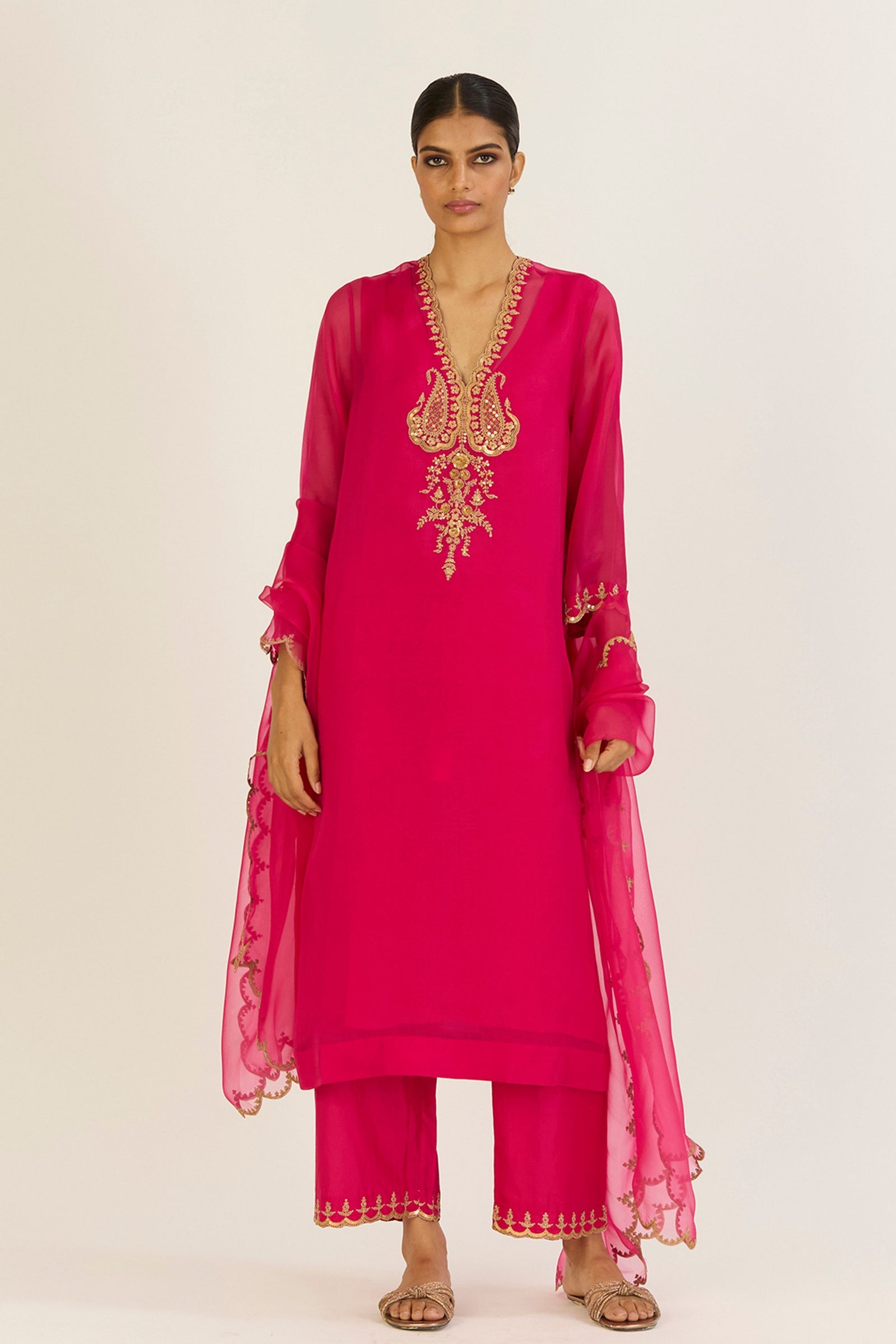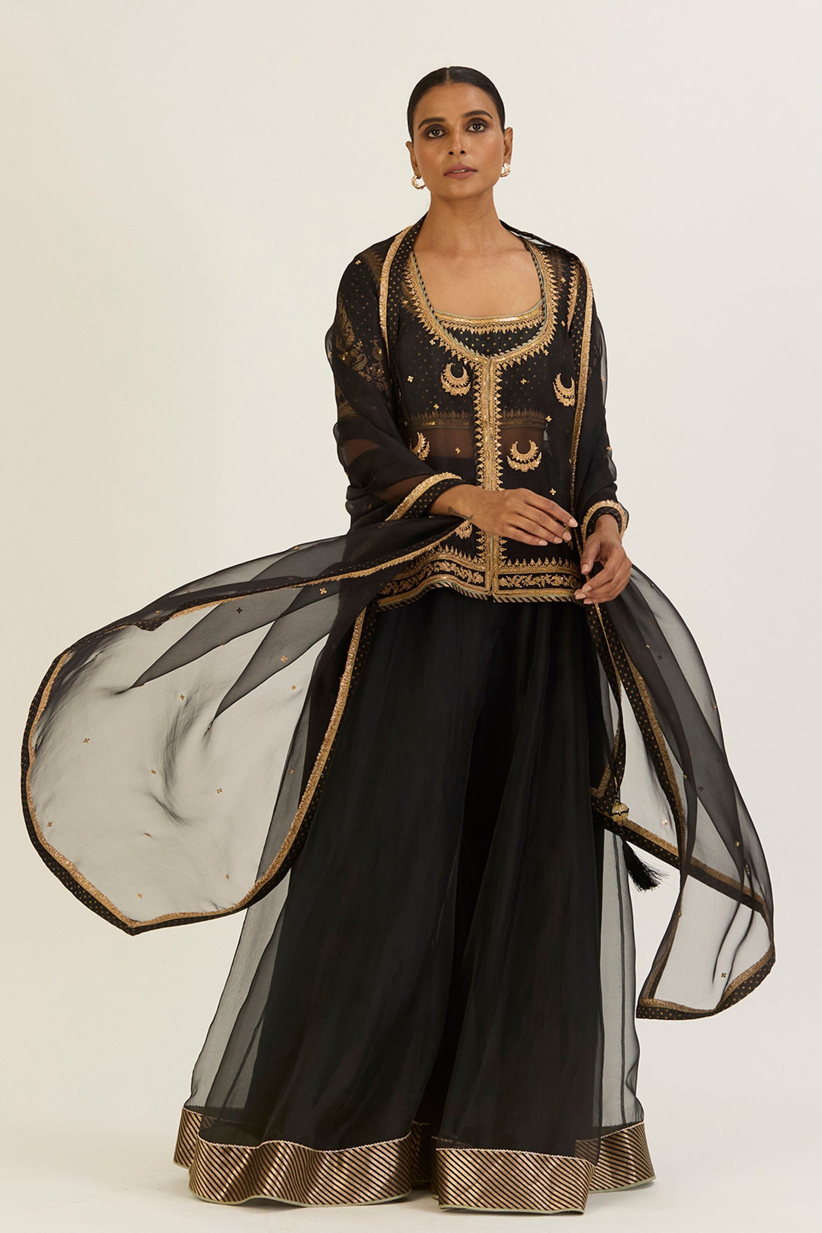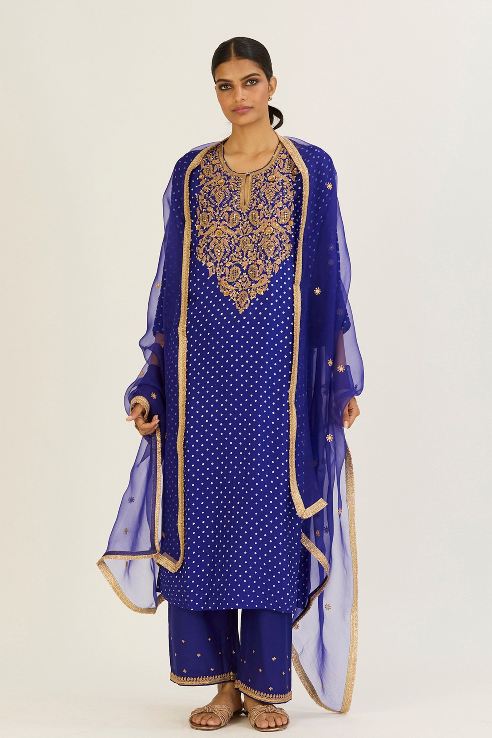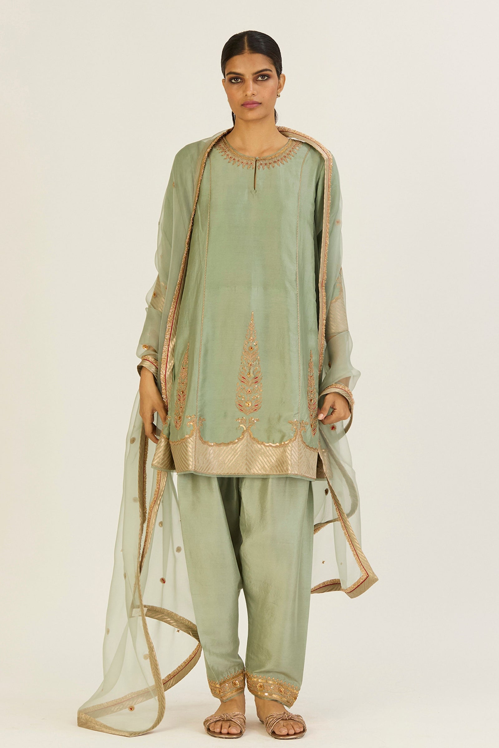• Brinda kurta is crafted in fine silk. The kurta has marodi embroidered floral yoke, with peacock motifs all over. The silk pant is wide-legged with intricate floral embroidery detailing along the hem.