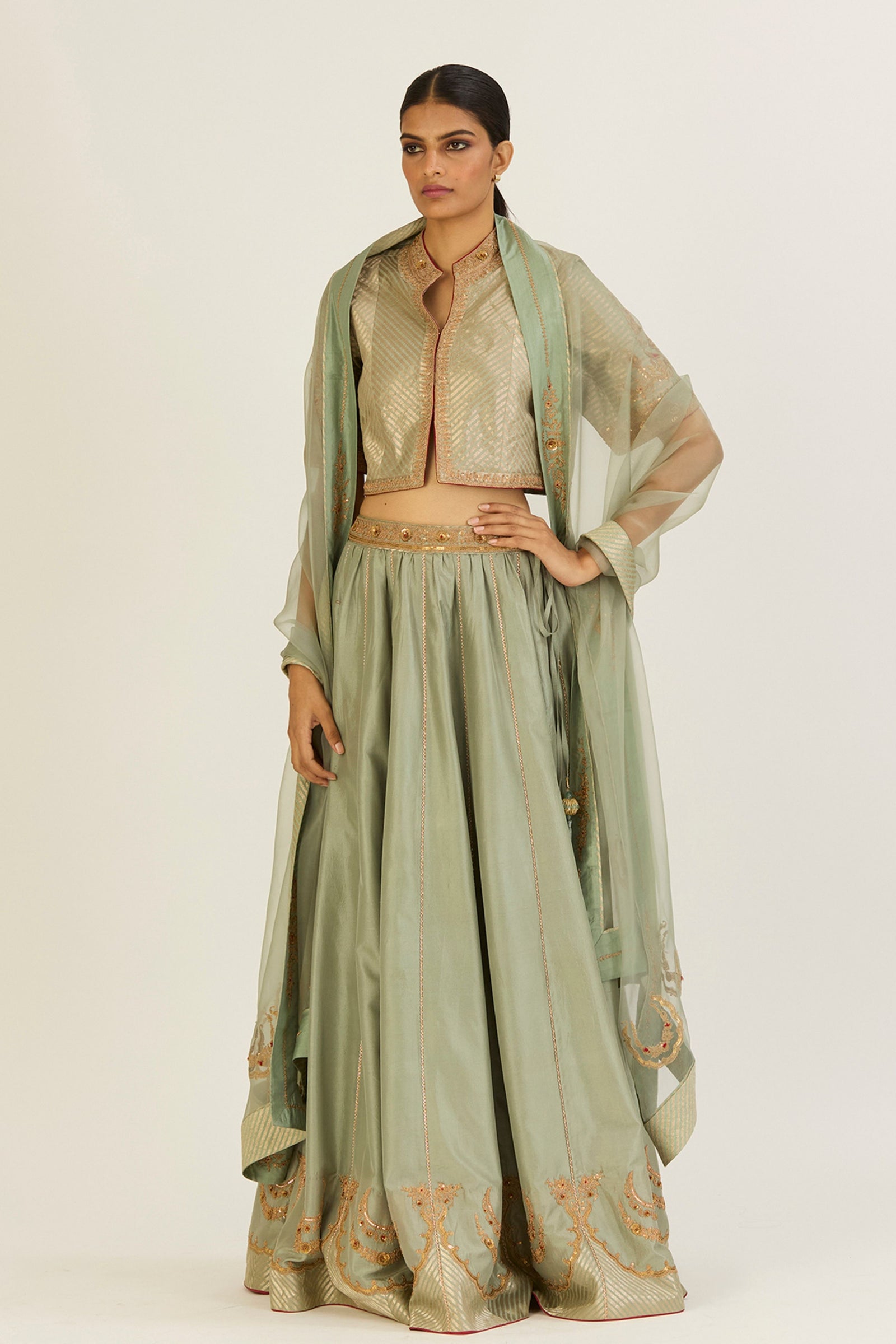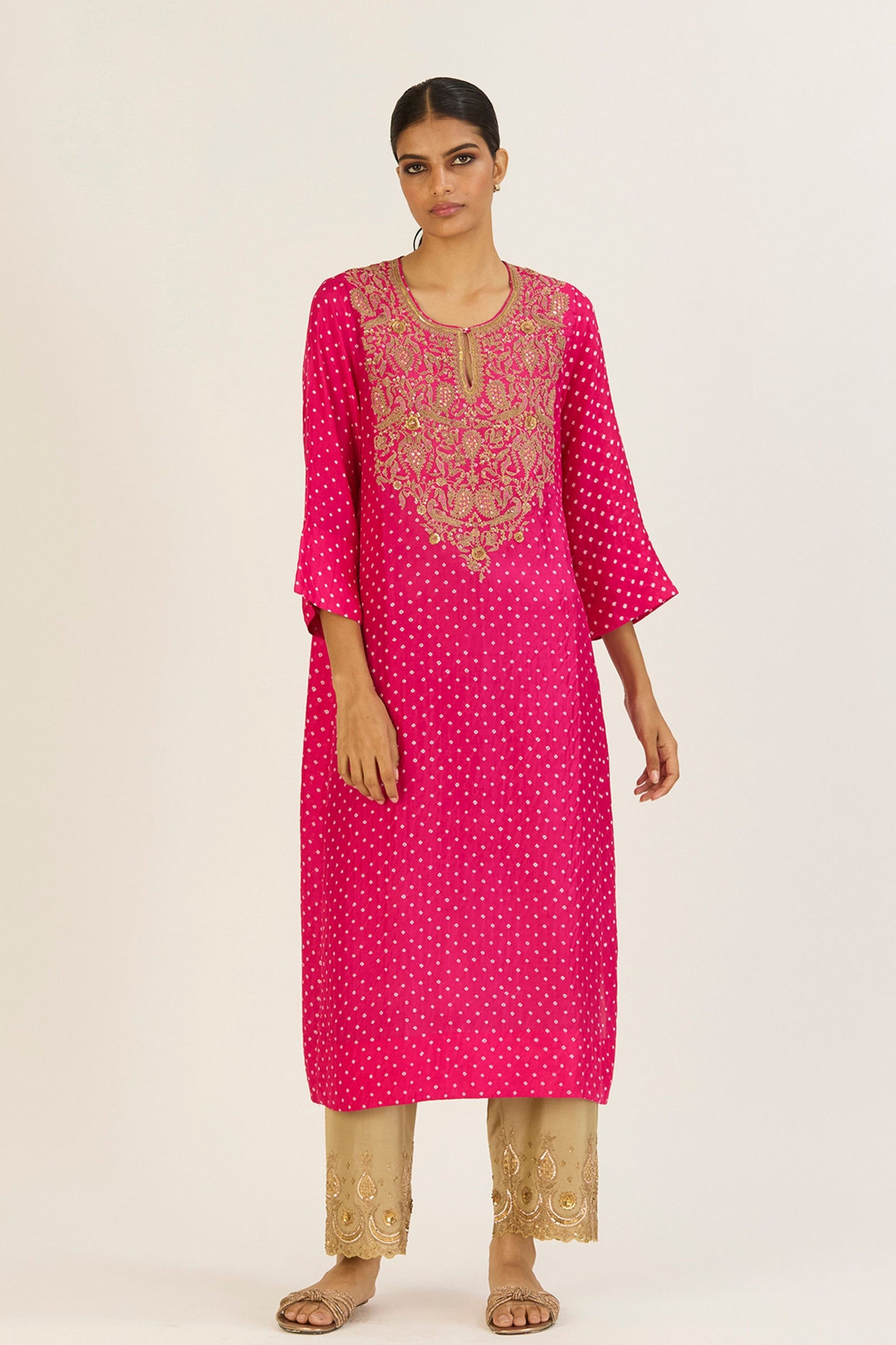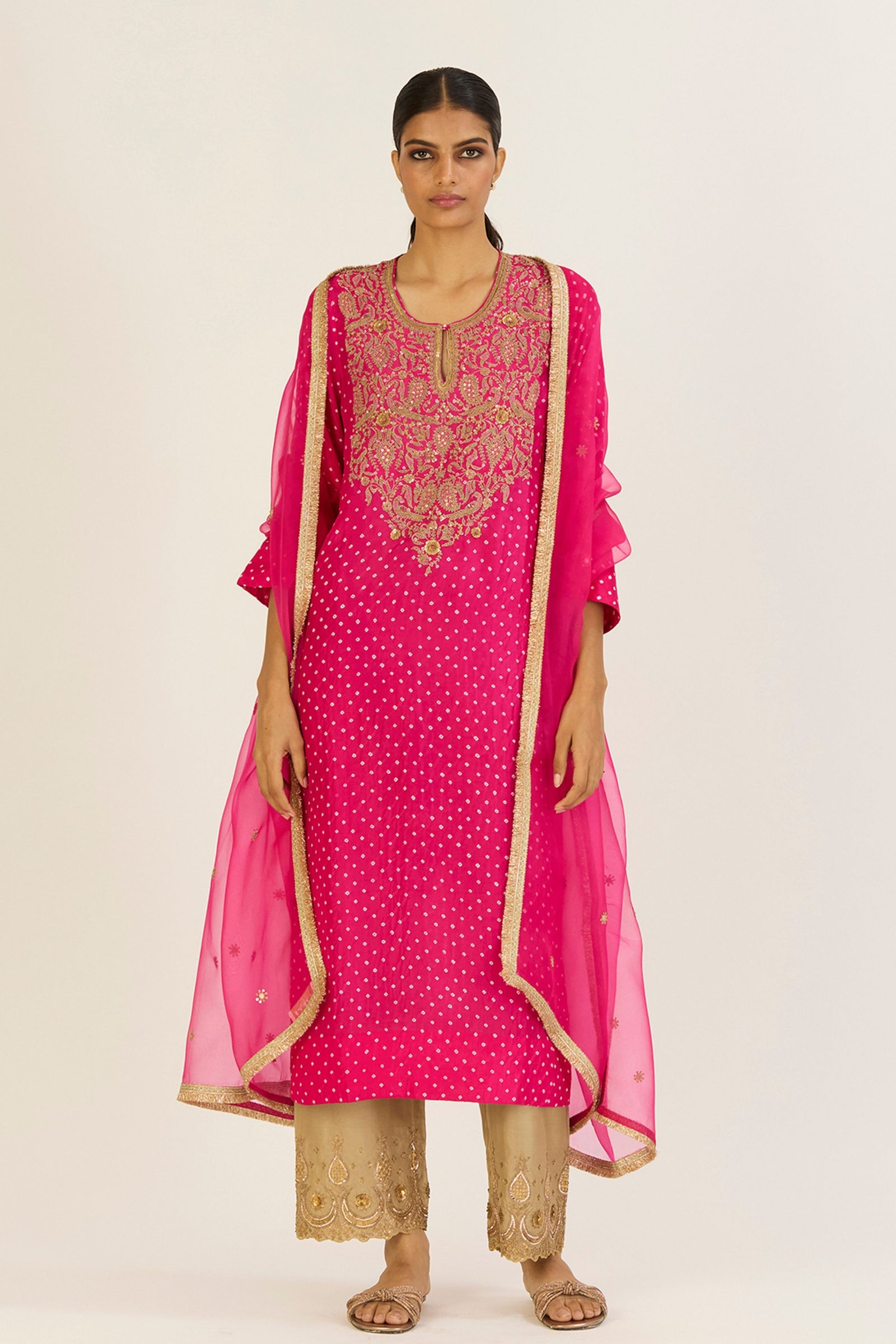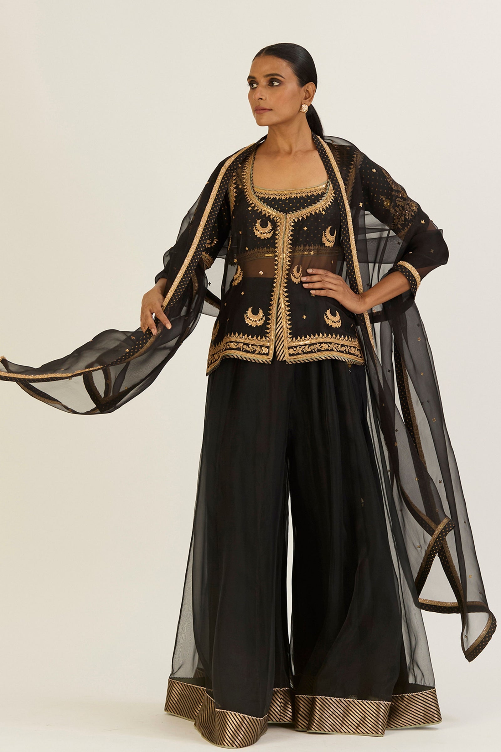 • Brinda kurta is crafted in fine silk. The kurta has marodi embroidered floral yoke, with peacock motifs all over. The silk pant is wide-legged with intricate floral embroidery detailing along the hem.