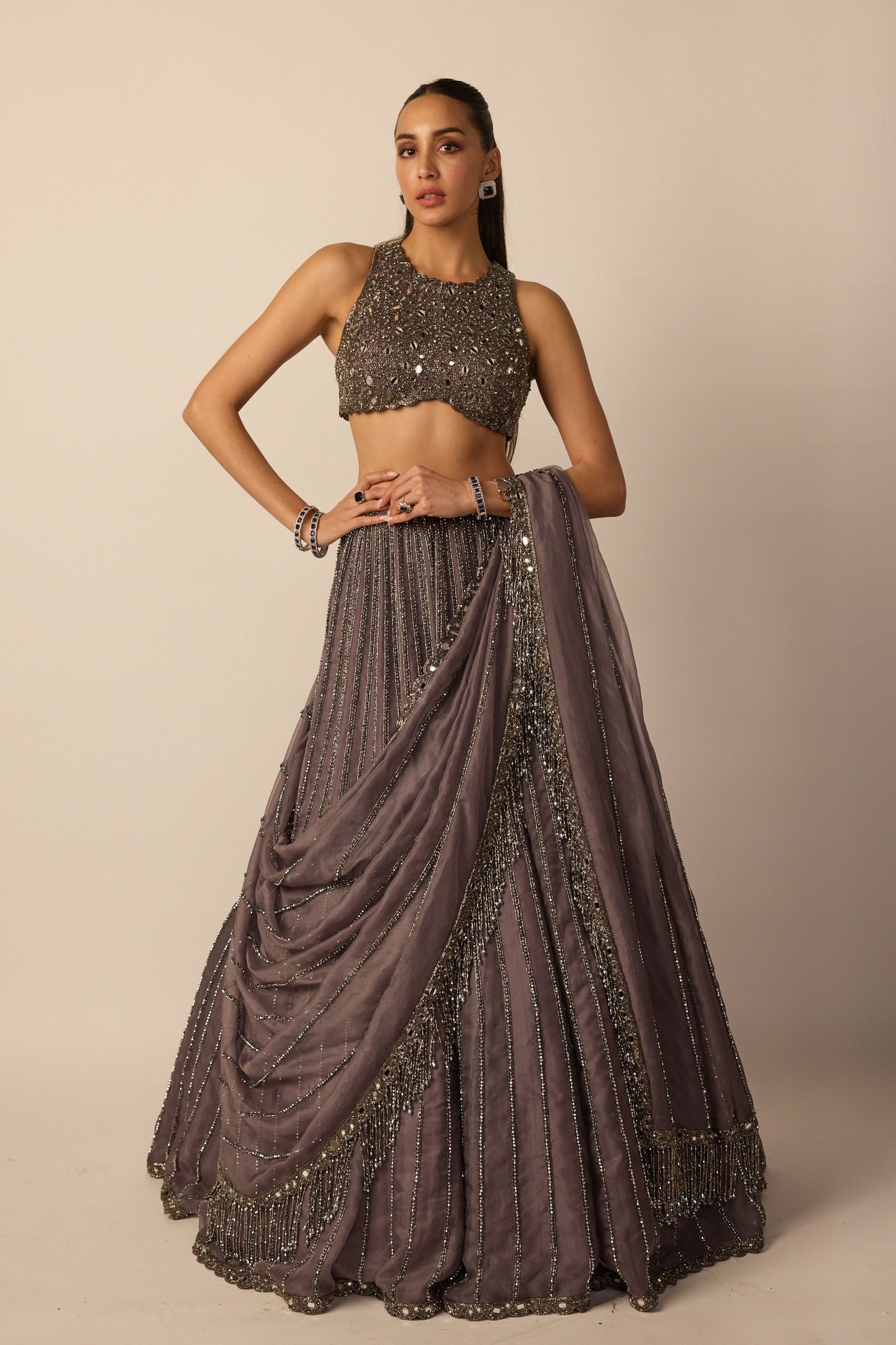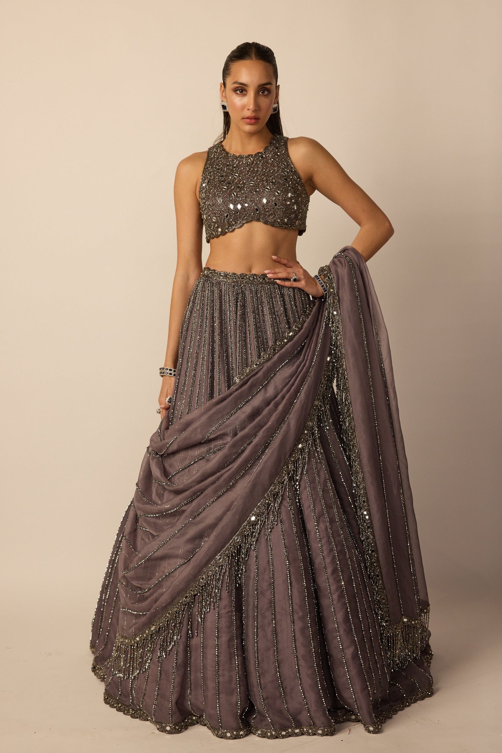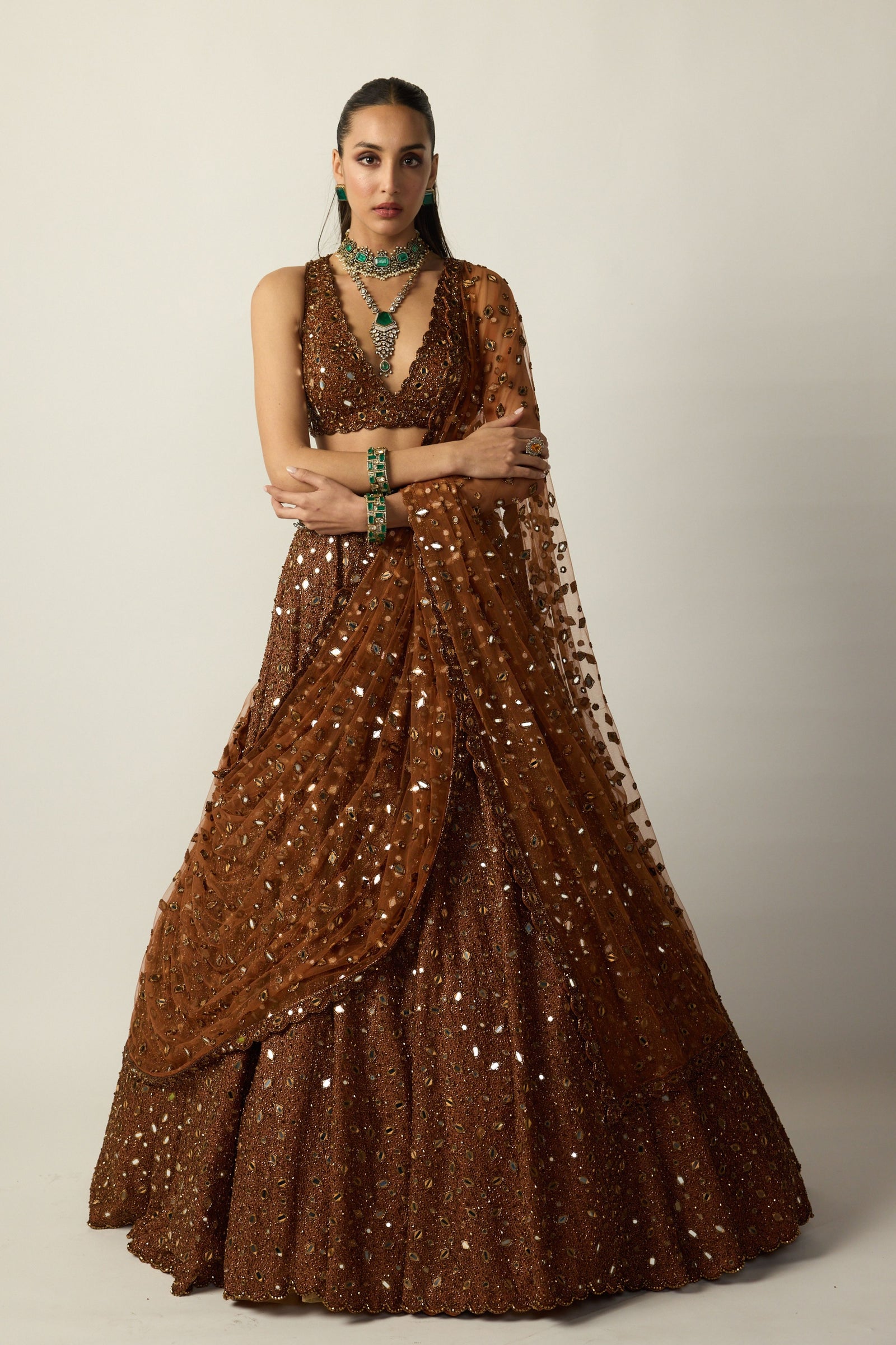 • Intricately hand embroidered lehenga and dupatta featuring sequins, cutdana and crystal embroidery clubbed with jewelled blouse with crystal embellishments.