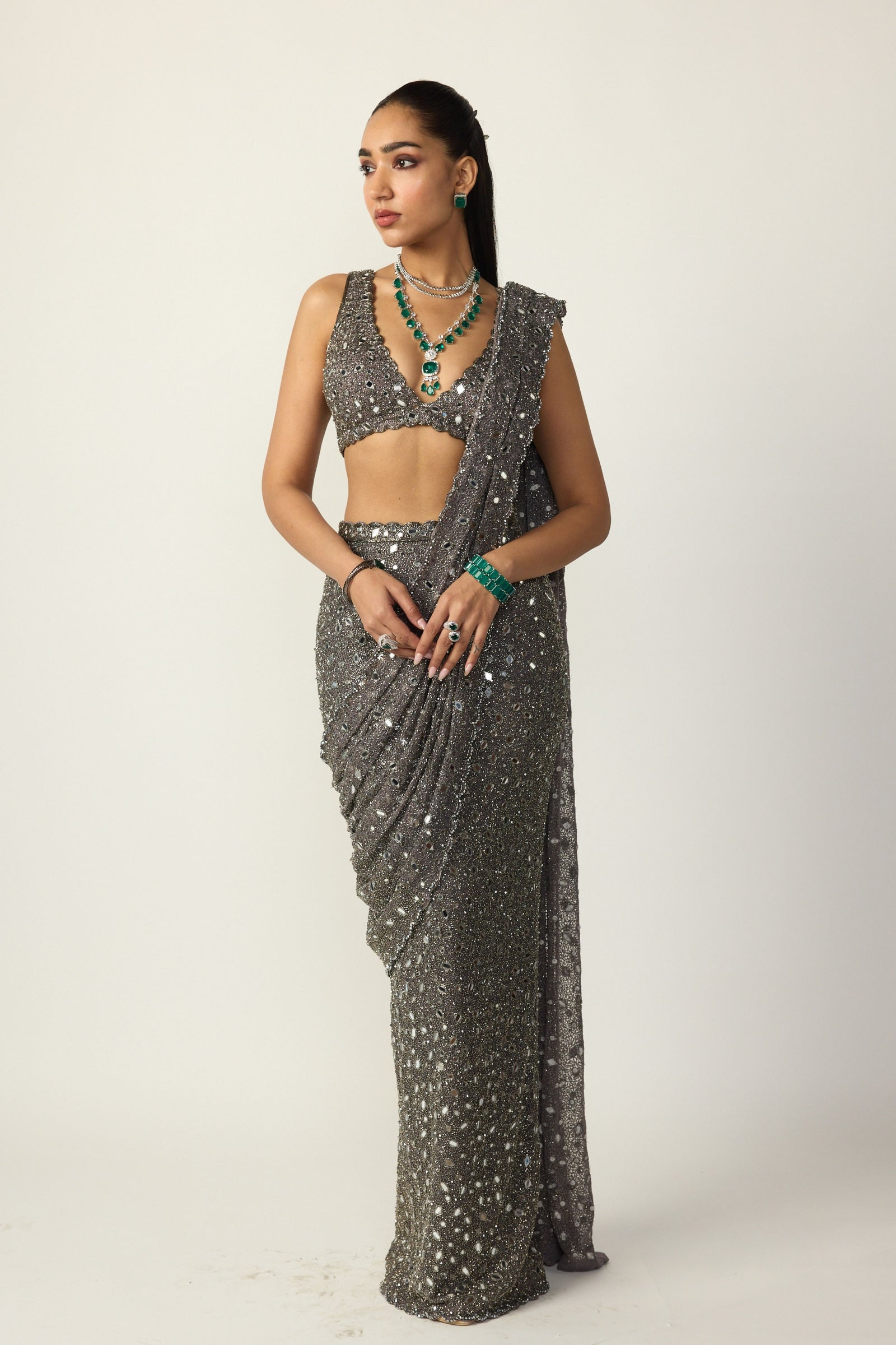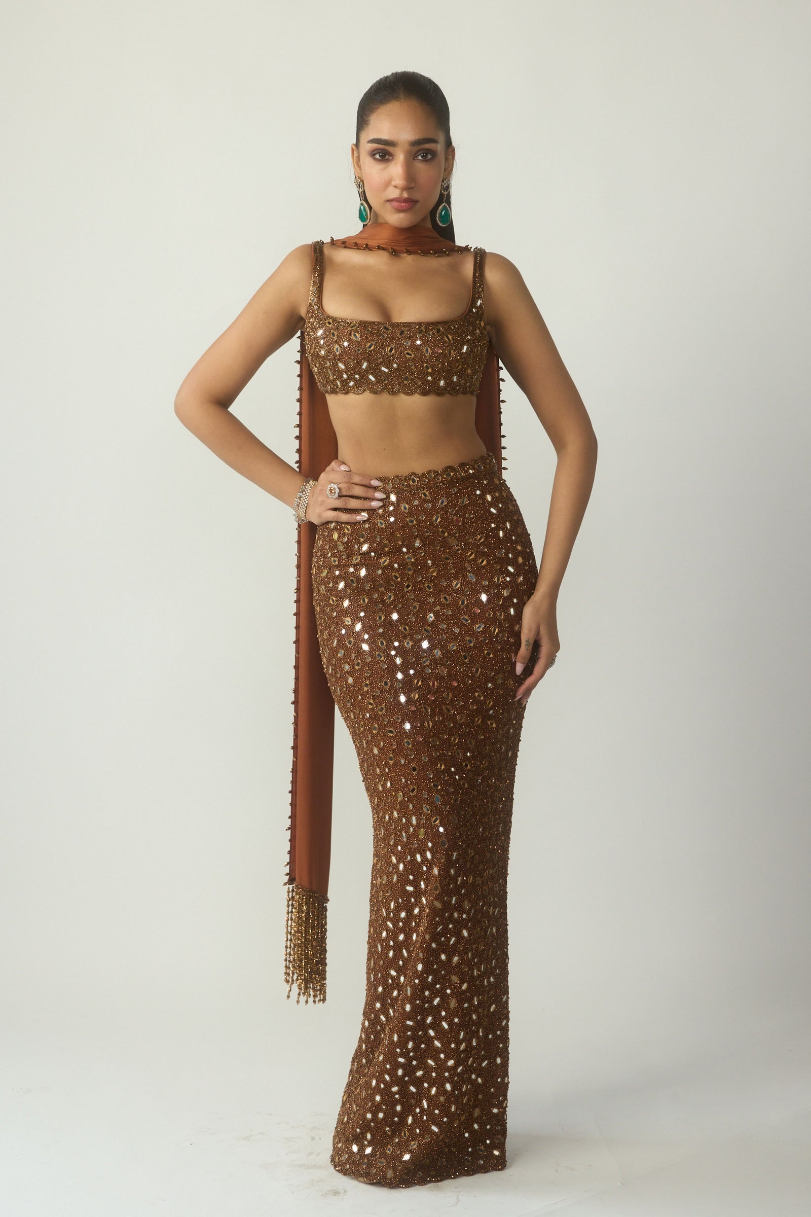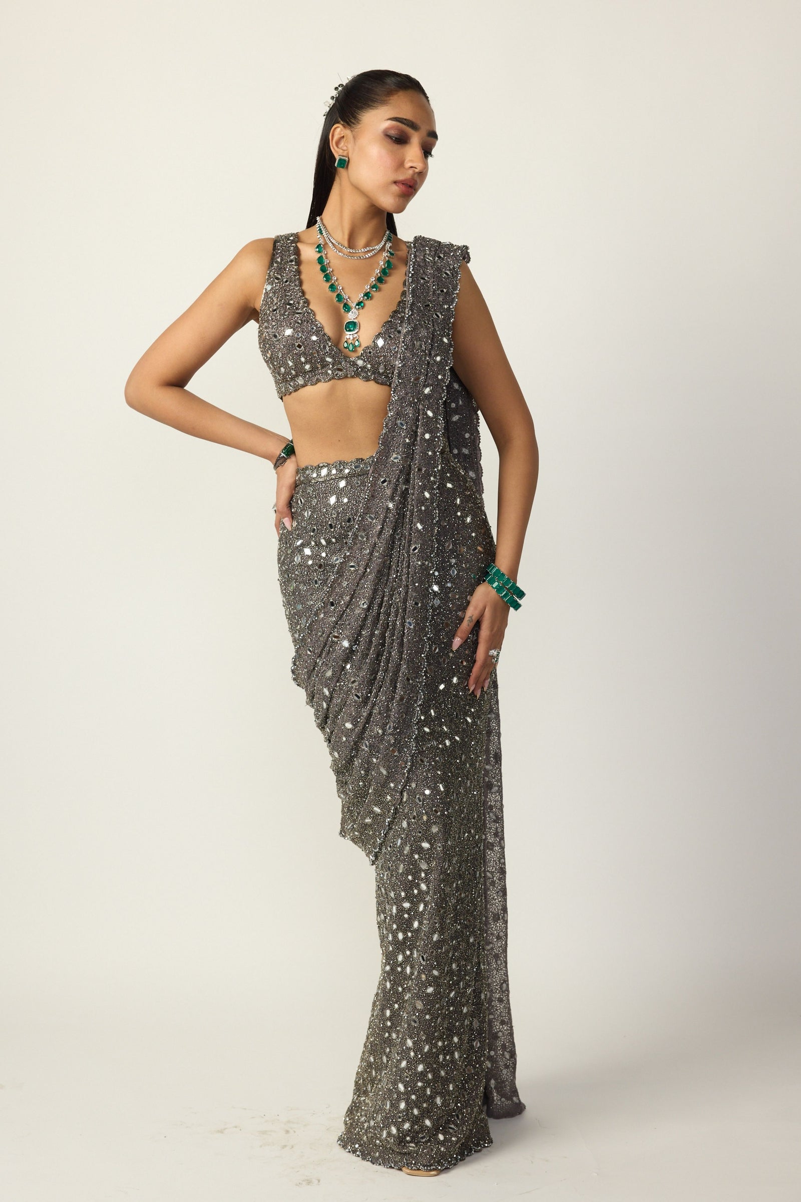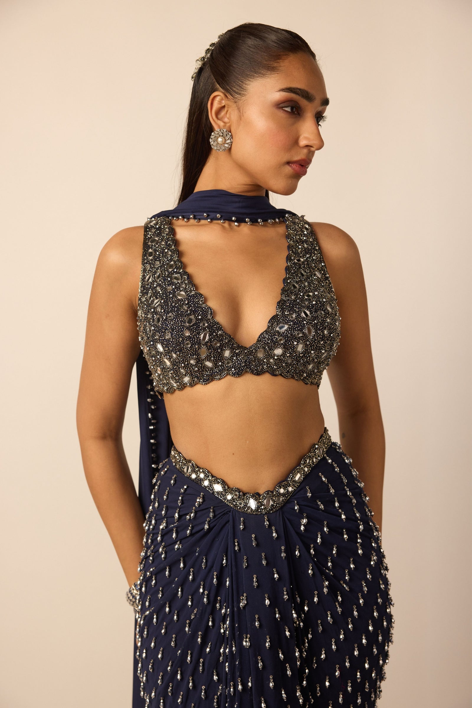 • Intricately hand embroidered lehenga and dupatta featuring sequins, cutdana and crystal embroidery clubbed with jewelled blouse with crystal embellishments.