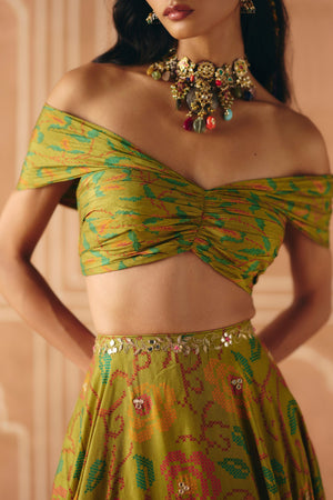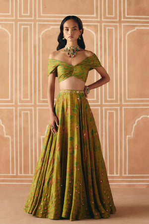 • Featuring a printed, intricately hand embroidered lehenga paired with a pleated off shoulder blouse and an embroidered organza dupatta.