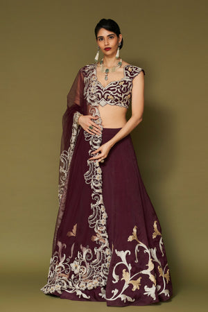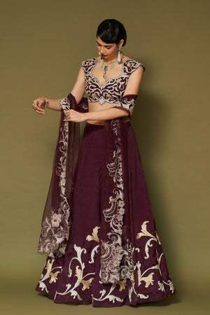 • Crafted in silk organza, this wine lehenga set is beautifully highlighted with fine zari work and intricate hand embroidery, adding texture and dimension to its flowing silhouette. Paired with a matching blouse featuring coordinated embroidery and an intricately embroidered net dupatta, the ensemble is completed with elegance and finesse.
