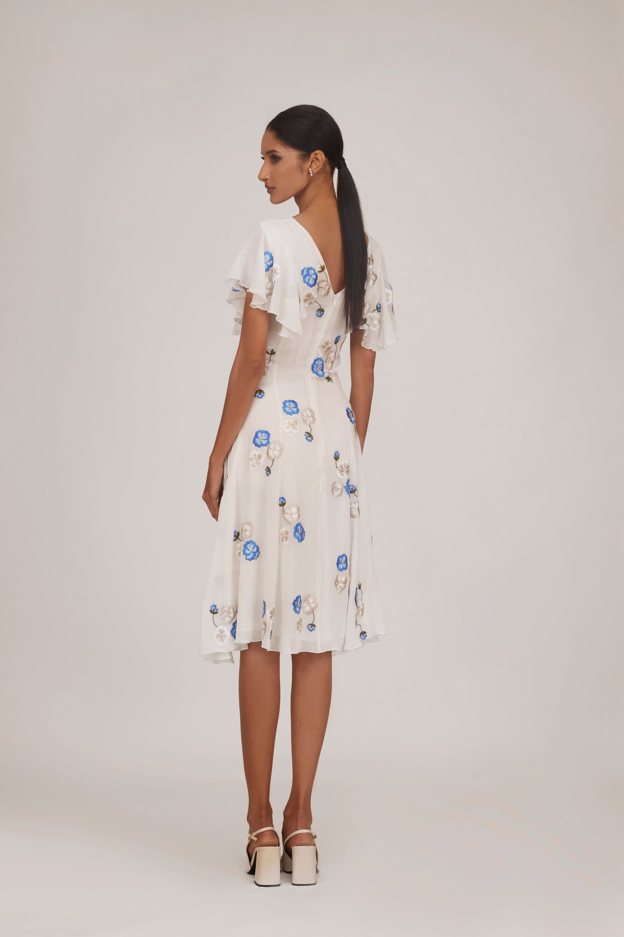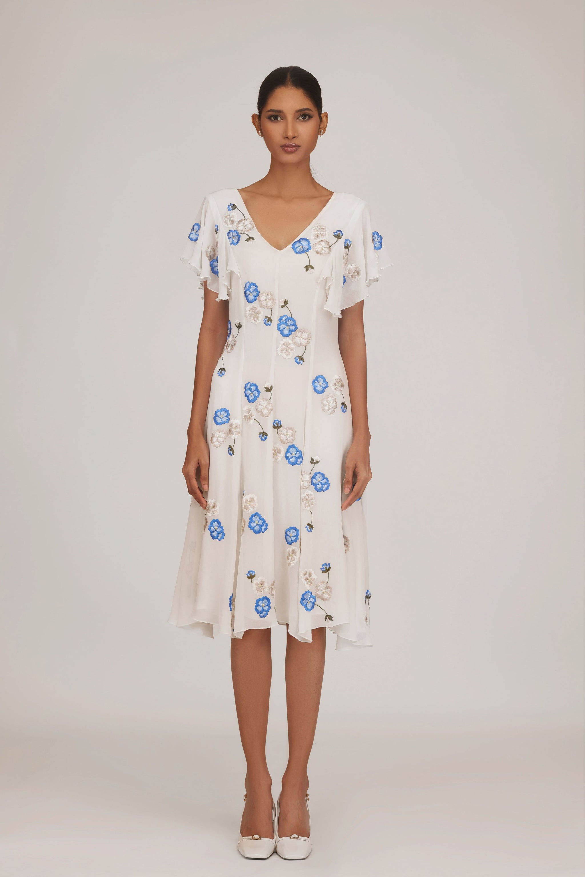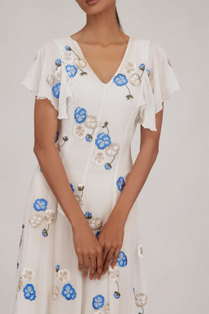 • This a-line dress is crafted in a georgette base and showcases minimal floral motifs through soft, elegant embroideries. The flated sleeves lend an additional charm to the style.
