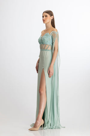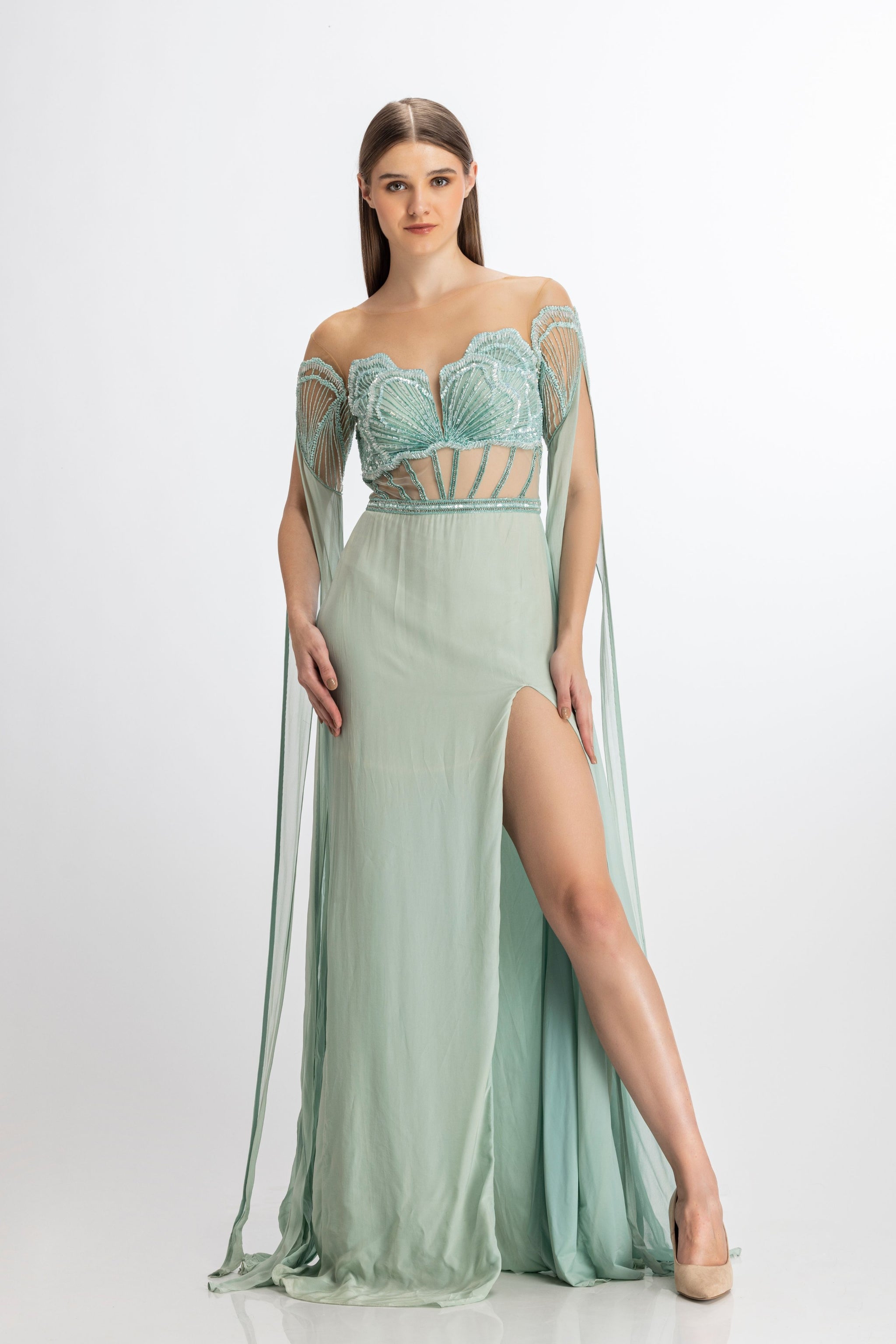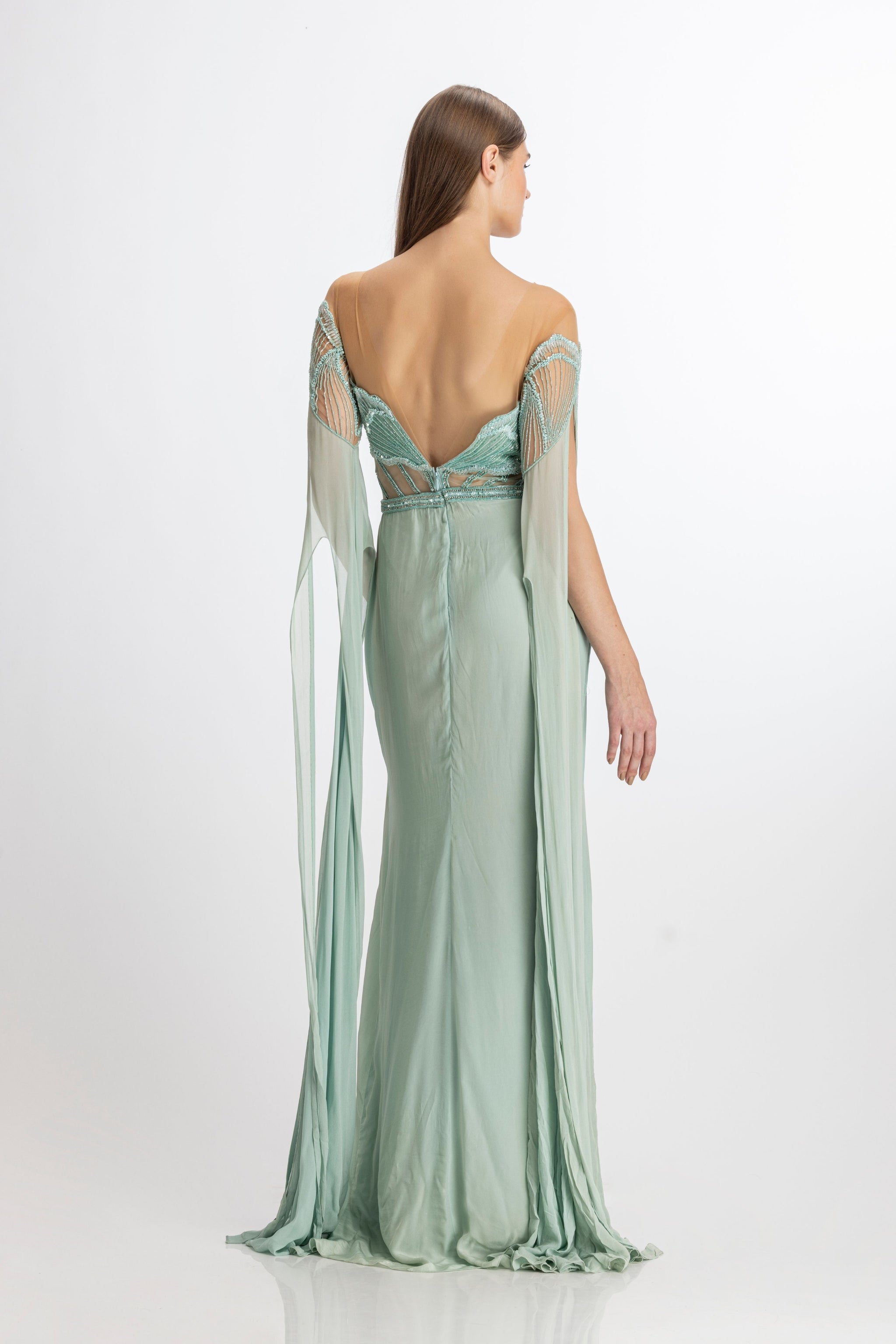 • The sassy Bhawna Rao gown is all about play full fabric strips on the sleeves and hand embroidered fin inspired bodice. The fabric is georgette and is perfect for a beach wedding cocktail night or a pre-wedding shoot.