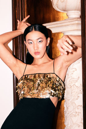 • Don old-school glamour with this strappy black dress, featuring gold speckles that adds extravagance to this whole look.