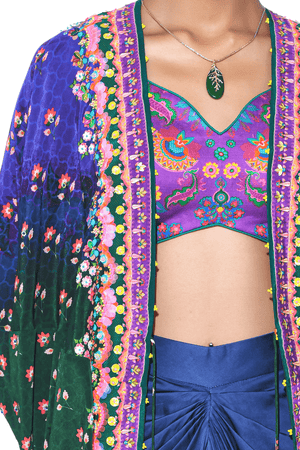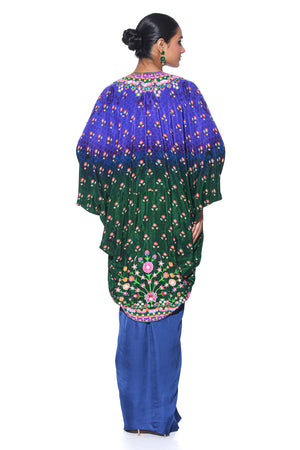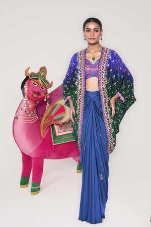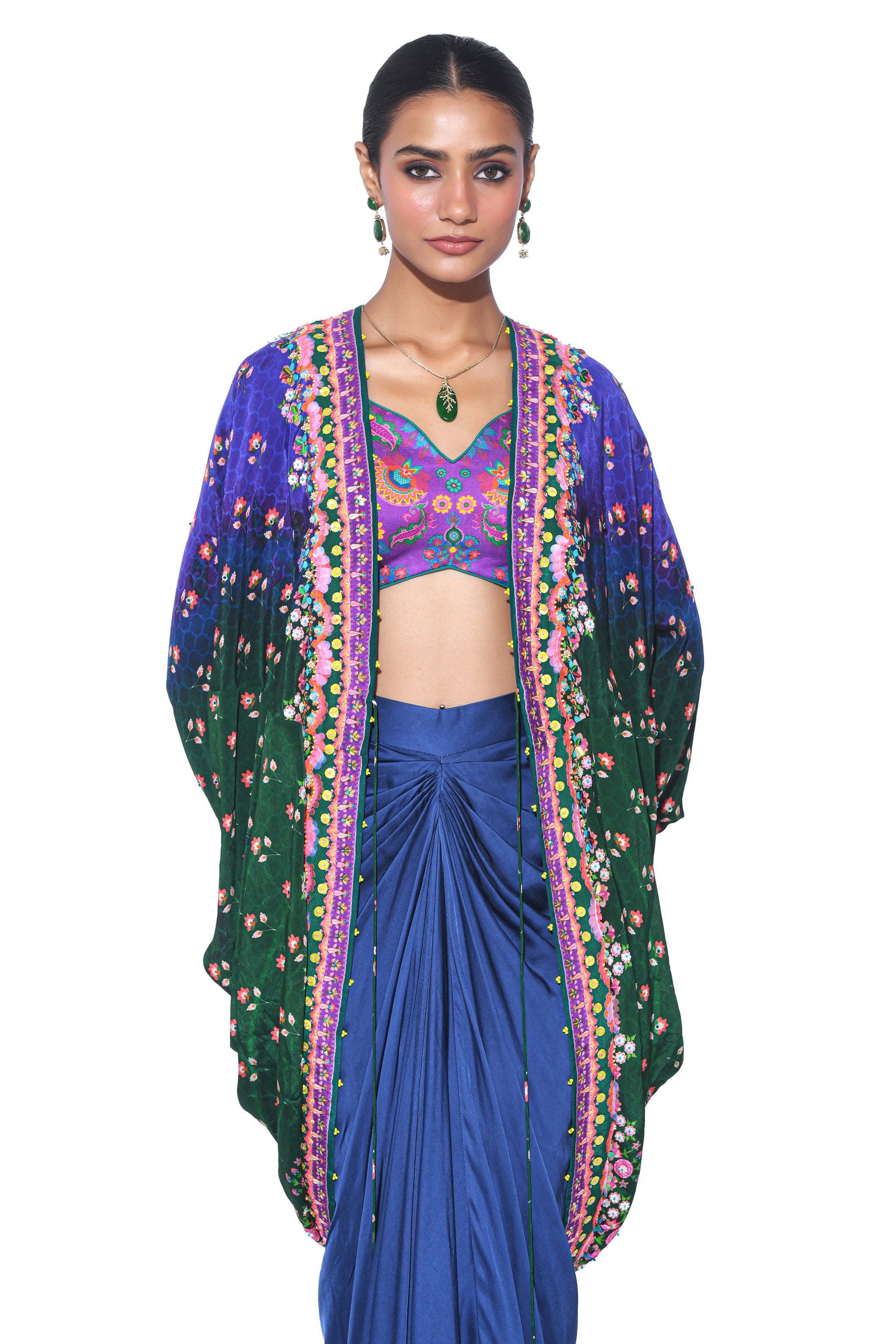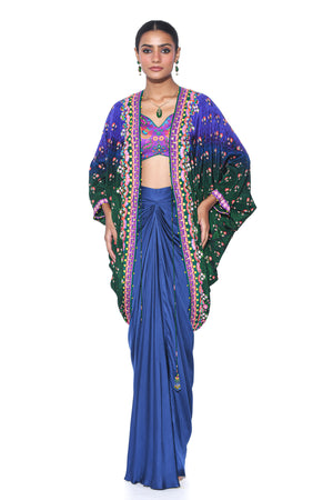 • Blue, green ombre and deep purple border with sb signature 3d hand embroidered shrug, royal purple printed sleaveless blouse, oriental blue drape skirt.