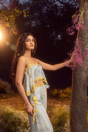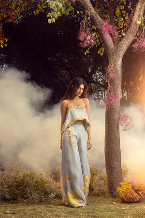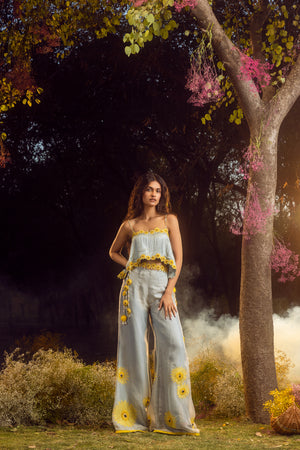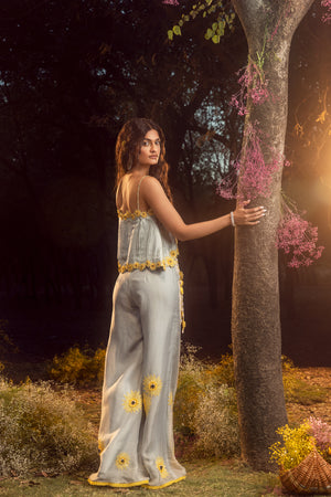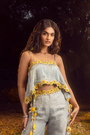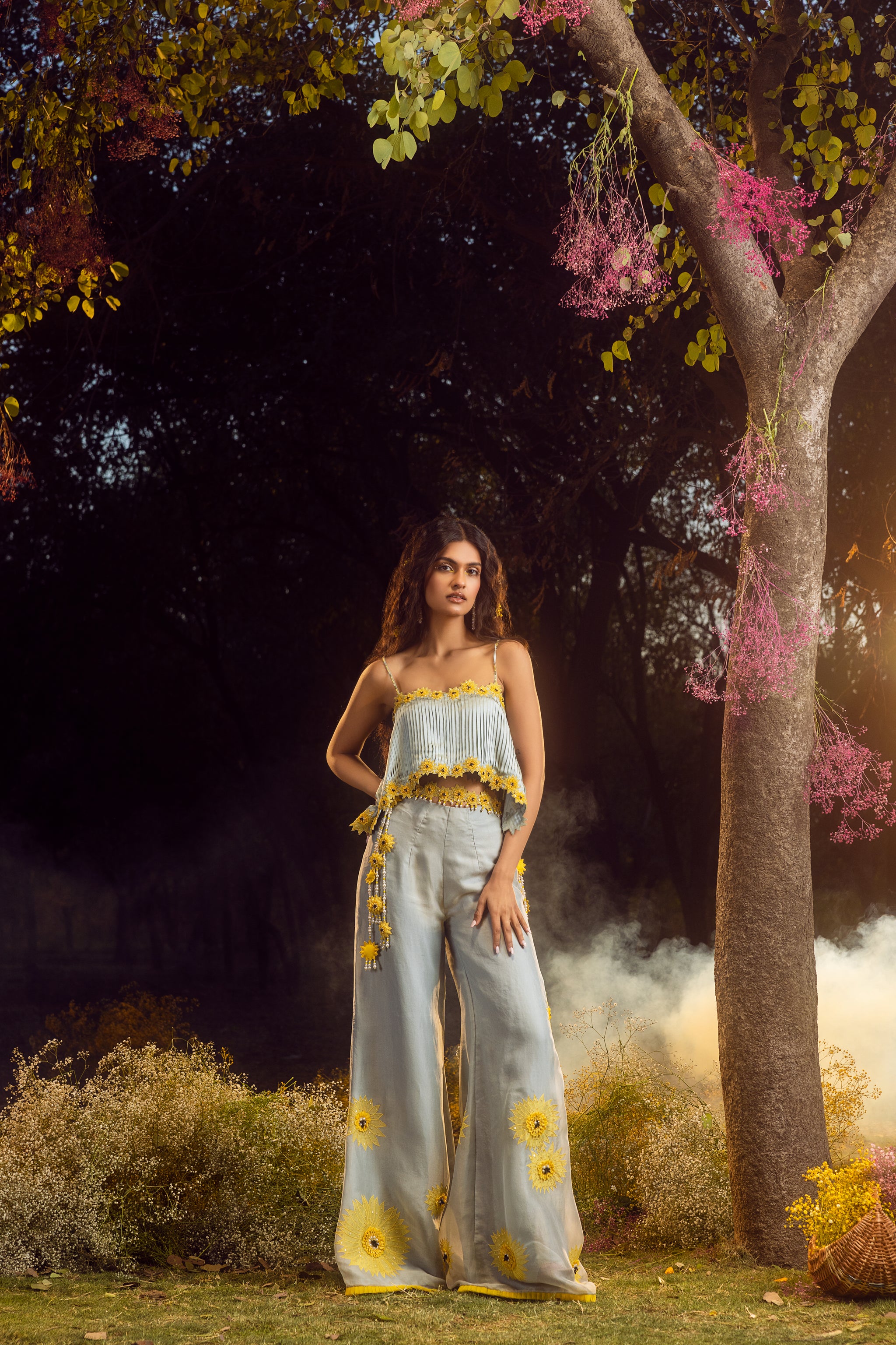 • blue grey organza palazzo set with pleated crop top and belt embroidered with 3-d sunflower motifs
