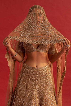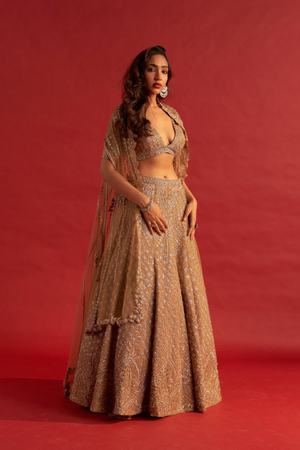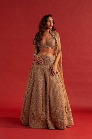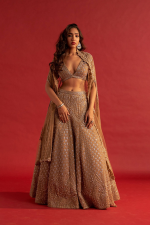 • Plunge neckline heavy embroidered blouse with lehenga skirt paired with cutwork cape dupatta. Hand embroidered work details - nakshi,zardosi,zari,cutdana,swarovski,nalki work