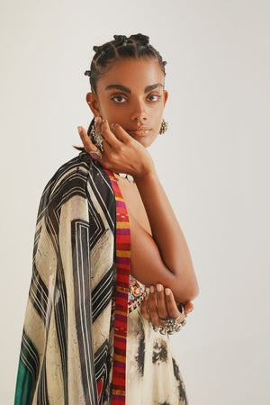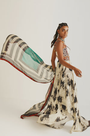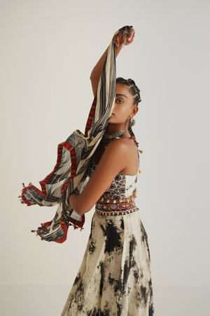 • Tie-dye print chakra skirt with embroidered waist band paired with kama blouse which has tribal tassel detail on straps and hem and mirror embroidery paired with printed sheer silk dupatta.