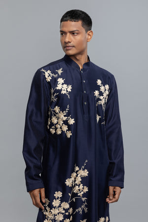 • A refined choice for special occasions, this men's kurta set is tailored from rich chanderi fabric and adorned with delicate hand embroidery using resham threads. The craftsmanship reflects subtle elegance and traditional artistry. Paired with a coordinating pant, it's perfect for festive gatherings and cultural celebrations.