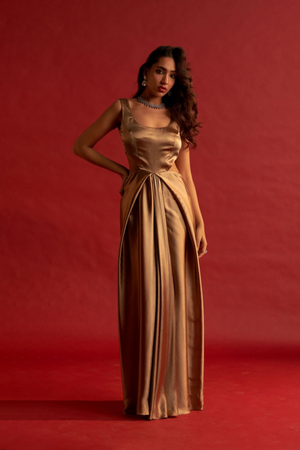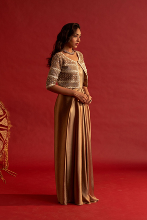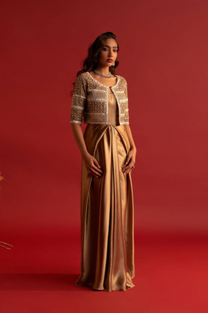 • Two piece set including silk satin gown with draping details comes with a cropped short embroidered jacket. Hand embroidered work details - nakshi,zardosi,zari,cutdana,swarovski,nalki work
