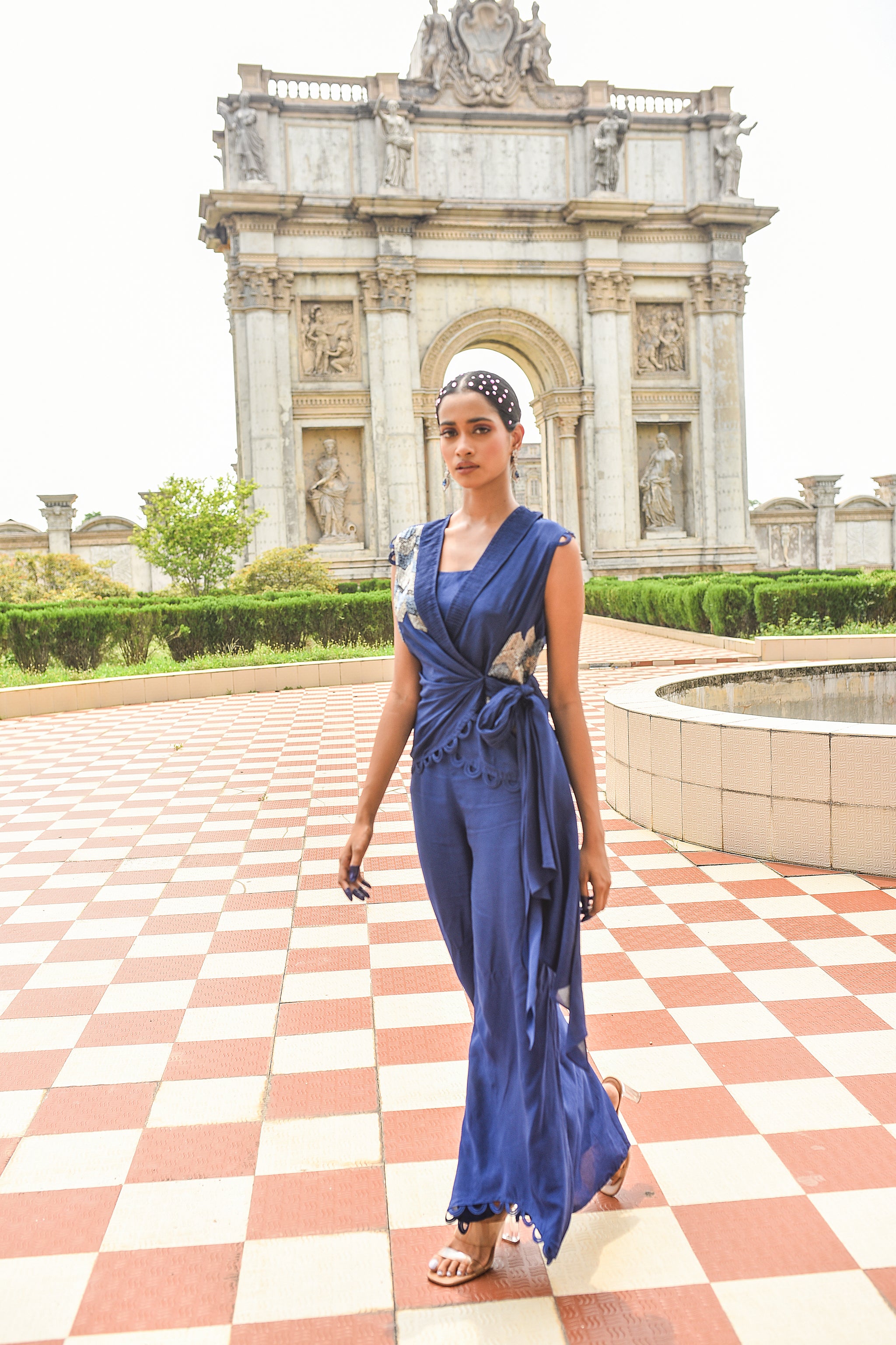 • Jacket with metallic embroidery in geometric pattern along with a tie up closure with flared pants.