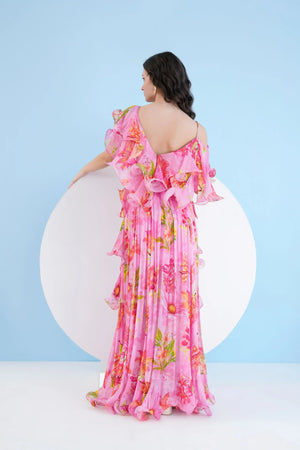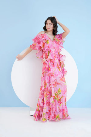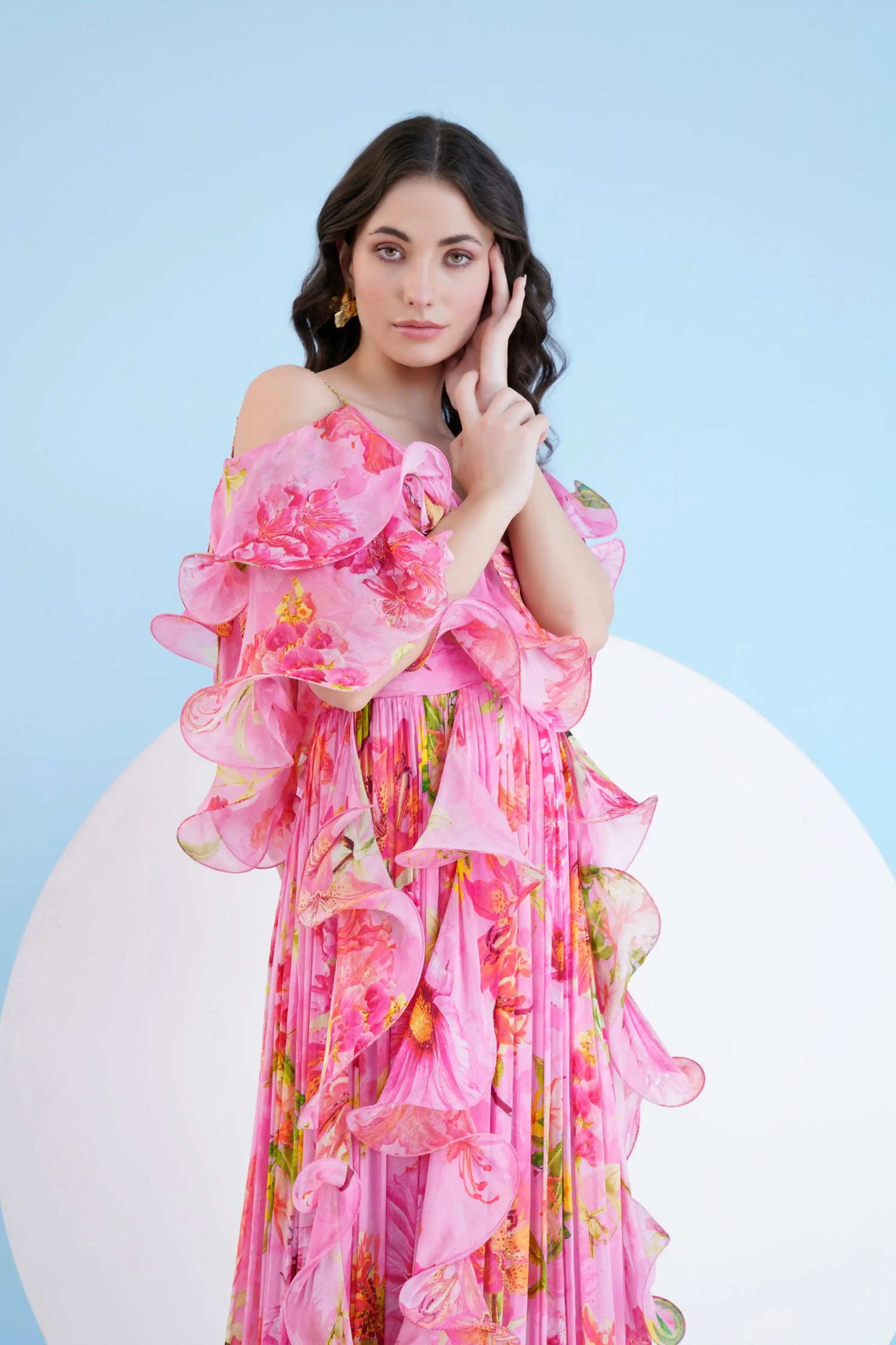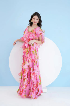 • Dark pink lilium printed long dress in chiffon featuring cascade and ruffle detail