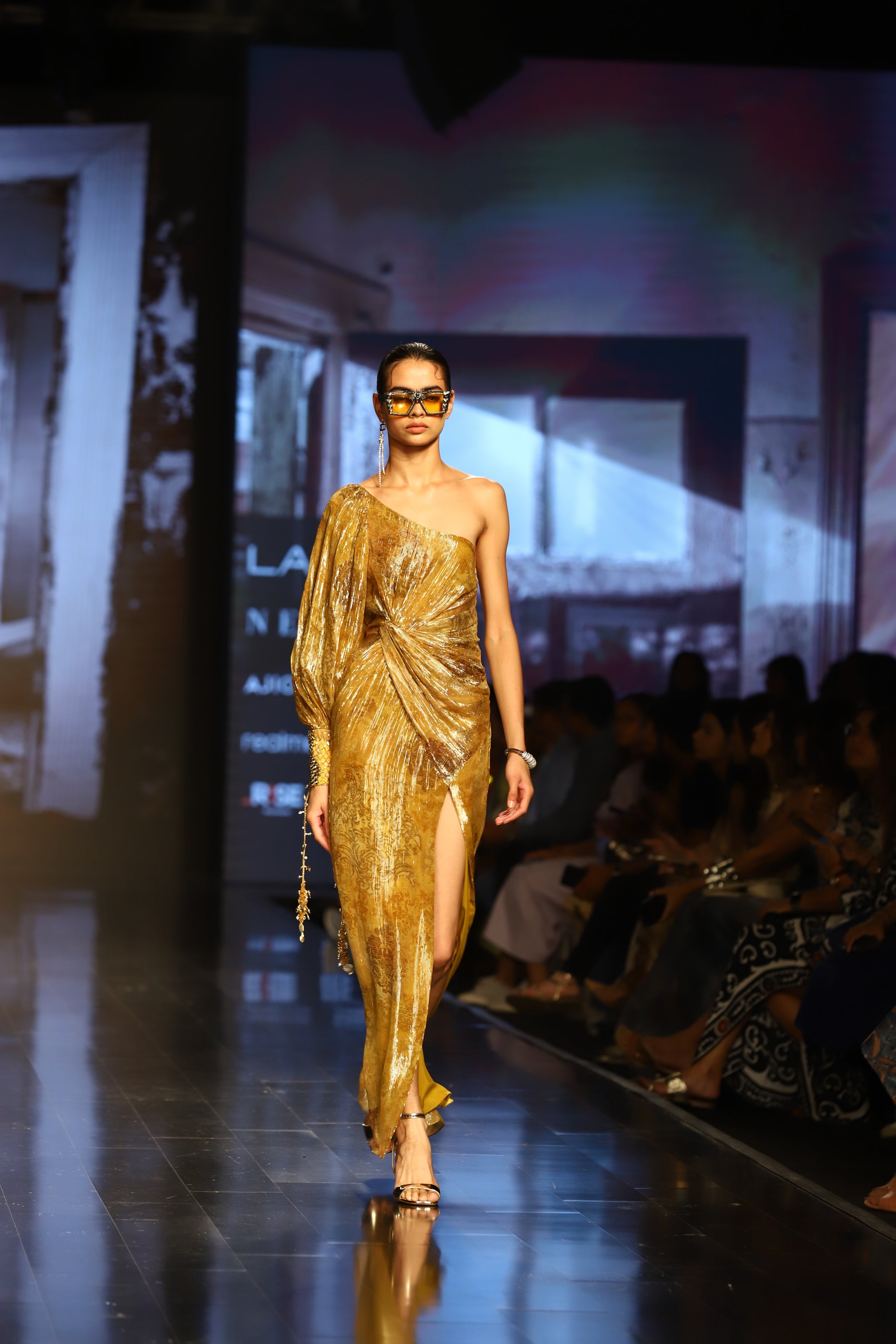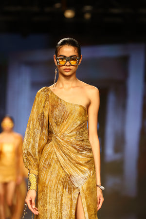 • Dijon yellow one off-shouldered lurex printed dress