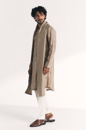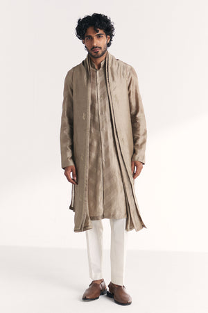 • The set includes grey kurta with delicate hand embroidery paired with ivory chanderi pants. Finished with hand embroidered stole to give elegant look.