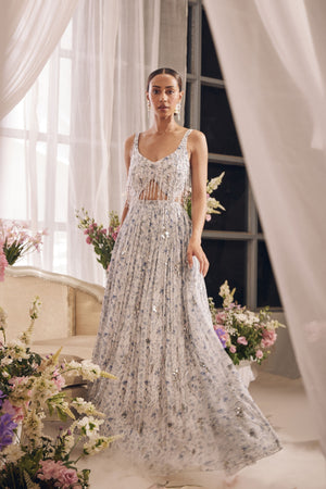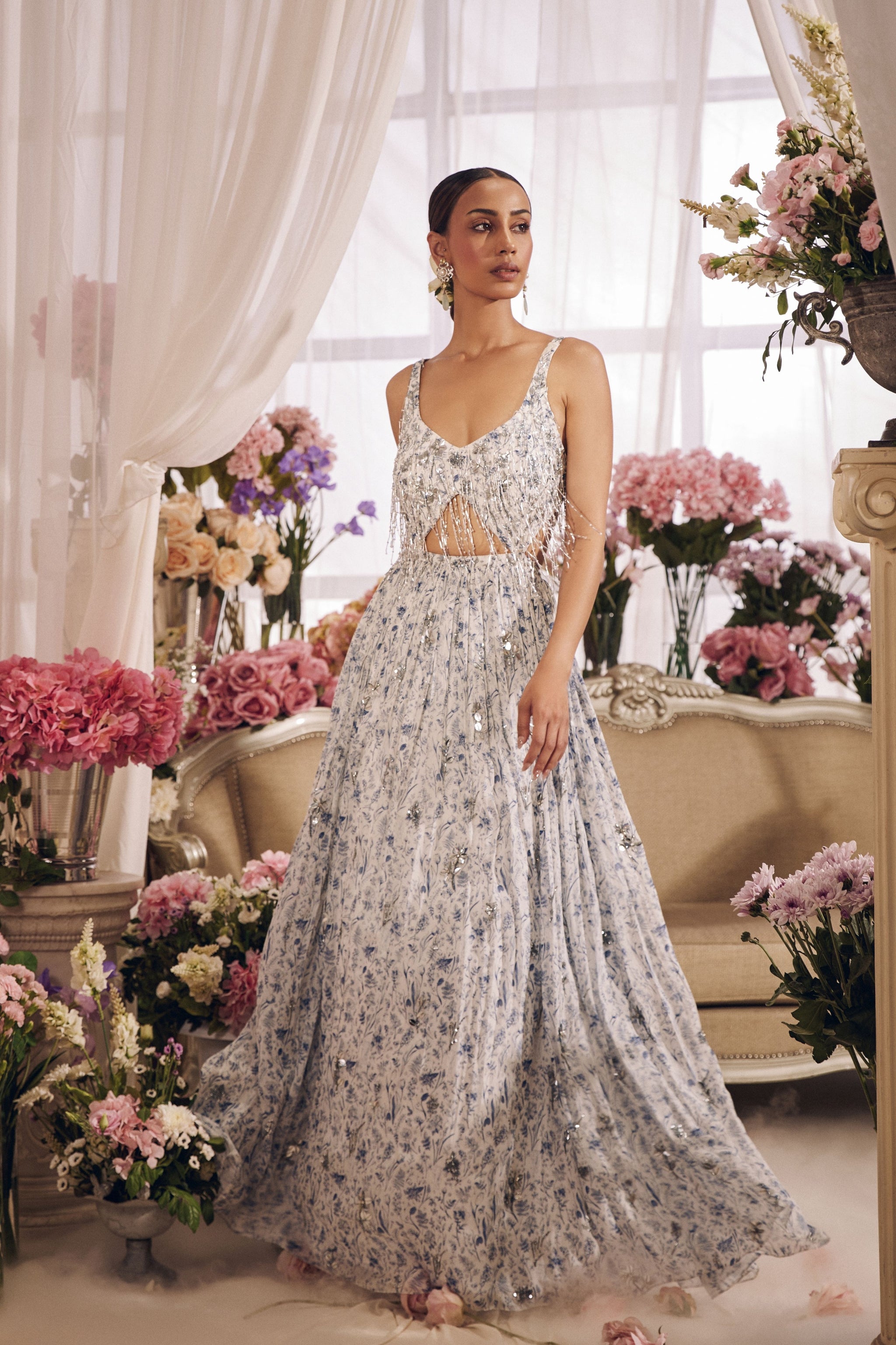 • This indo-western dress is a stunning fusion of traditional and modern styles, featuring beautiful prints, intricate embroidery, and luxurious fabrics. The gathered waist, padded design, and triple layered lining ensure a comfortable, flattering fit, while the crystal hangings add a touch of glamour. Perfect for special occasions!