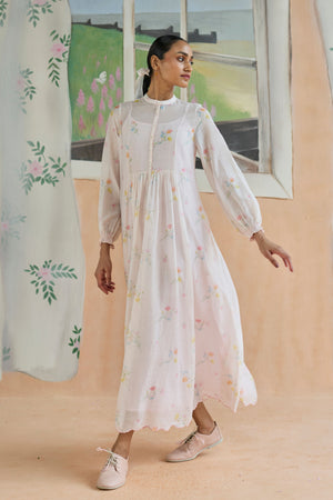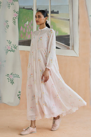 • Pink wildflower maxi dress in silk-cotton is an ode to refined femininity and ease. The pink hue is distinct carrying both warmth and grace. The scattered flowers bring together florals in full bloom, gathered in harmony to create a motif that feels both soft and gentle. Gathered sleeves introduce gentle volume and grace, while scalloped edges trace the hemline in soft, wave-like rhythm. The relaxed fit allows the dress to flow with ease, draping gracefully. Model is 5 feet 7 inches tall and is wearing size small. Dress length is xx inches