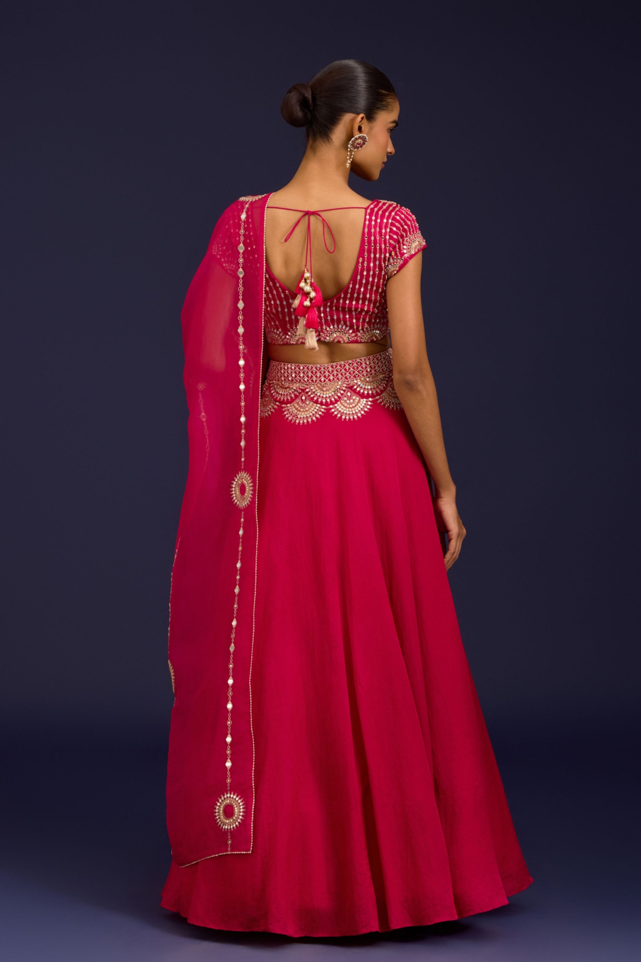• Majestic splendor unfolds in this fuchsia lehenga set, where cotton silk satin meets gajji silk and organza, intertwined with dazzling mirror work, sequins, and dori embroidery that radiates grandeur and sophistication.