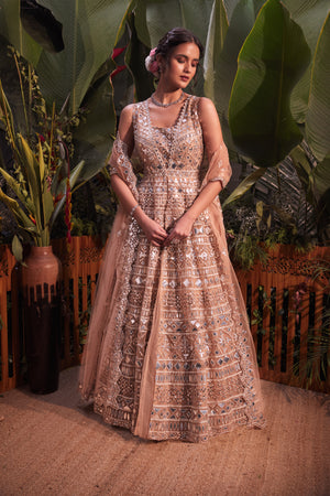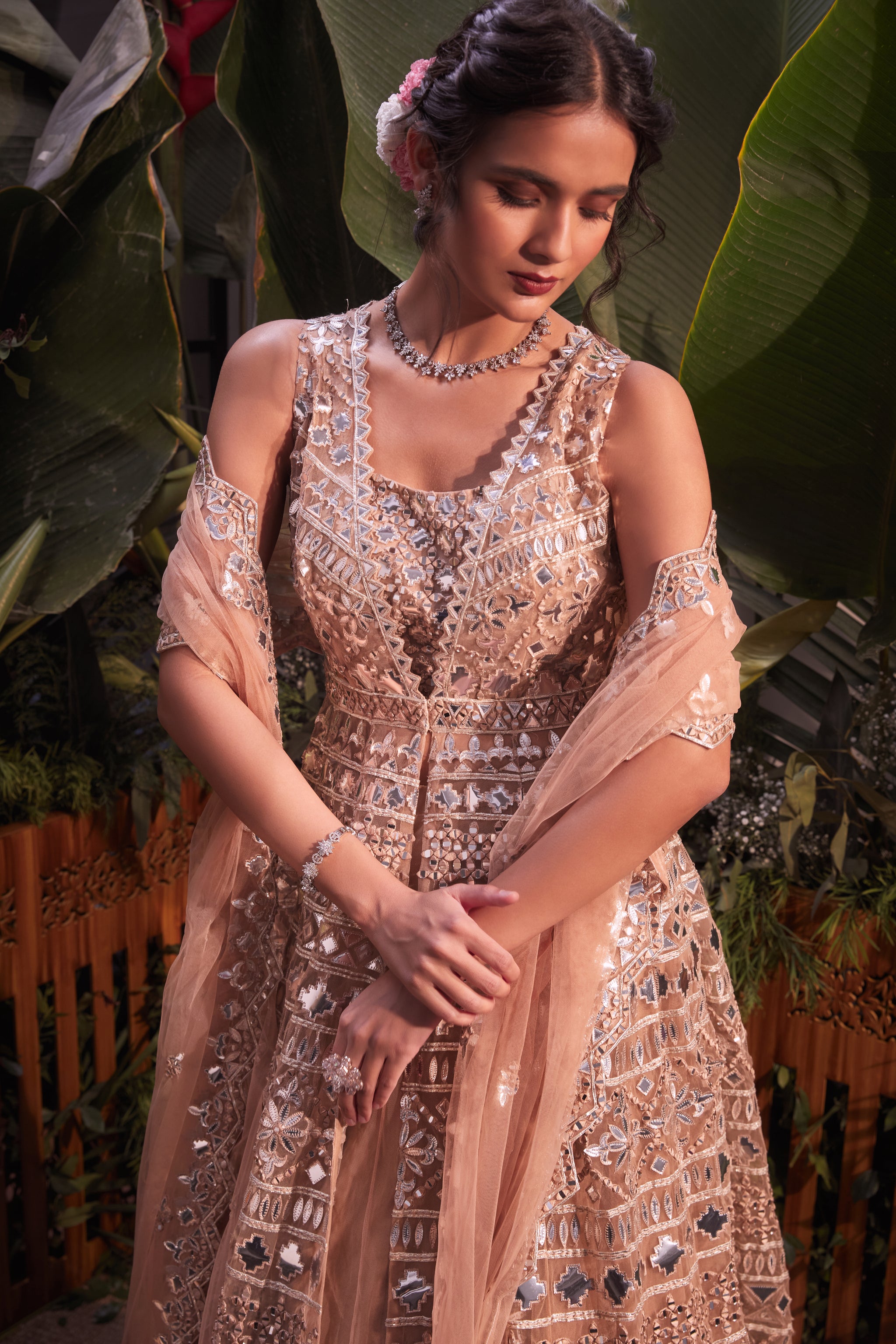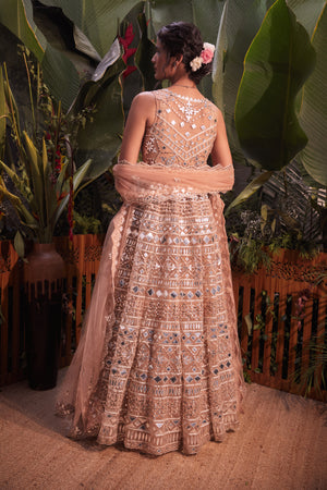• Featuring a gold net jacket with foil and mirror embroidery in geometirc pattern. It comes along with a bustier, net skirt and cutwork dupatta.