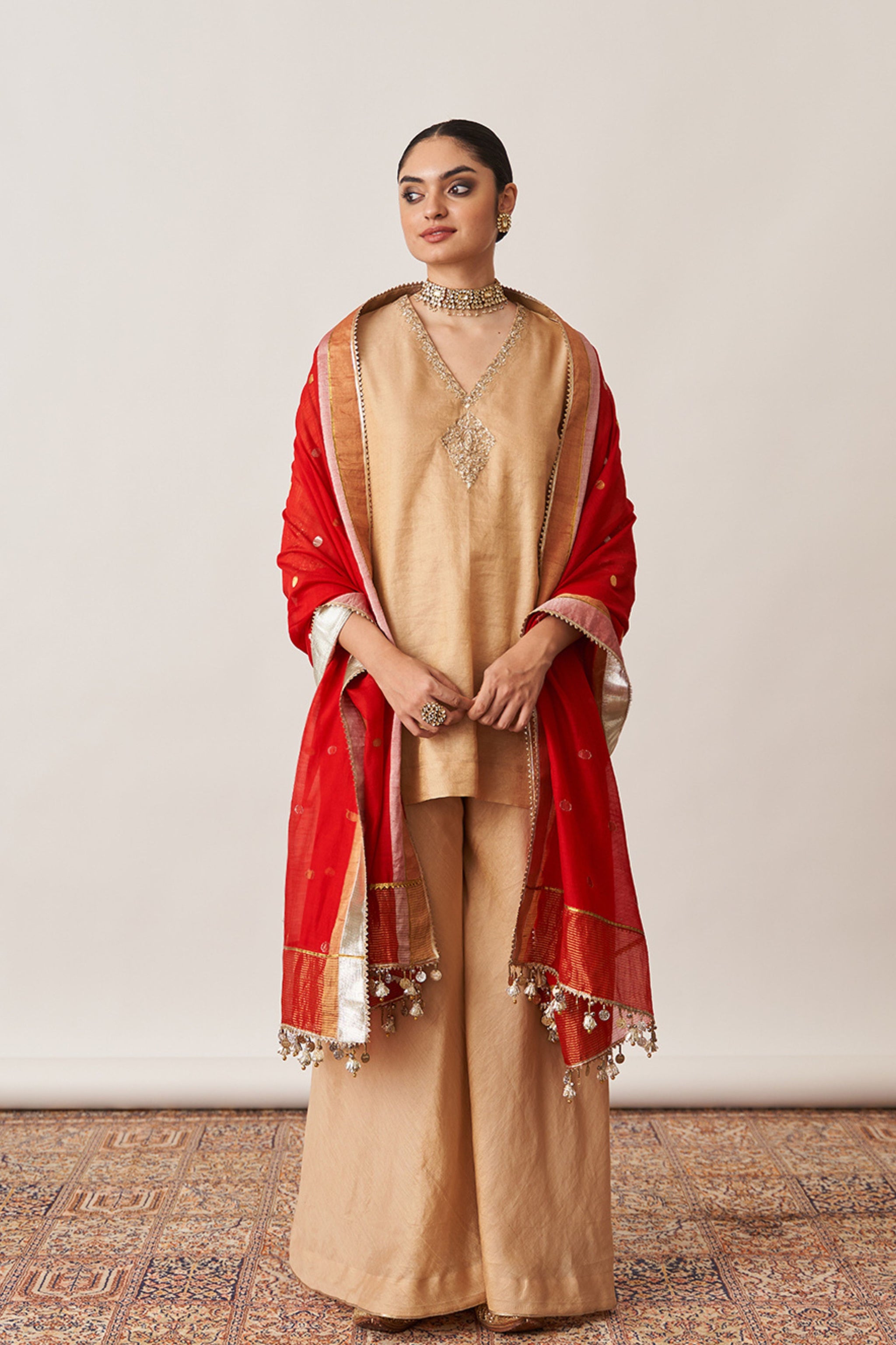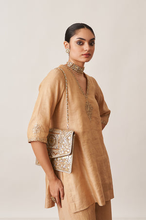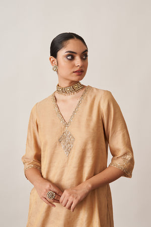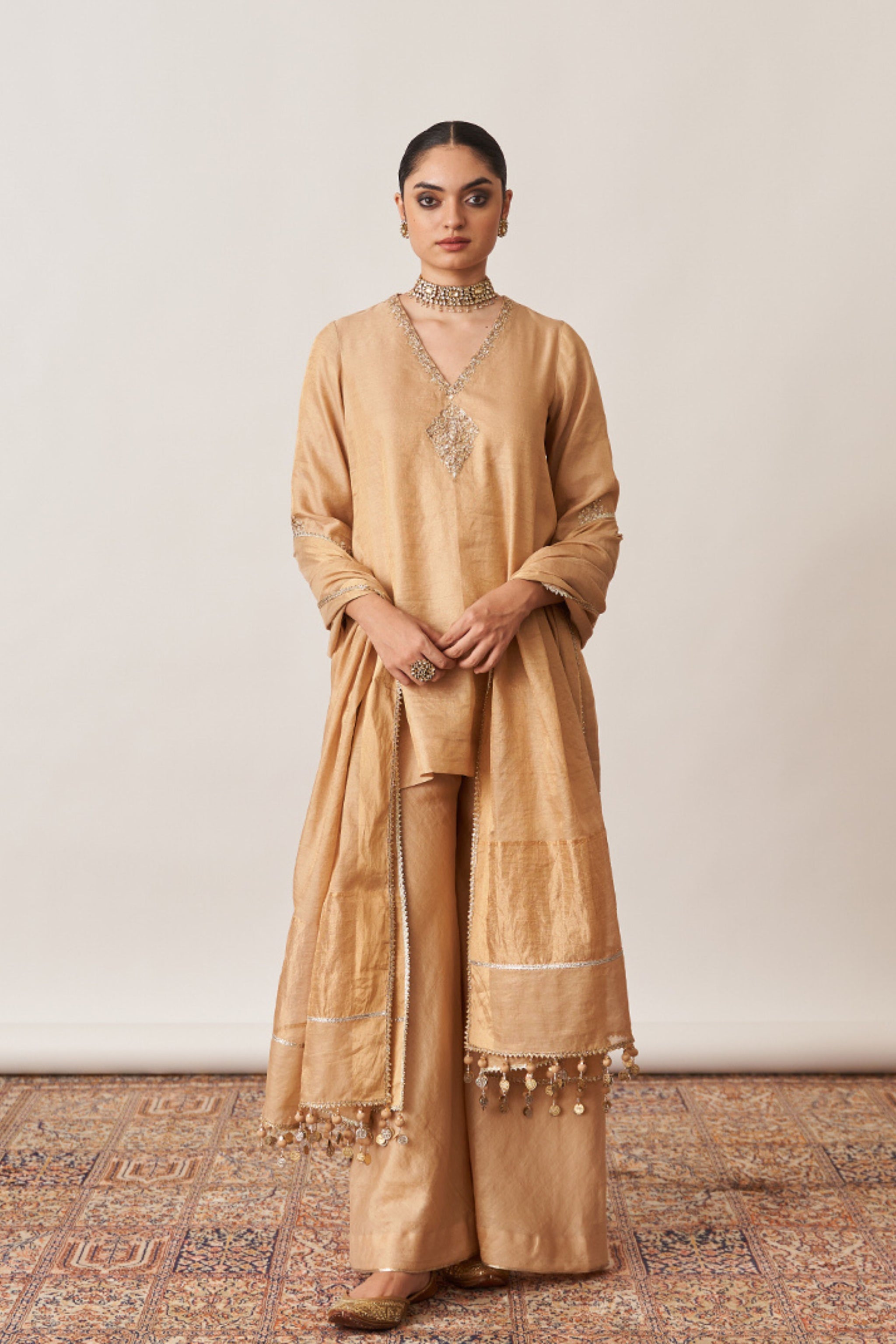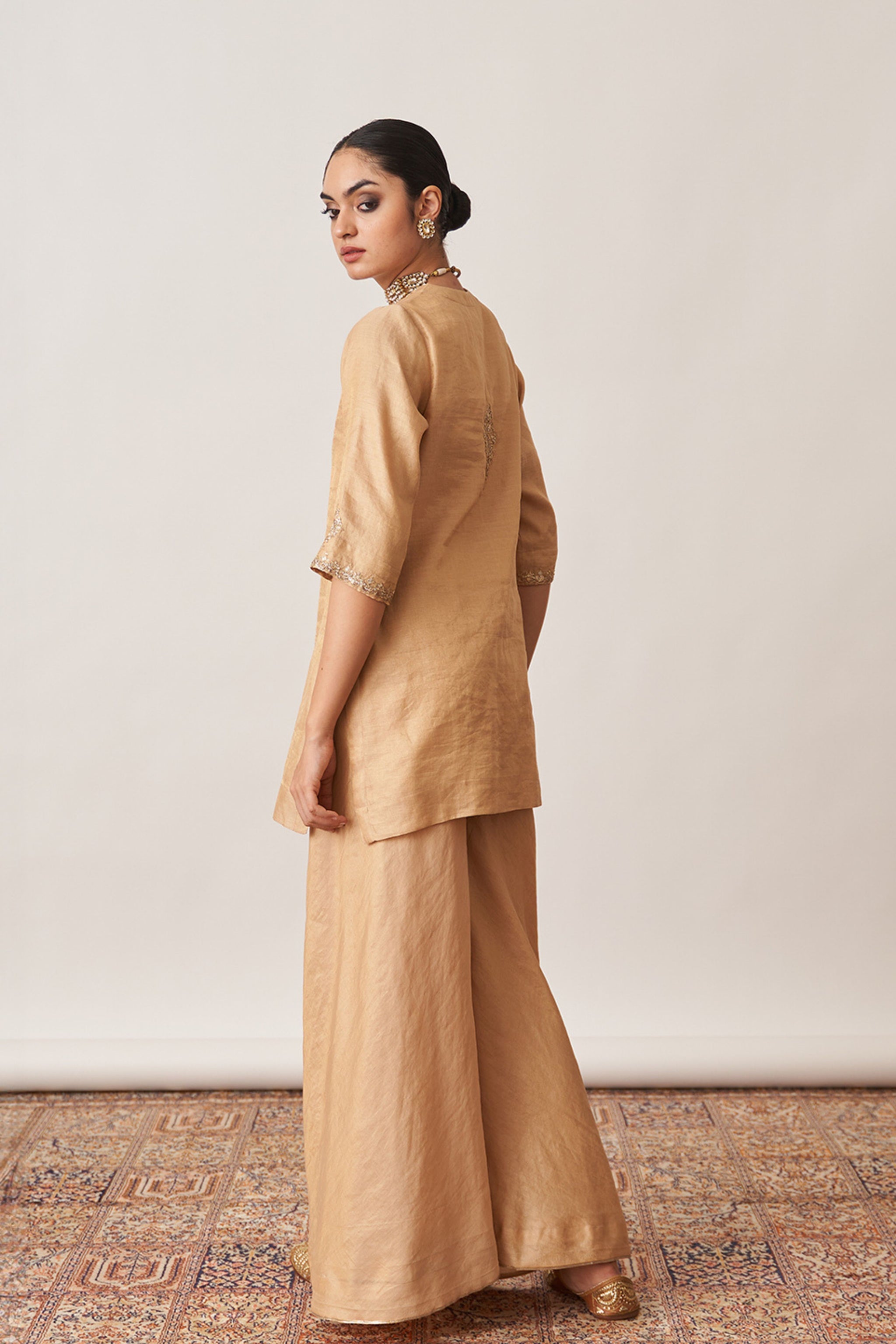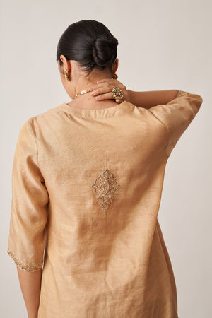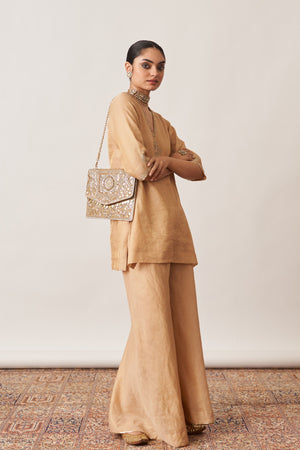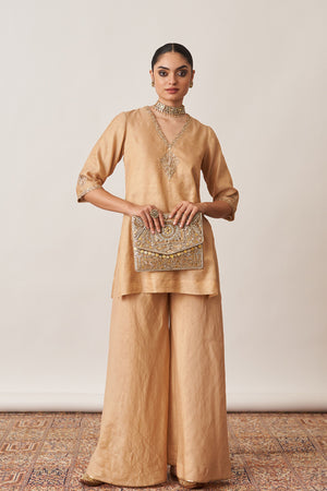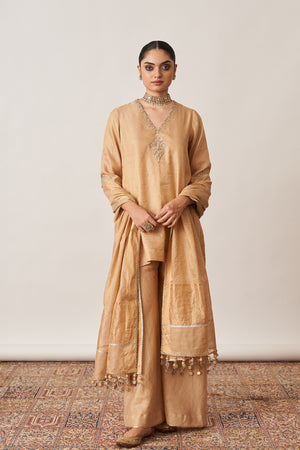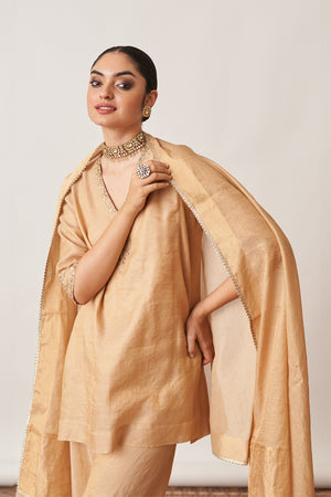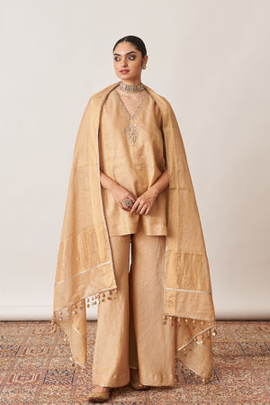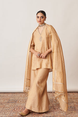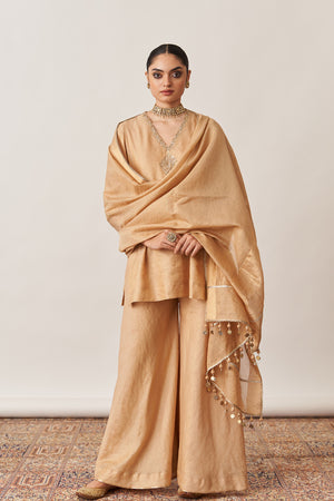 • Crafted for those who appreciate understated opulence, our gold gharara set is made from luxurious handwoven silk tissue chanderi.