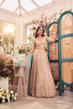 • Heavily hand embellished with cut dana and sequins work in floral pattern all over. Designed with sweetheart neckline and sheer back with zip closure. It comes with a matching net dupatta with embellished all over.