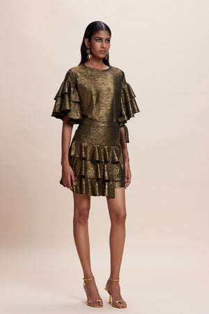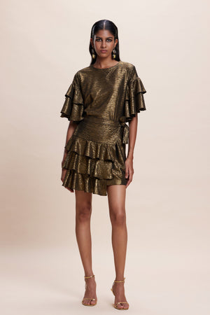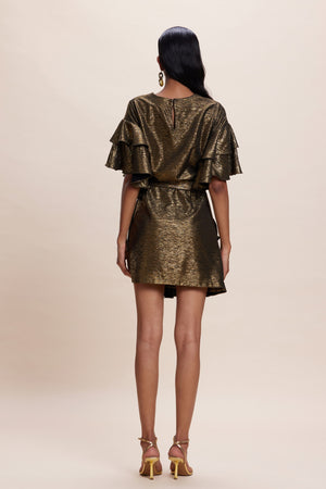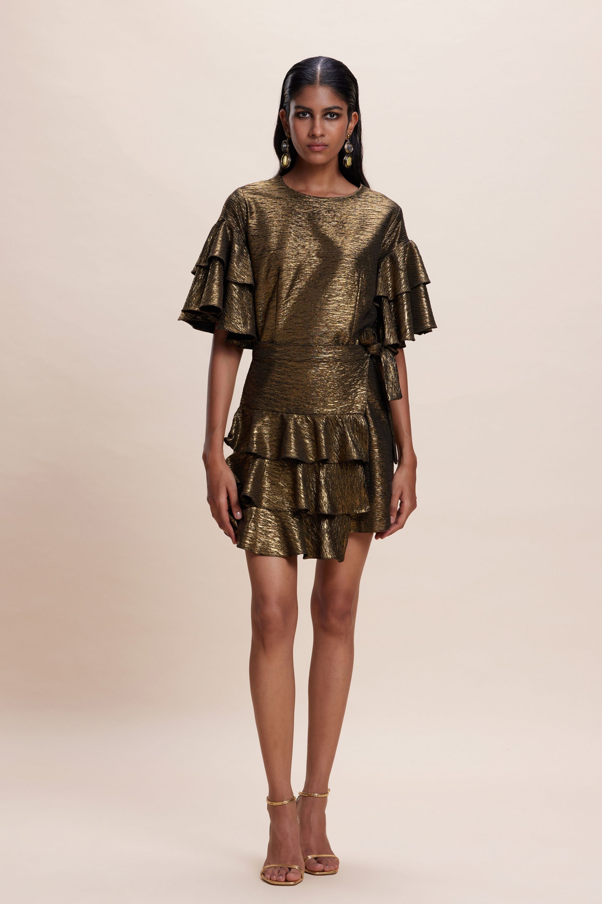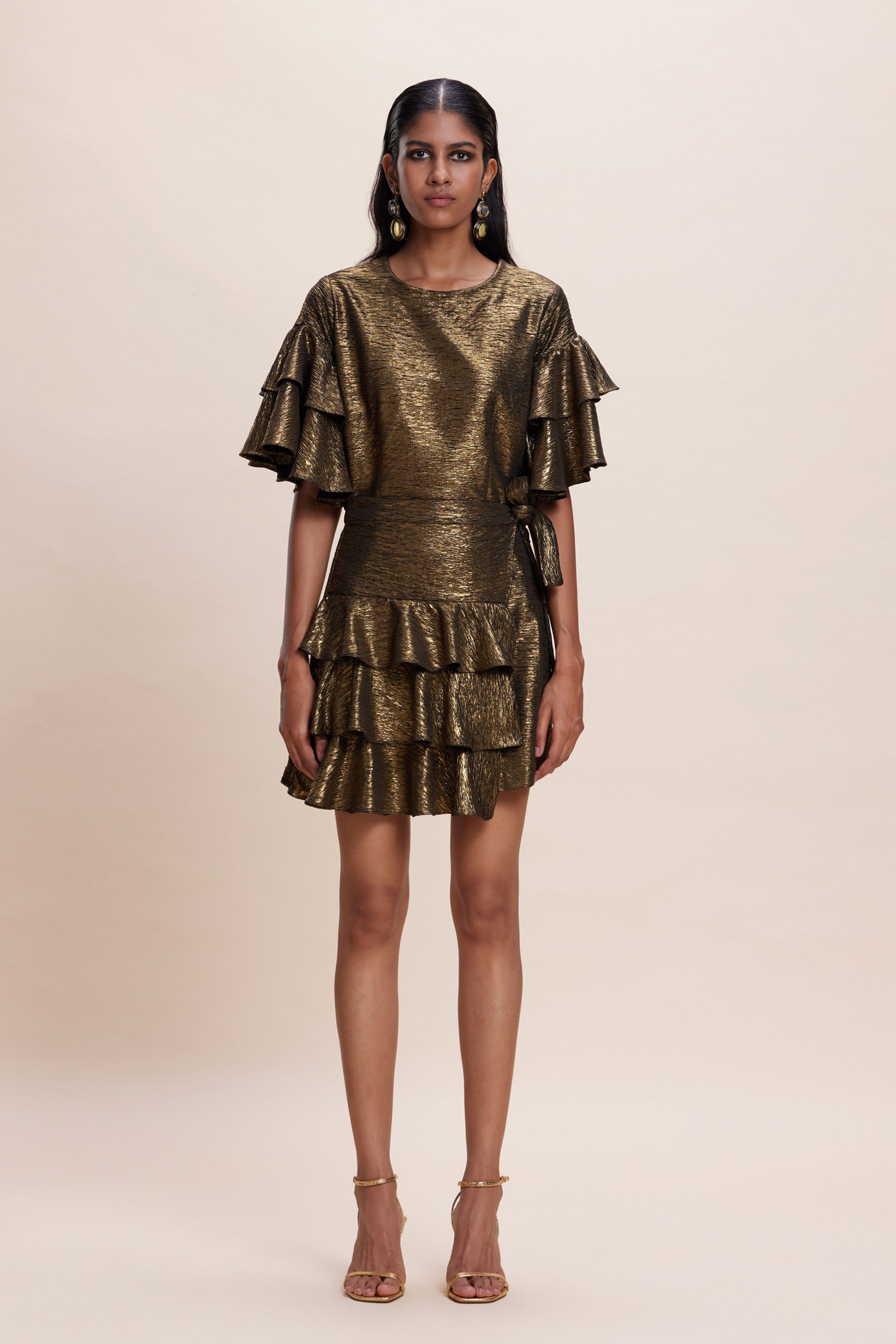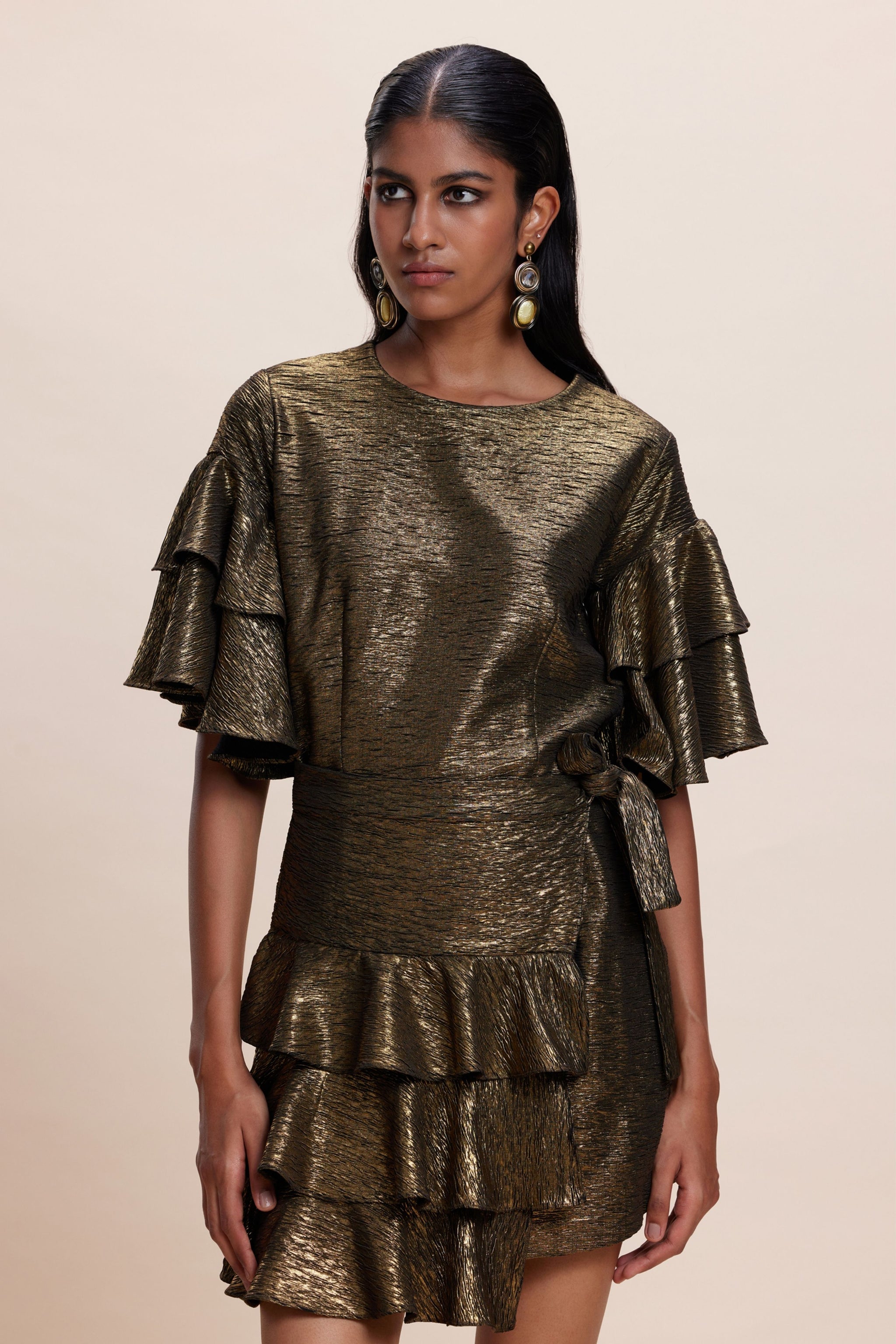 • Sparkle and shine in our golden wrap dress with flared sleeves! Designed to blend chic sophistication with vibrant fun