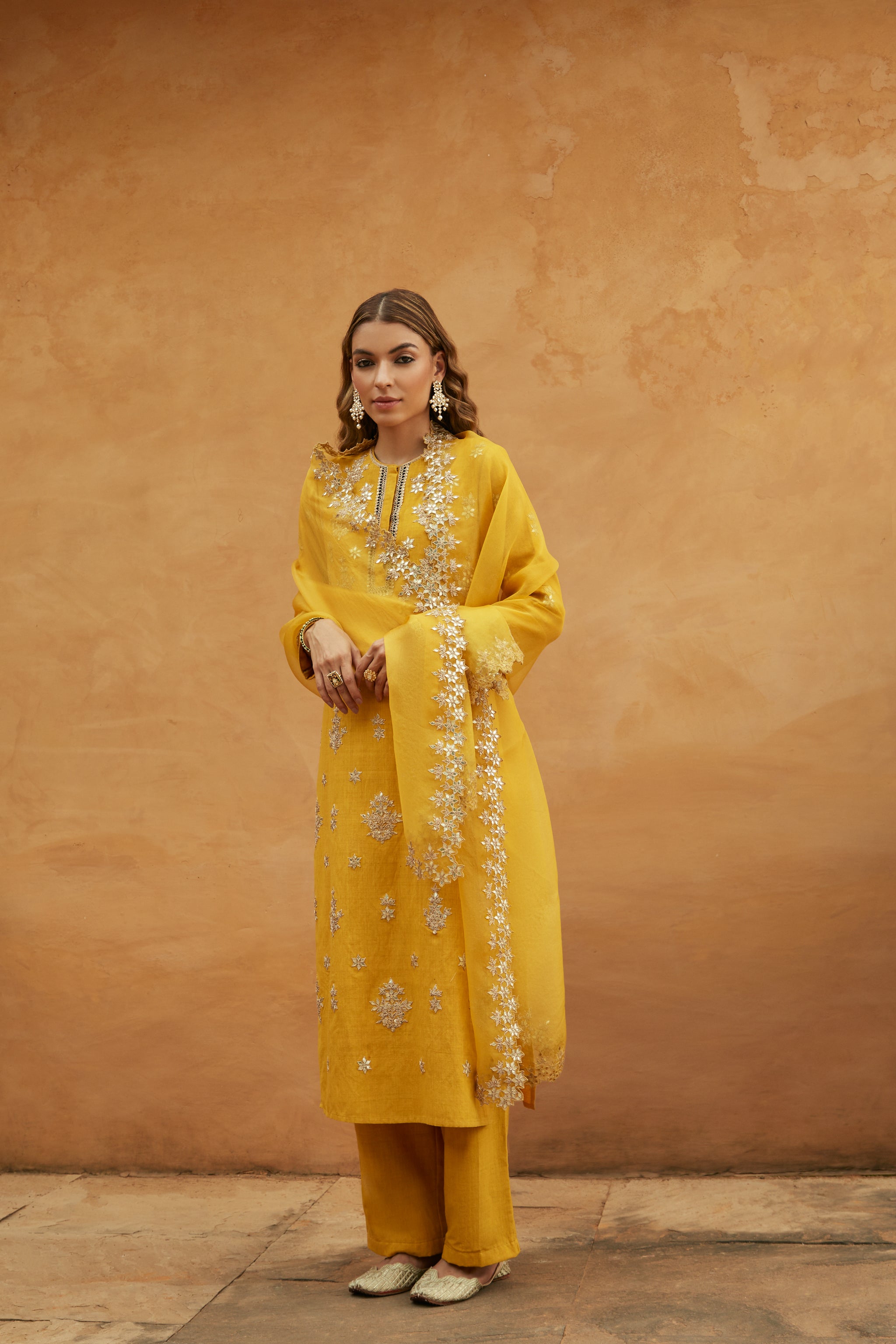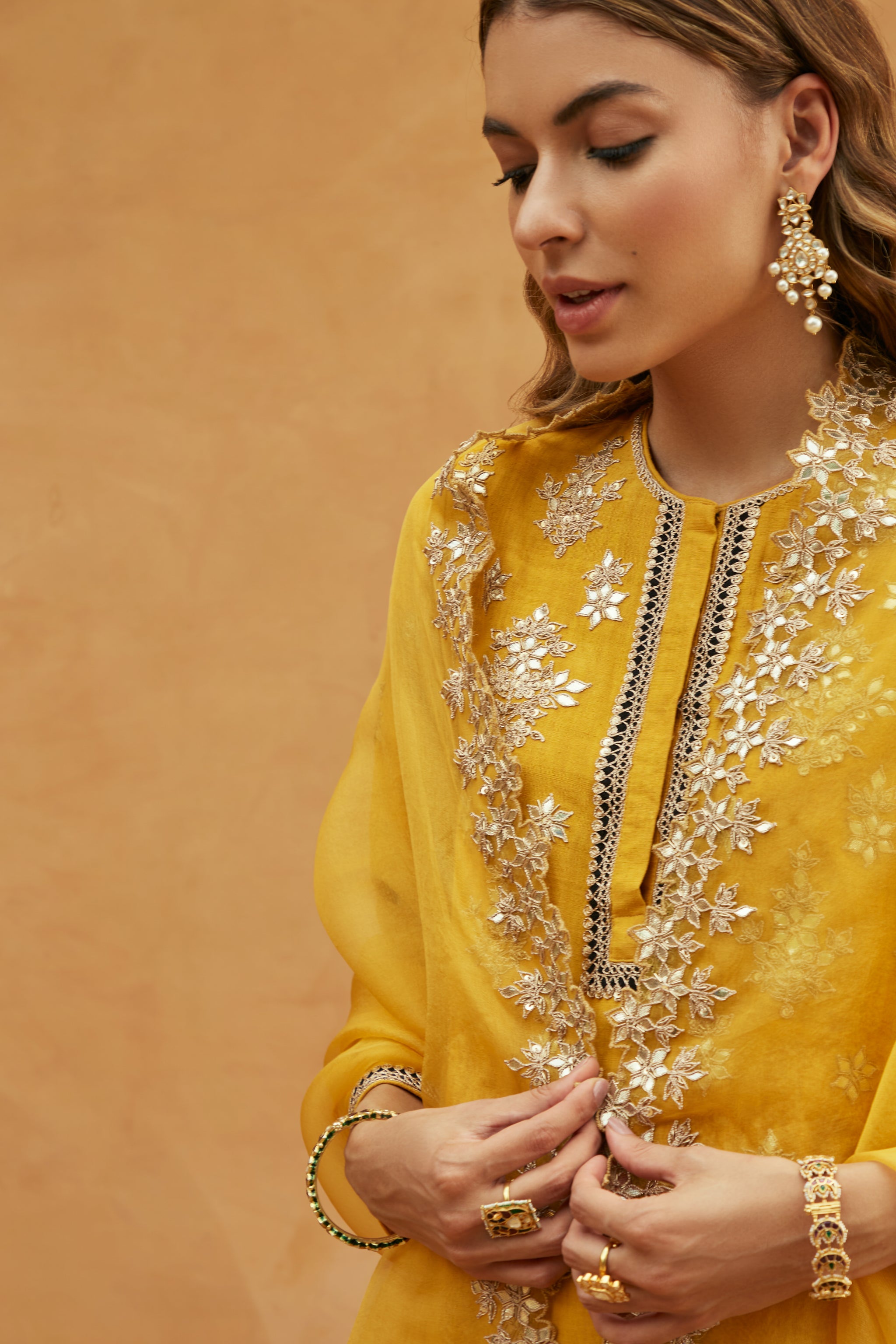 • This cotton matka silk kurta has all over intricate gota work with contrast dori work borders. It comes with matching pants and beautiful gota cutwork organza dupatta