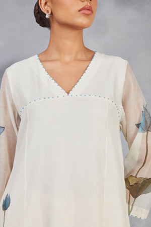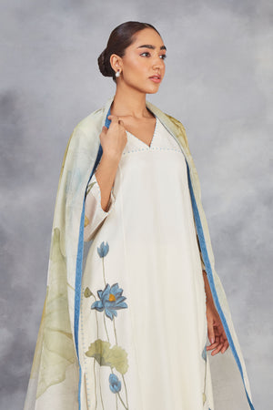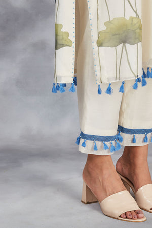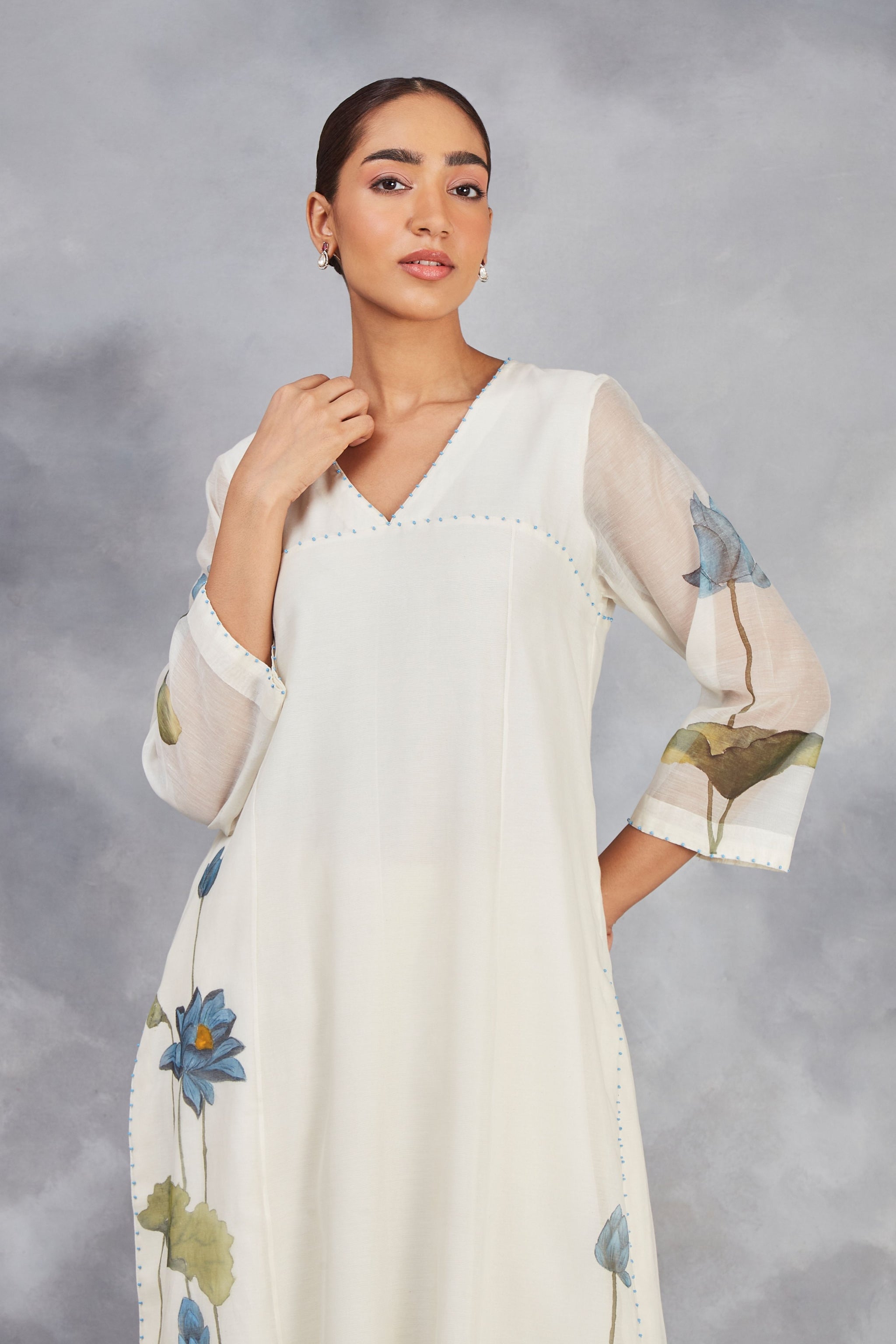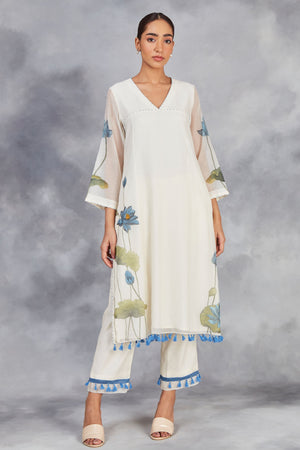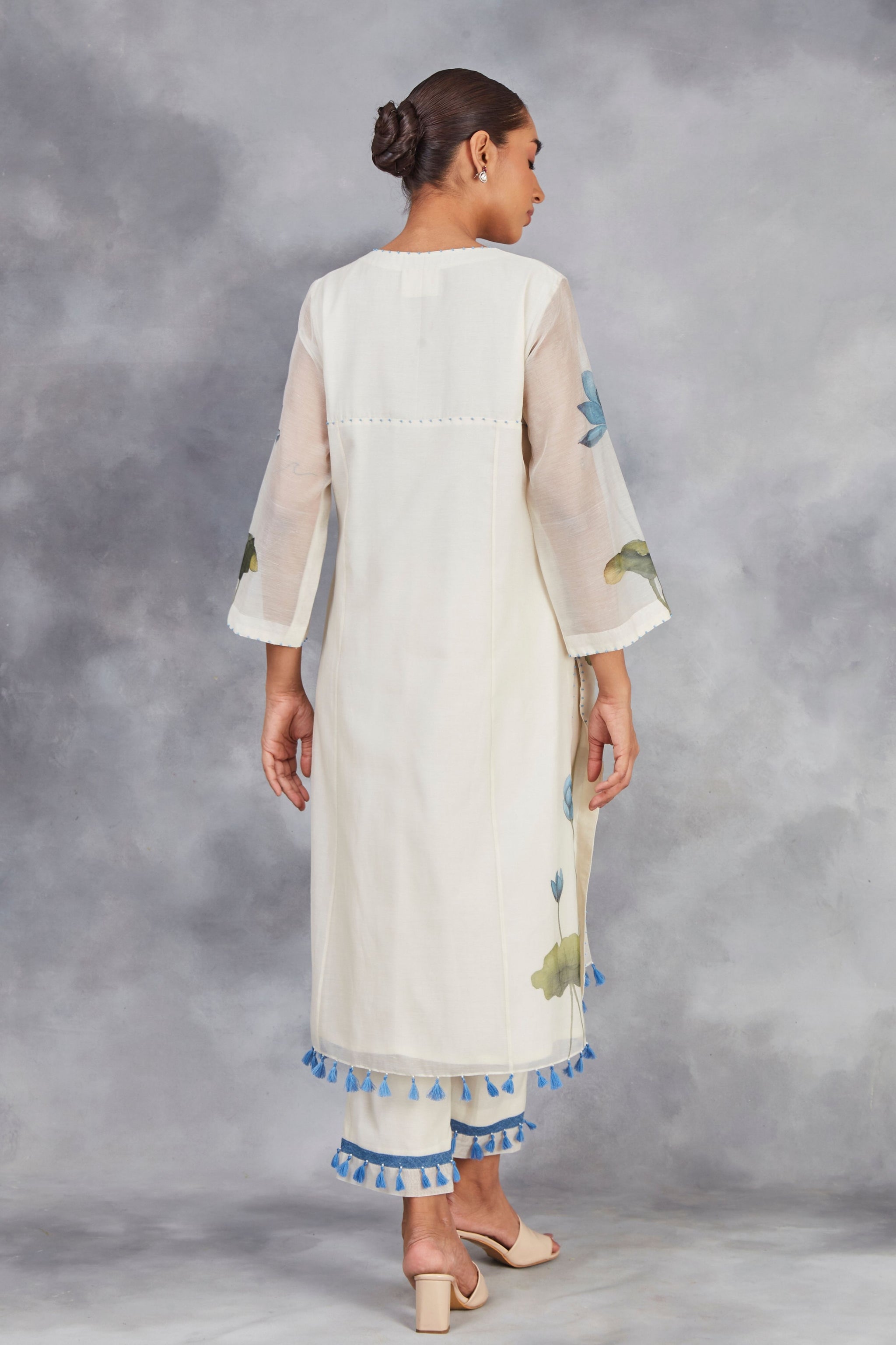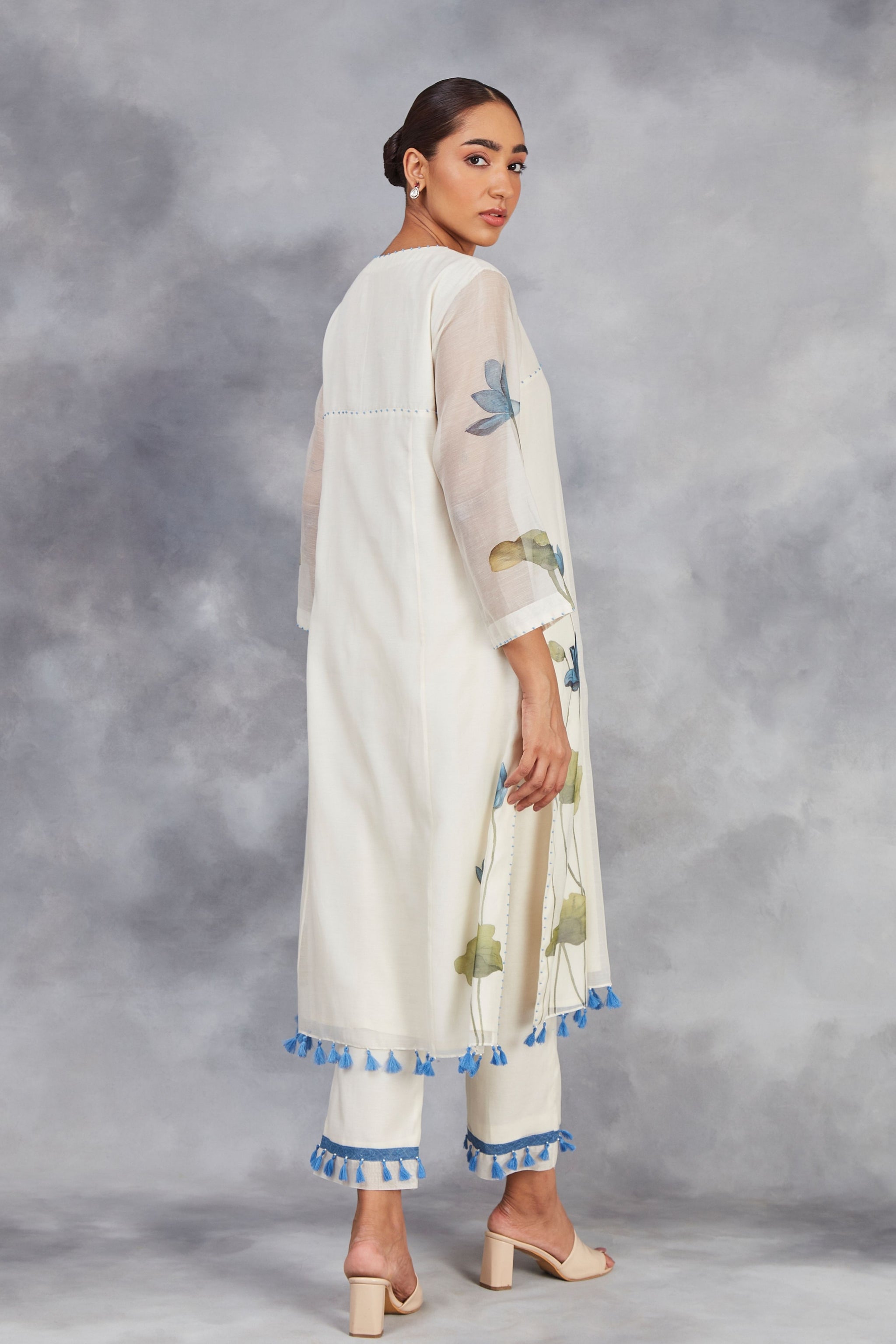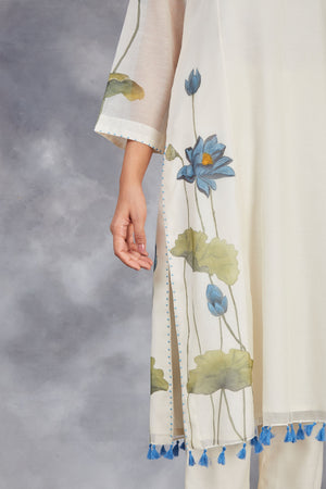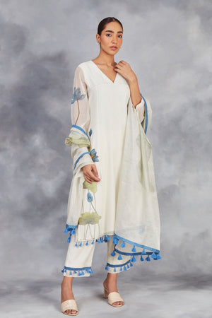 • Embrace elegance with this off-white handwoven chanderi mulmul kurta set. Featuring a v-neckline and three-quarter sleeves, the long kurta comes with a pair of matching straight pants, and a handwoven cotton tissue dupatta. All adorned with exquisite hand-painted lotus flowers, cotton thread tassels, and pearls.