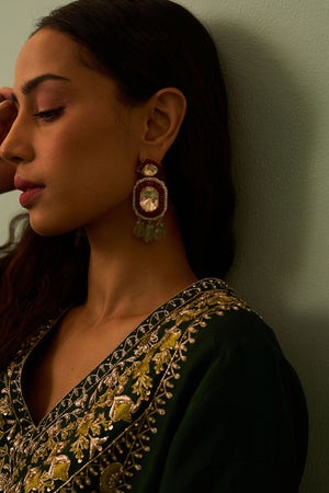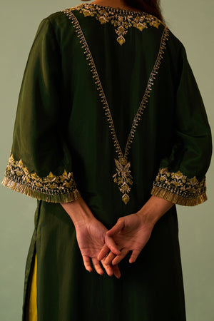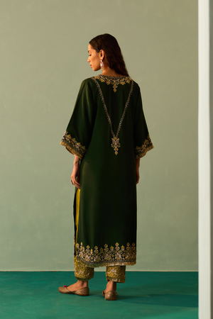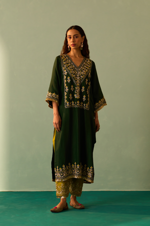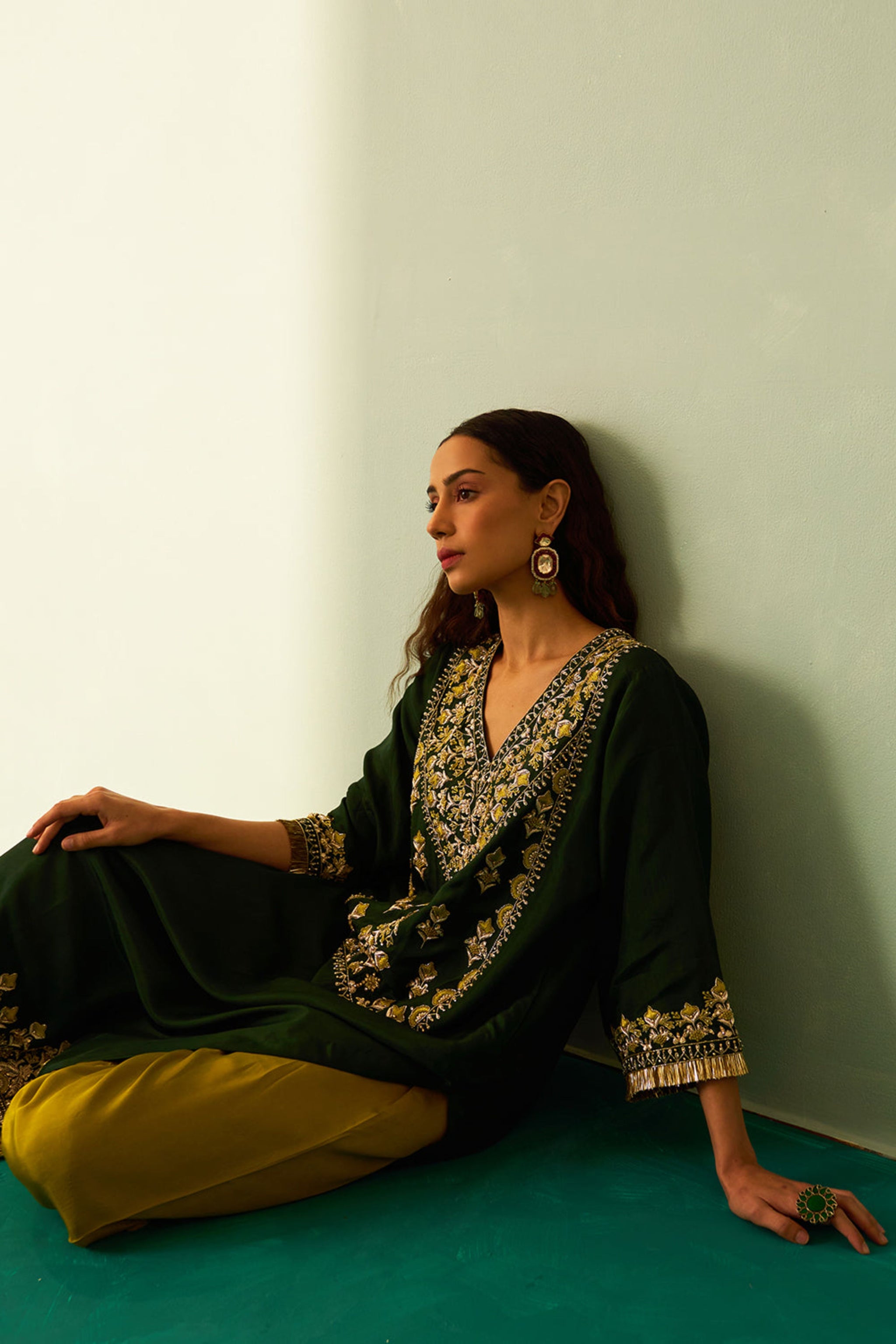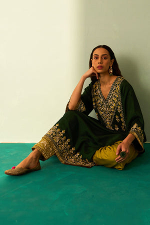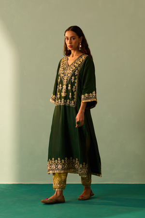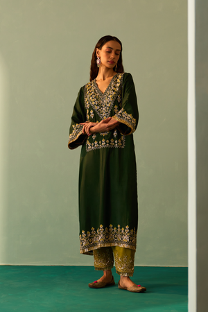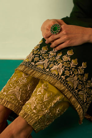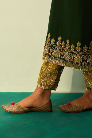• A Green choga paired with light green palazzo pants embroidered with silken threads, dabka, sequins and cutdana uisng the traditional zardozi technique.