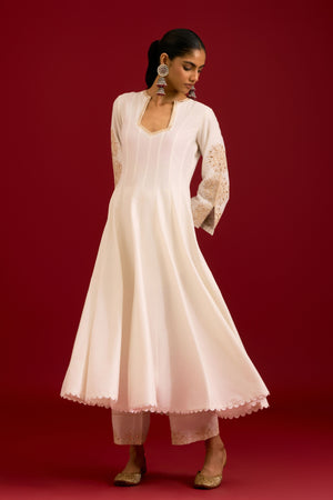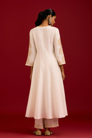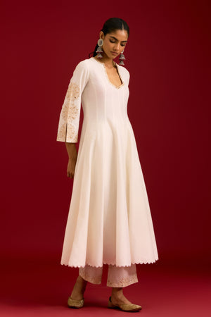 • This beautiful ivory anarkali boasts intricate dori embroidery, mirror work, and sequins on a rich cotton silk blend, paired with a shantoon palazzo and a dupatta with delicate dori embroidery and hand block prints, exuding classic charm.