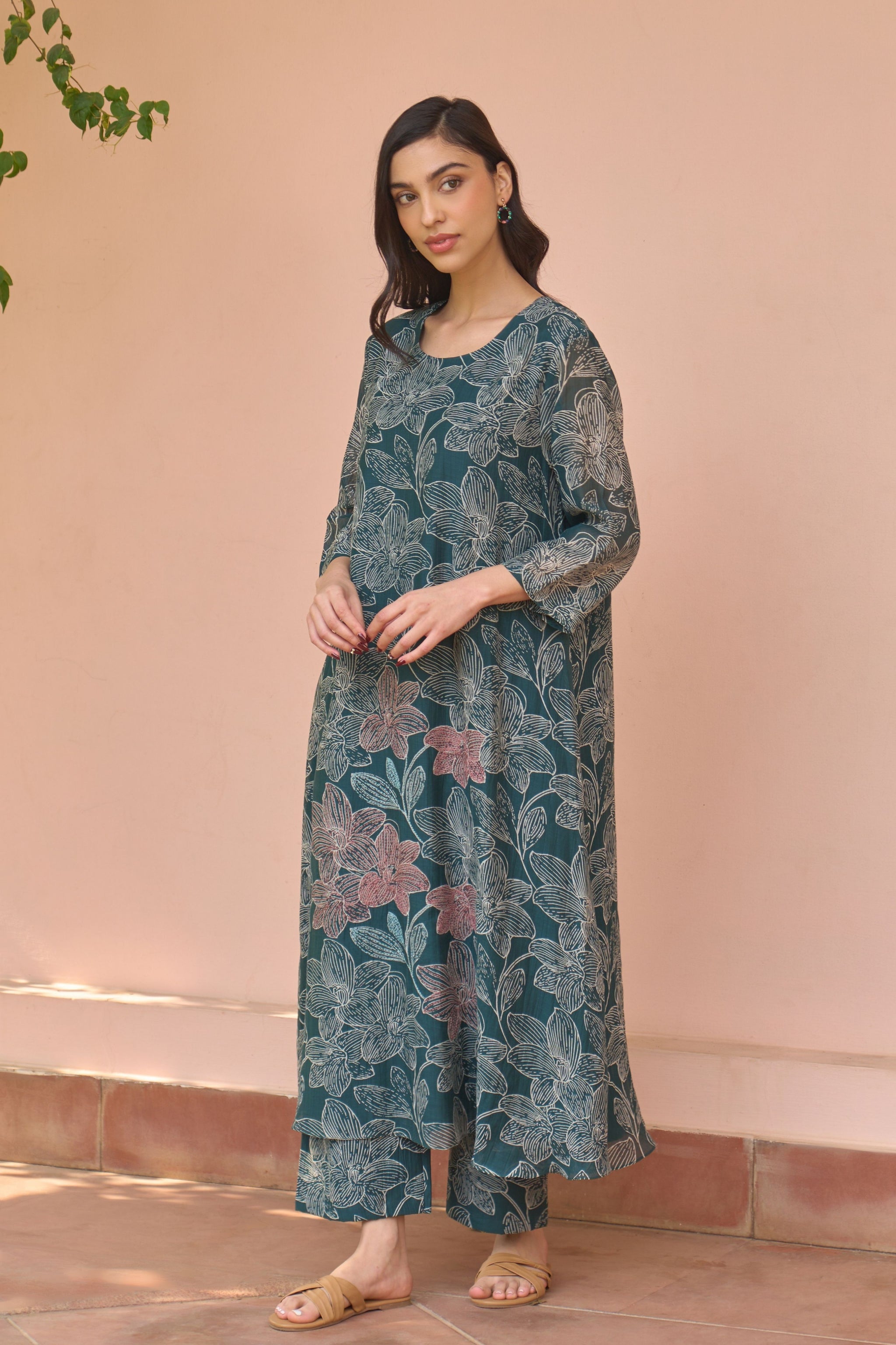 • The jade bloom tunic set showcases a striking floral print on the kurta, accentuated with contrasting thread embroidery. Paired with coordinating pants, the ensemble offers a refined and effortlessly elegant look for the season.