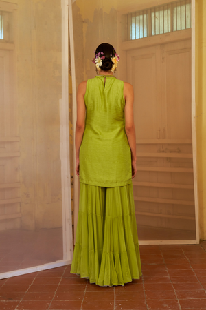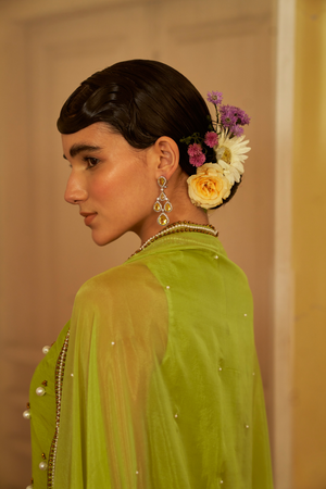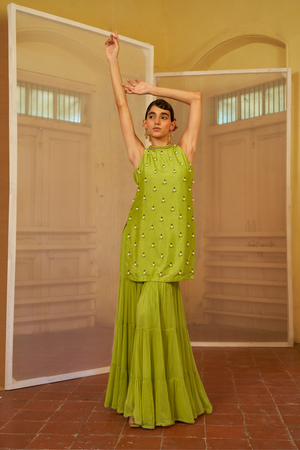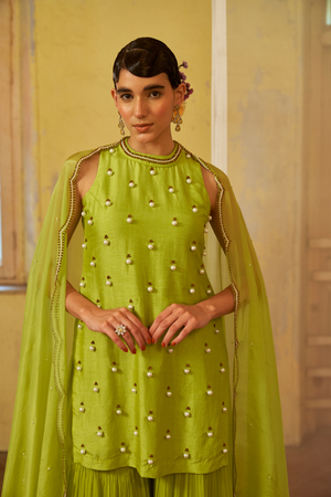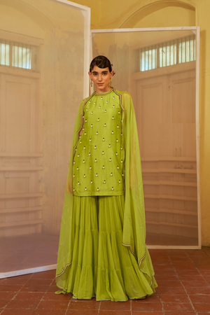 • Indulge in the vibrance of our lime green kurta ensemble, where contemporary elegance meets timeless tradition. The kurta, adorned with intricate pearl drop embroidery, exudes opulence and grace. Paired perfectly with a georgette tiered sharara, this ensemble is a celebration of movement, color, and exquisite craftsmanship. Ideal for festivities, cultural events, and joyous occasions that demand a touch of sophistication.