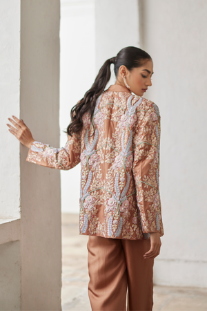 • This jacket set comes with a sequins waistcoat and plain silk pants. It’s beautifully embroidered in colours of pink and lilac and sea green. Its perfect for weddings and special occasions. The colour macchiato brown is warm and inviting and the cut is double breasted classic style ideal for all body shapes and ages. The pants are in light silk twill fabric in straight cut with side pockets and relaxed yet complimenting fit. The sequins waistcoat is stylish and complimenting to all shapes and sizes, its unique and makes your outfit complete for any special occasion. Betrue jackets are statement pieces and versatile. Don’t forget to use your creativity and style them multiples ways:)