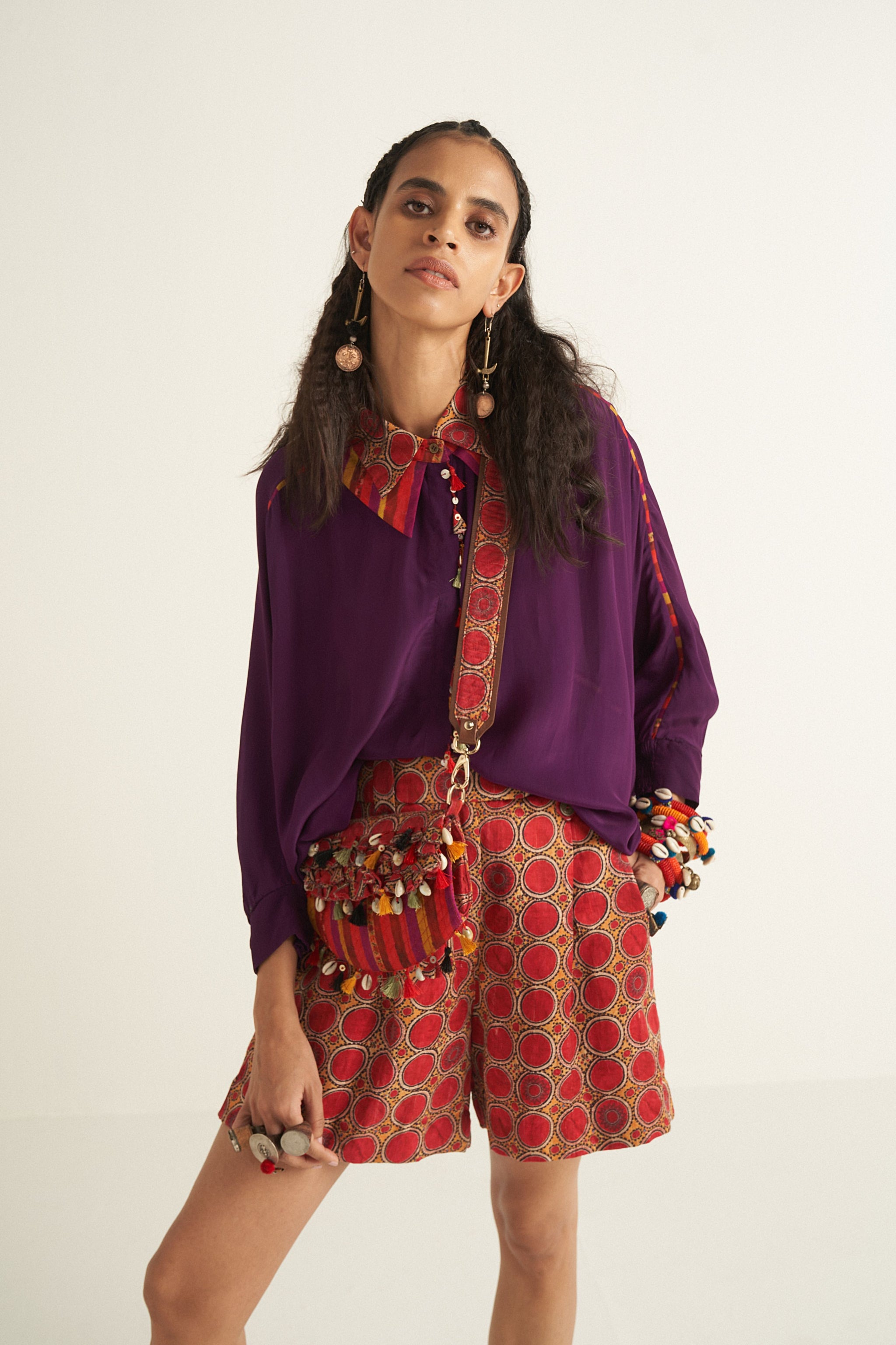 • Trapeeze shirt with seam inserts and double collar paired with printed shorts.