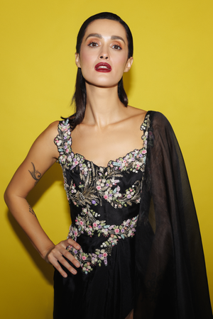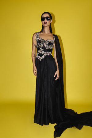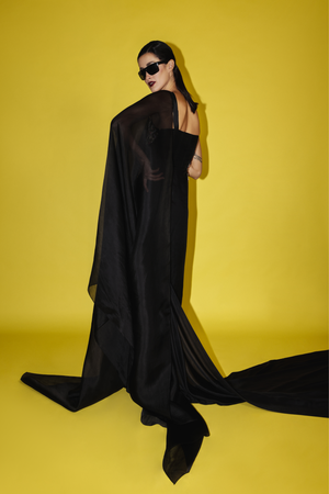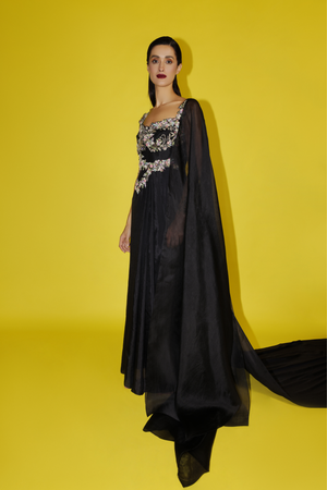 • Hand embroidered & appliqued silk draped dress with front pleats and organza trail.