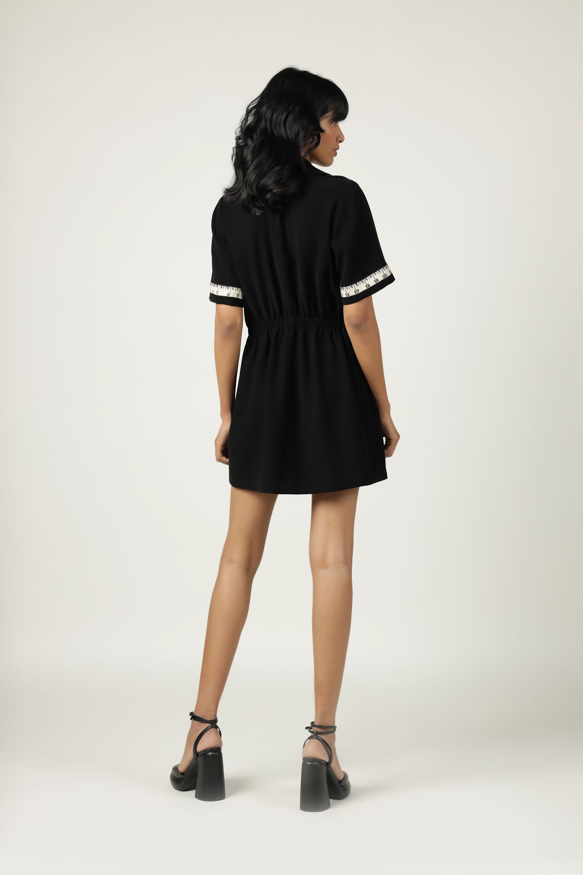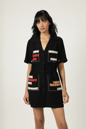 • Summer coat dress with measuring tape applique embroidery.The garment has coat collar,fabric covered buttons,pockets,black leather shoulder loops,an elasticated waist and top stitching details on the pockets.It also has contrast folder piping inside coat dress.