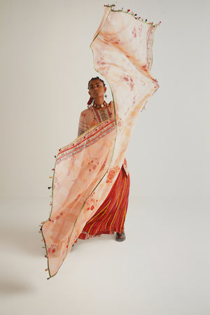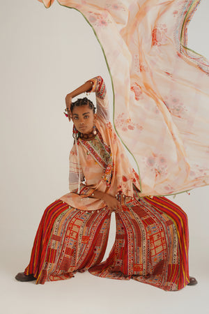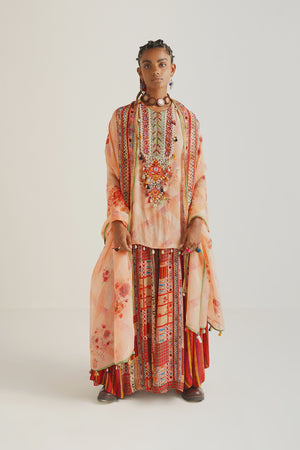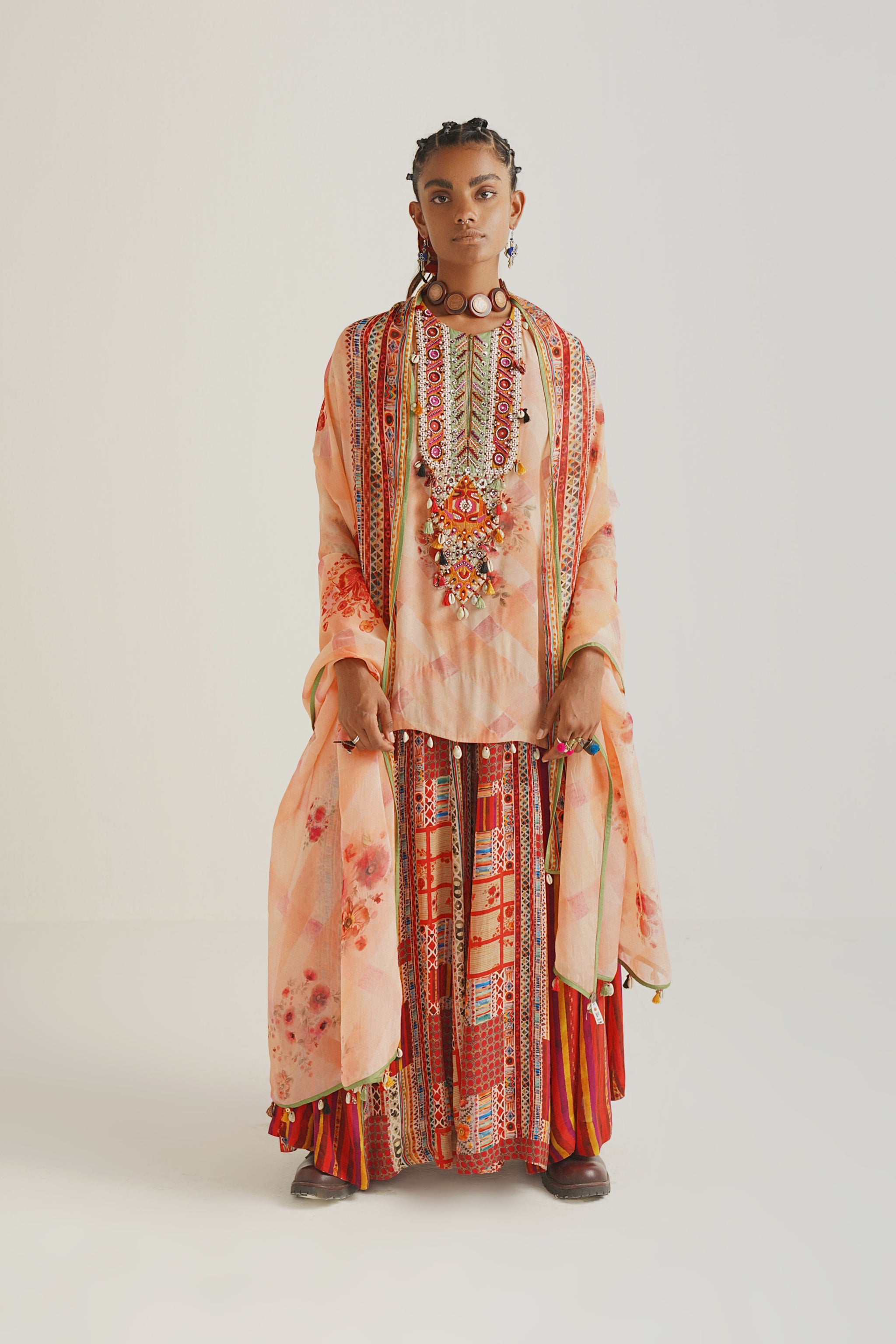• Relaxed fit mitra short kurti with embroidered yoke and tribal tassel detailing on front neck paired with drape trouser and printed dupatta.