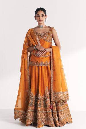 • Mor mustard lehenga consists of three pieces from which the lehenga adorn with heavy and intricate hand embroidery with the cutwork at the hem. The koti handwork consist of various techniques and material. Dupatta with this set completes the look and elevates the elegance.