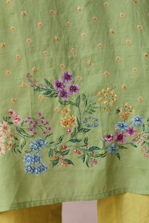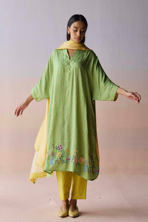 • The morning whisper kurta set holds the hush of early hours, when light filters gently through leaves and the world feels tenderly awake. Its green tones echo the freshness of nature, quiet yet full of life. Handspun in malda silk, the kaftan-style kurta features a graceful creeper print along the front, delicately highlighted with sequins and beads for a subtle shimmer. Its flowing ease is paired with contrast pastel-yellow pants, a soft balance that completes the ensemble with understated charm. Pair it with the soft radiance yellow dupatta to complete the look. The model is 5’7″ tall and wearing xs size.