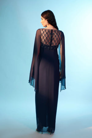 • Dazzle in this embroidered draped dress with crystals and bead tassels.