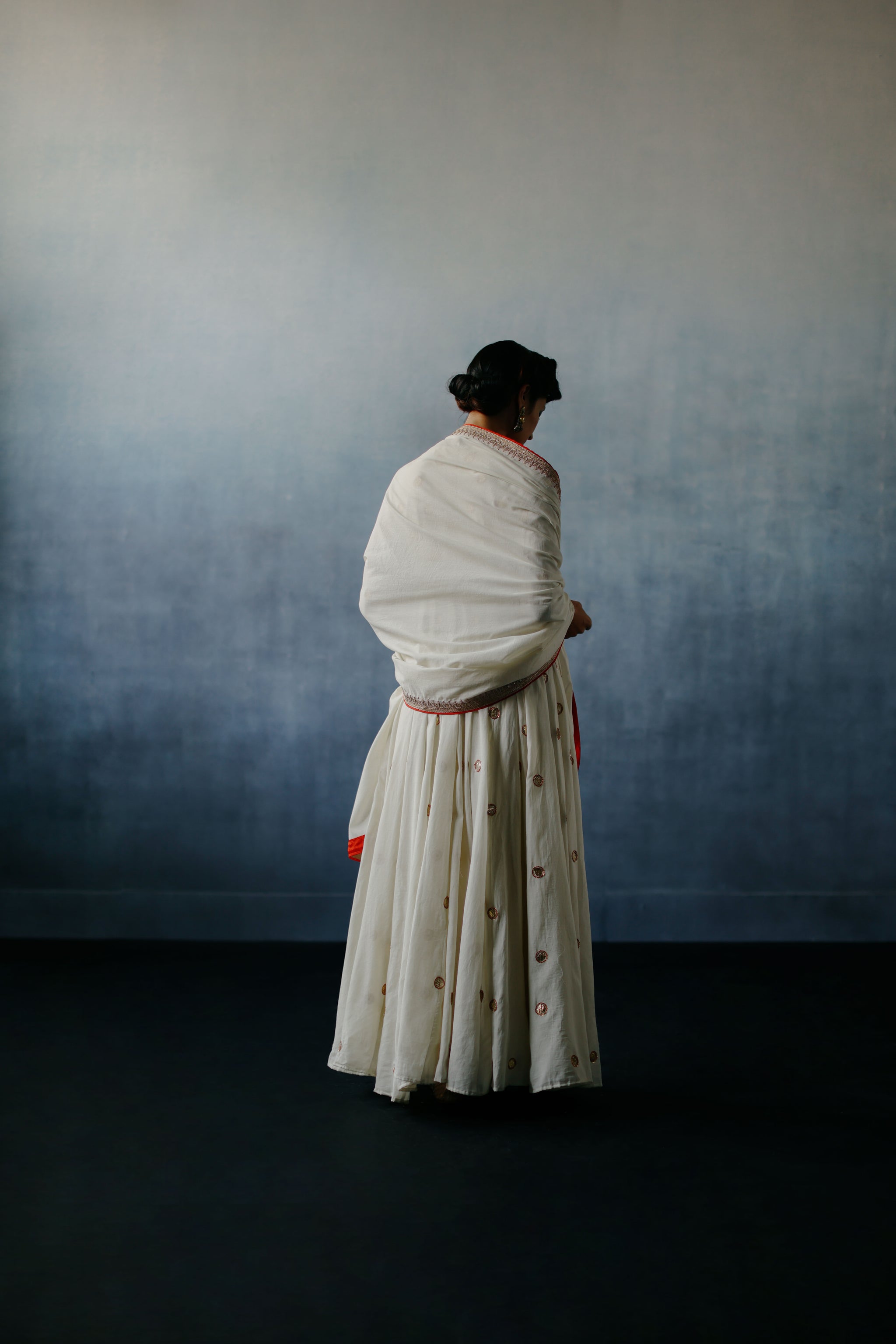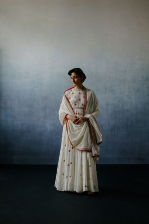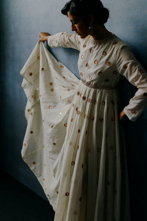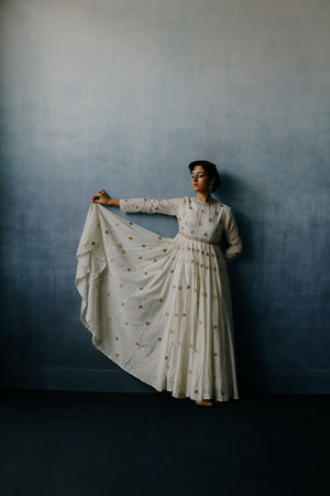 • This white anarkali is cut in handloom muslin cotton. Has all over gota work , it has dori work on neckline and waistline. It is paired with dori work dupatta.