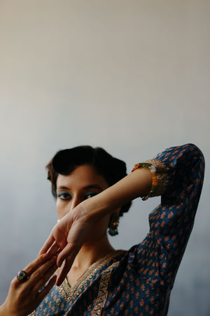 • This fadat printed short kurti and dori work and resham detailings. It is paired with dhoti pants