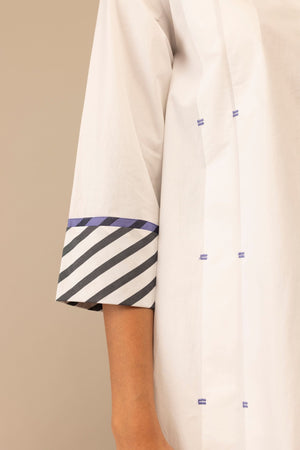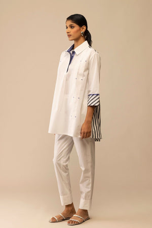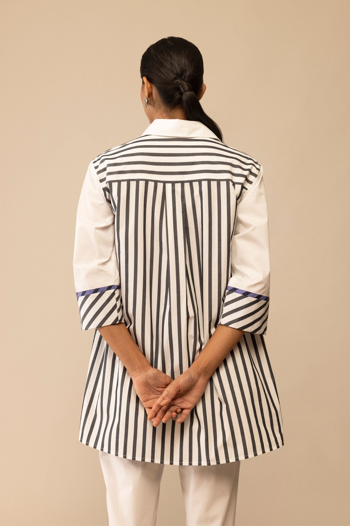• Elevated everyday wear—this relaxed co-ord set is crafted in crisp cotton poplin. The tunic features a tailored collar, hidden placket, and soft front pleats that lend gentle volume. Bold striped accents peek from the cuffs and inner collar, and is also featured at the back, adding a playful contrast. - 100% cotton poplin tunic & pants - 3/4th length sleeves