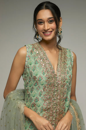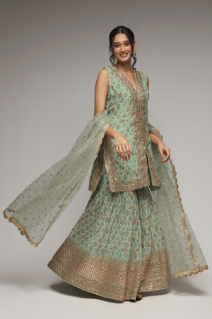 • Featuring a nusrat sleeveless sharara set in a sophisticated toned down hue, is embellished in gota that adds shimmer to the outfit.