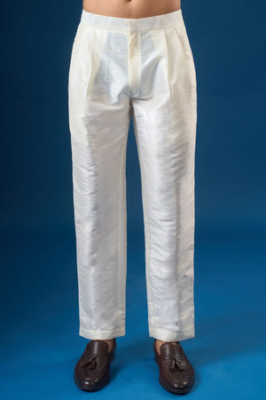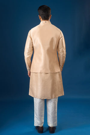 • Peach raw silk based jacket enhanced with mirror and thread embroidery, paired with a matching dupion silk based kurta enhanced with matching embroidered hem, and off white dupion silk based pants.
