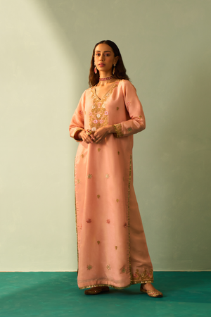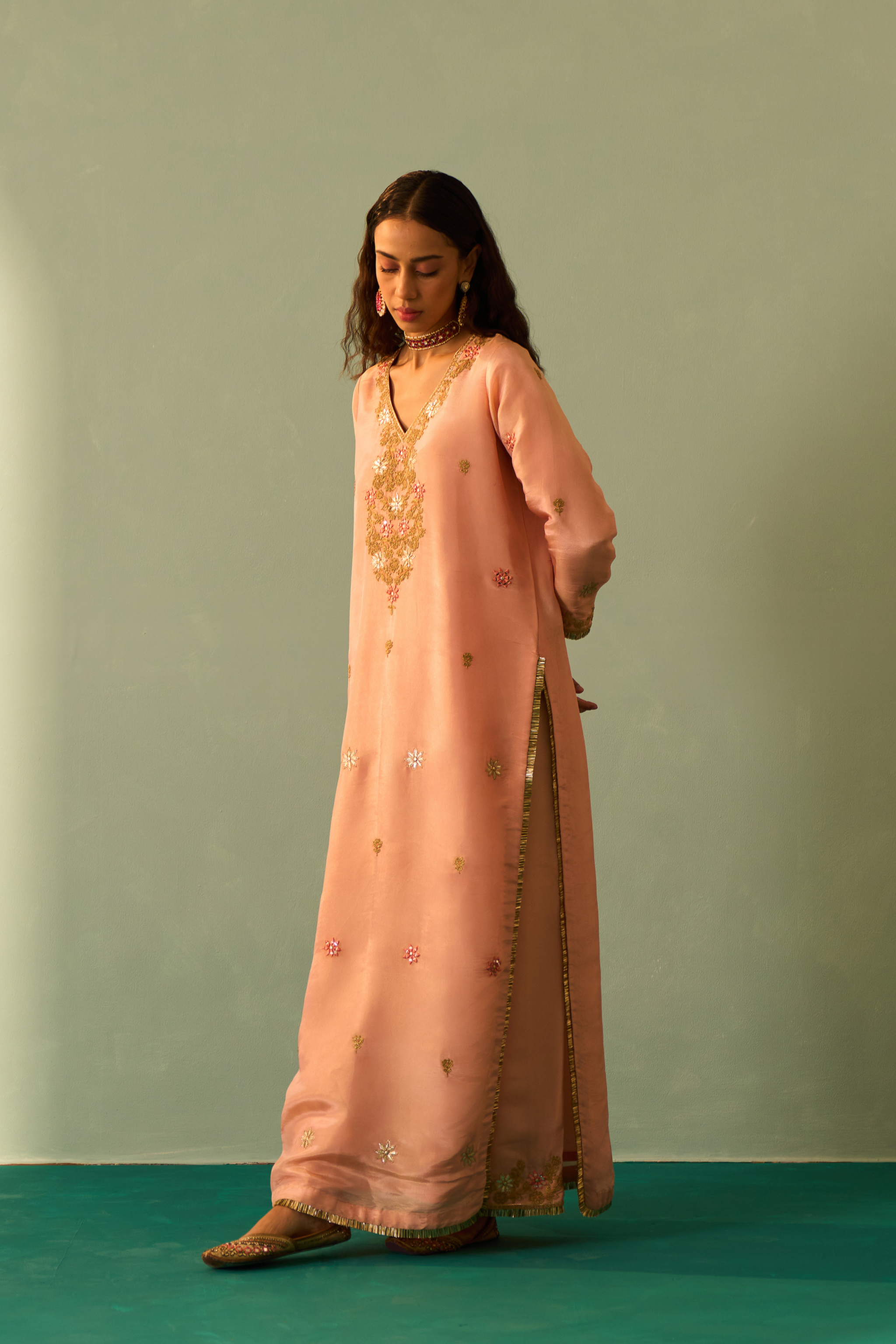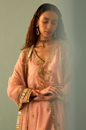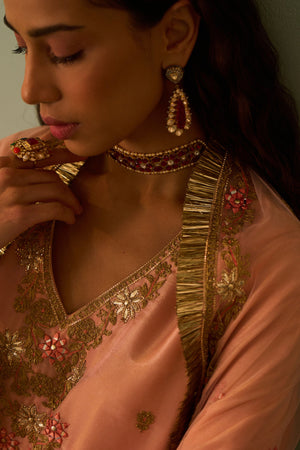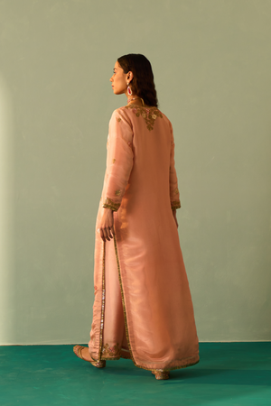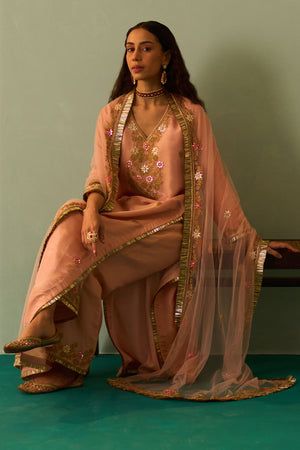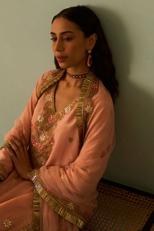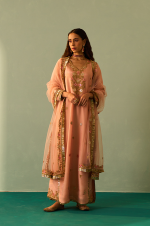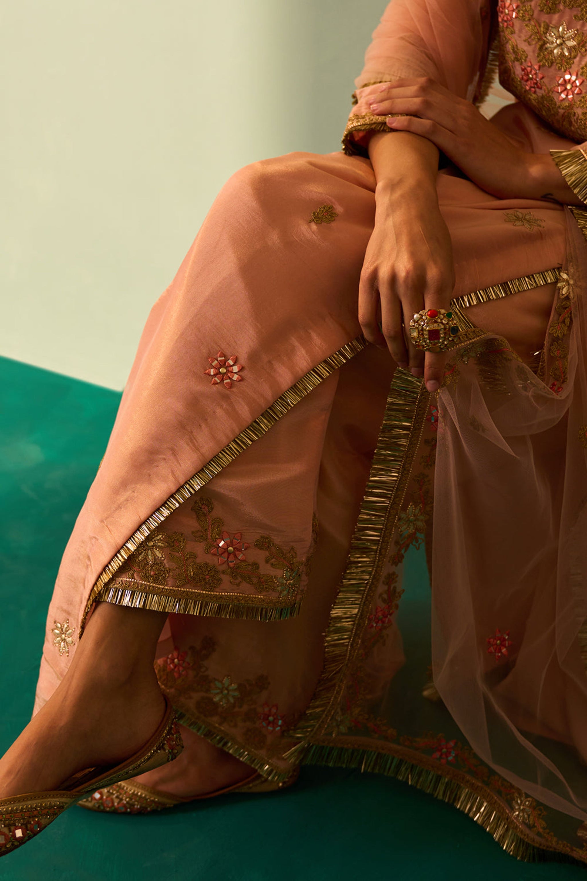 • A Peach tissu choga set paired with palazzo pants and dupatta embroidered with kasab and encrusted in peach thread highlighted with mirror and gotta patti.