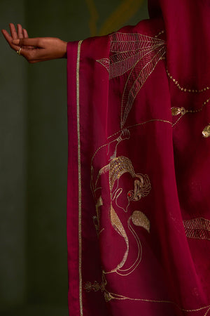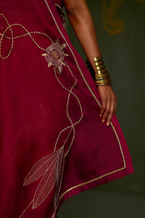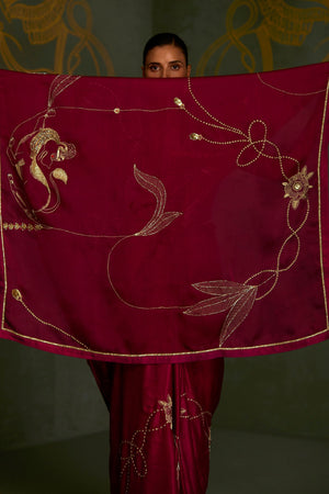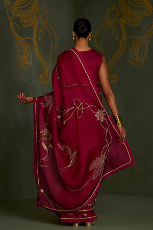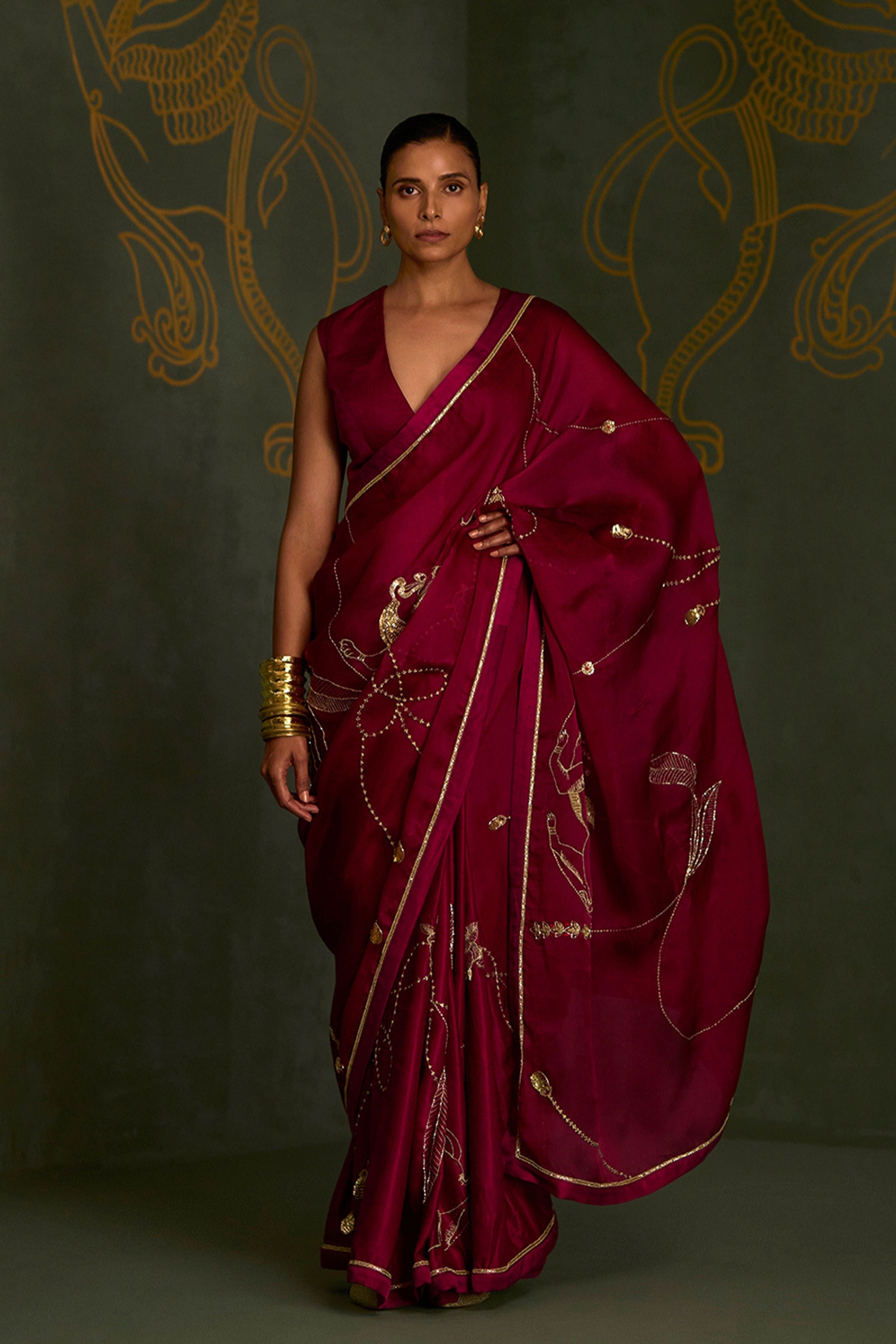 • Crafted in luxurious gajji silk with a sheer organza pallu, this hand-embroidered saree exudes timeless elegance. Detailed with intricate dabka, naqshi and resham work, it is paired with a matching deep v-neck blouse for a contemporary yet classic appeal.
